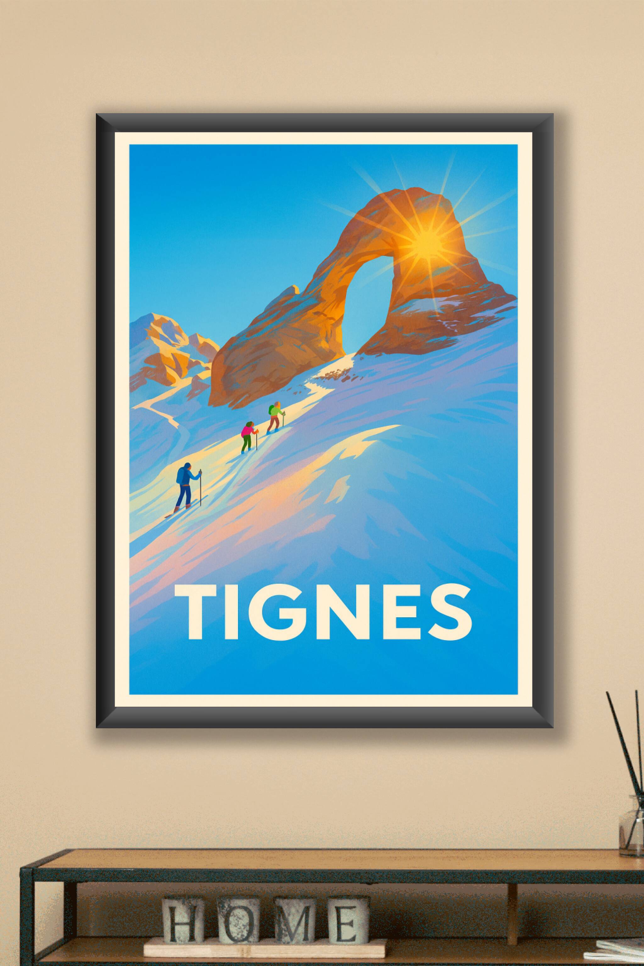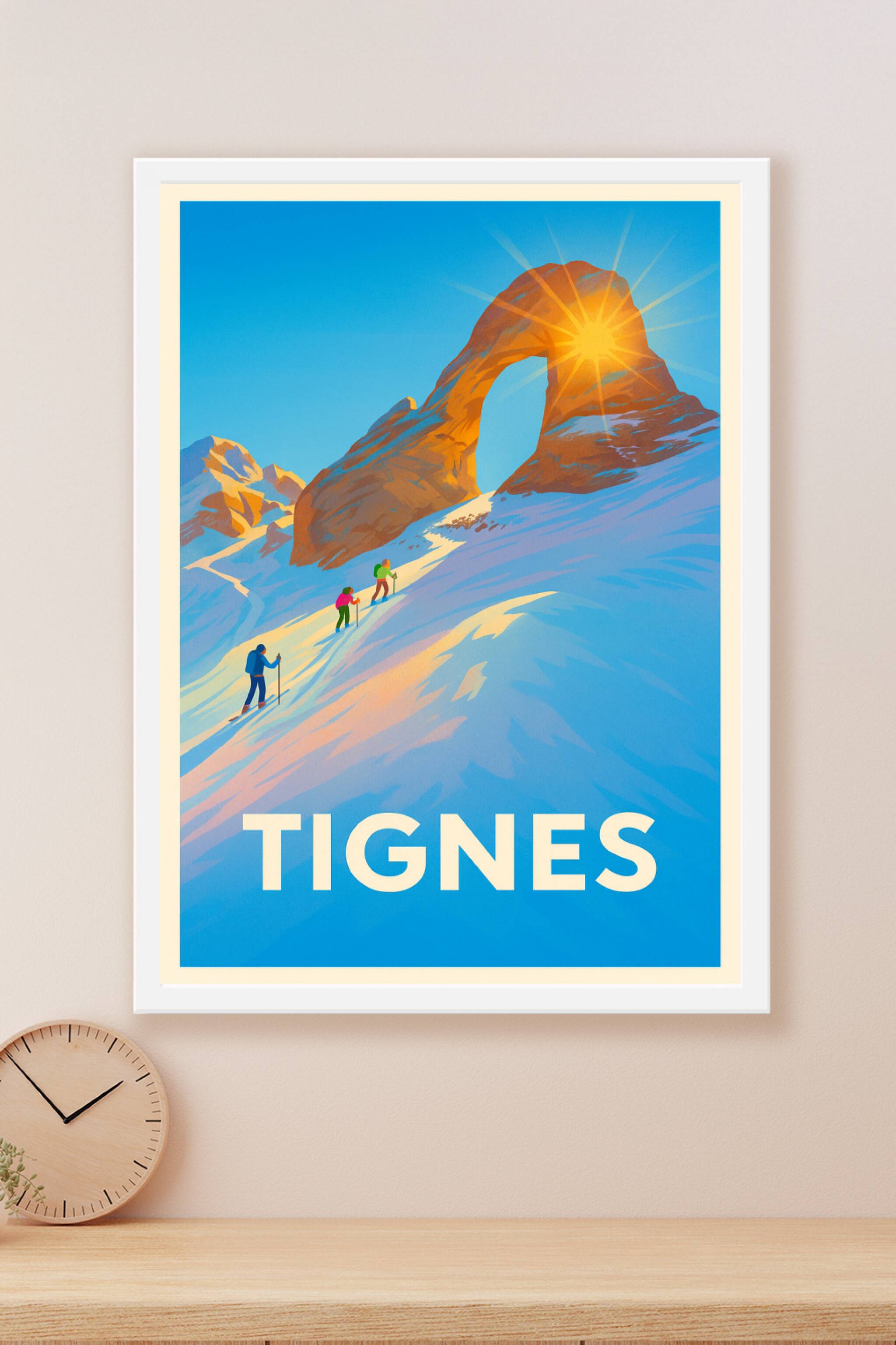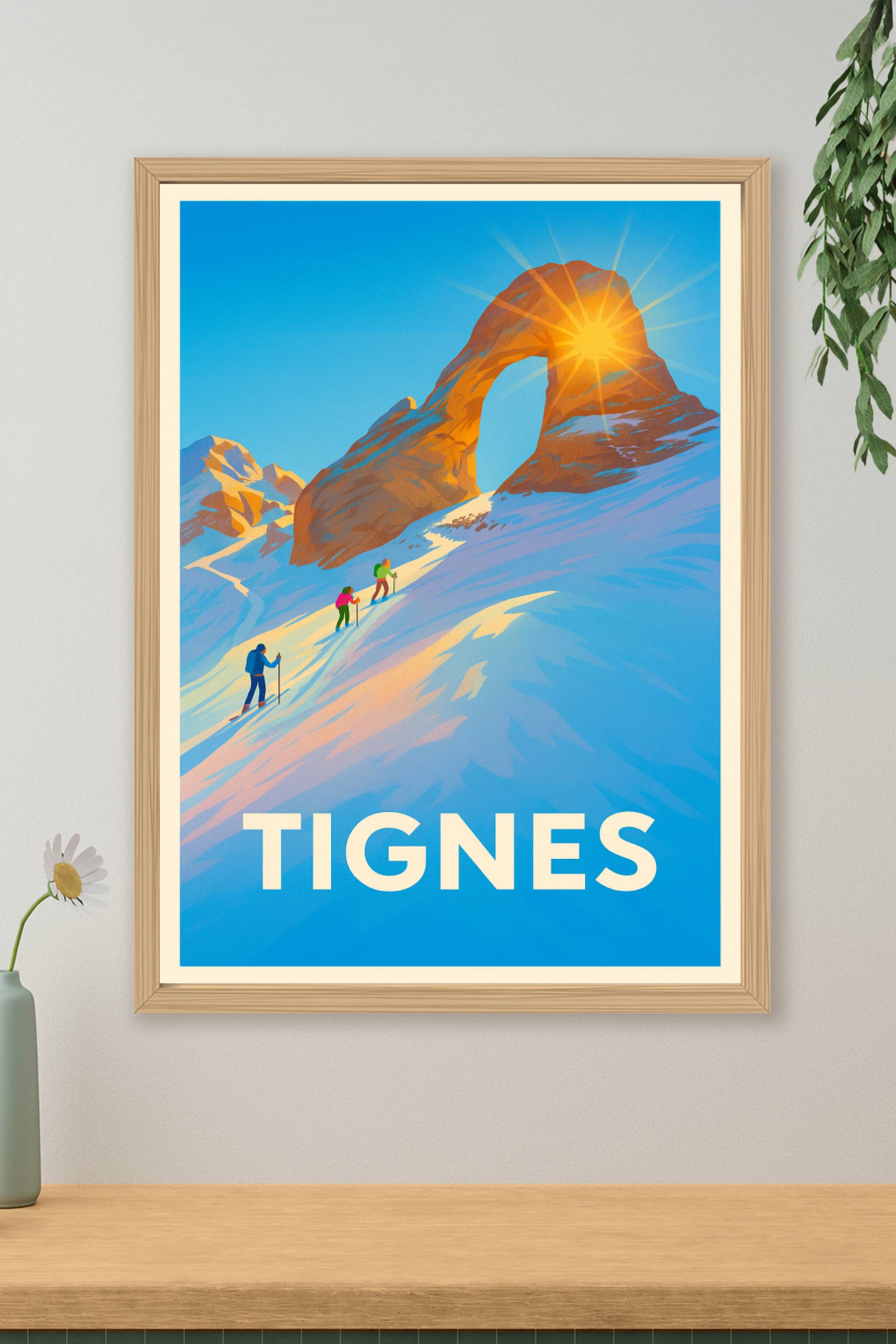 Imprégnez-vous de la beauté alpine et de la lumière éclatante de Tignes avec cette affiche vintage représentant des skieurs s'aventurant vers une arche rocheuse emblématique. Ce poster capture l'essence pure et magique des paysages enneigés, parfait pour les passionnés de montagne et d'aventures hivernales.Cette affiche est imprimée en tirage "Fine Art" sur papier 305g coton pour une qualité d'impression supérieure et une longévité assurée. Disponible en formats A1 à A4, avec ou sans cadre, elle apportera une touche de fraîcheur et d'évasion à votre décoration intérieure. Fabriquée avec soin en France, cette affiche est idéale pour offrir ou pour sublimer votre intérieur avec un souvenir authentique de la montagne.