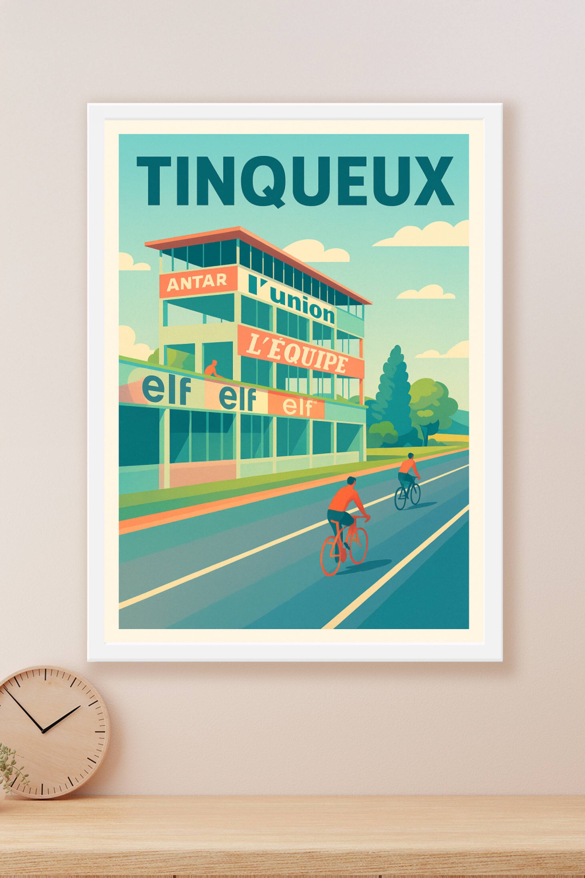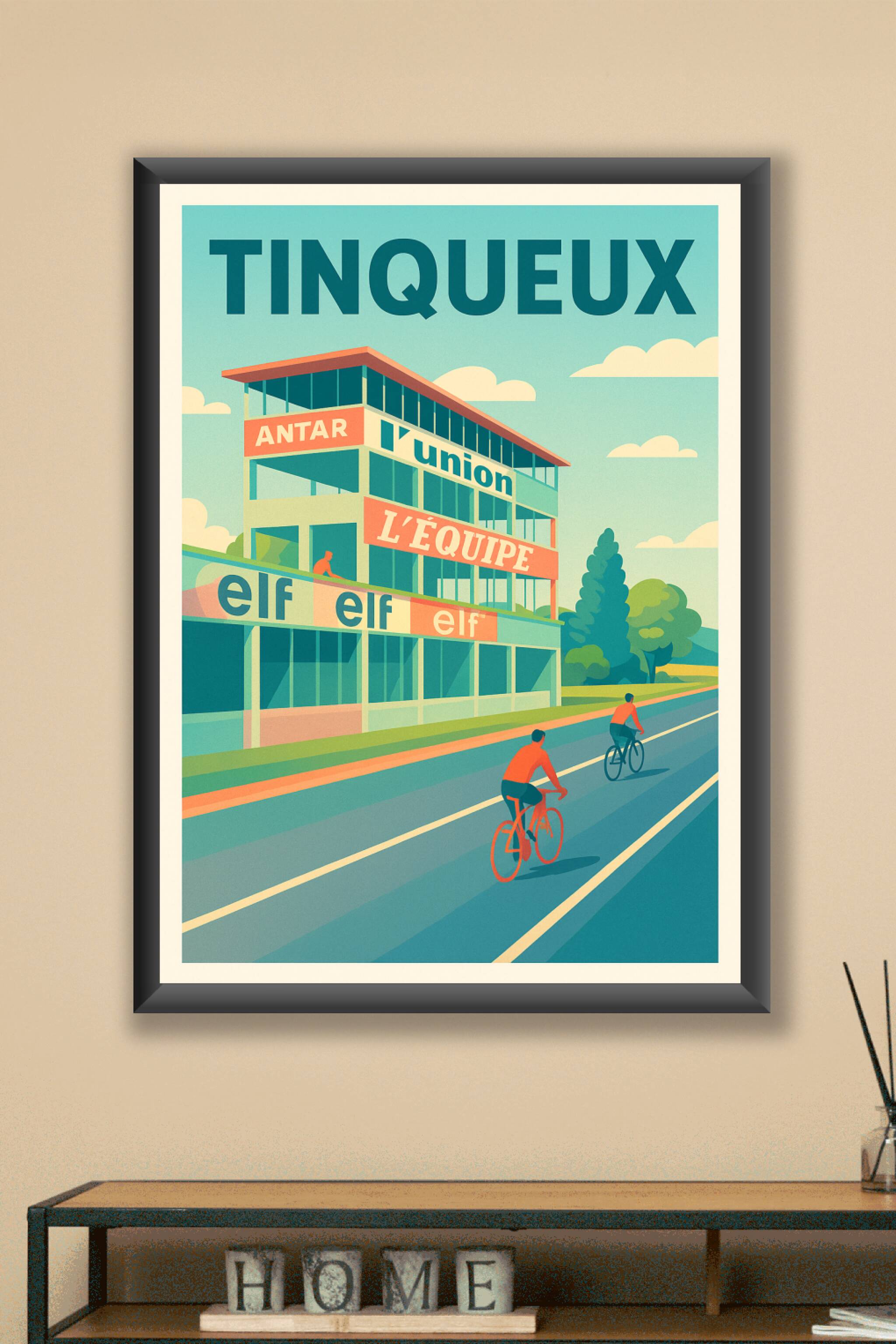Découvrez l'affiche Tinqueux qui capture avec finesse l'ambiance vintage d'une piste cycliste emblématique. Ce poster au style rétro met en scène des cyclistes sur une route où se dessinent les enseignes historiques comme Antar, L'Équipe et Elf. Parfait pour les passionnés de sports et de design graphique, cette affiche s'intègre avec élégance dans tout intérieur. Disponible en tirage Fine Art sur papier coton 305g de haute qualité, elle garantit une impression nette et durable. Choisissez parmi les formats A1 à A4, avec ou sans cadre, pour habiller vos murs d'un souvenir unique, 100% fabriqué en France et prêt à sublimer votre décoration.