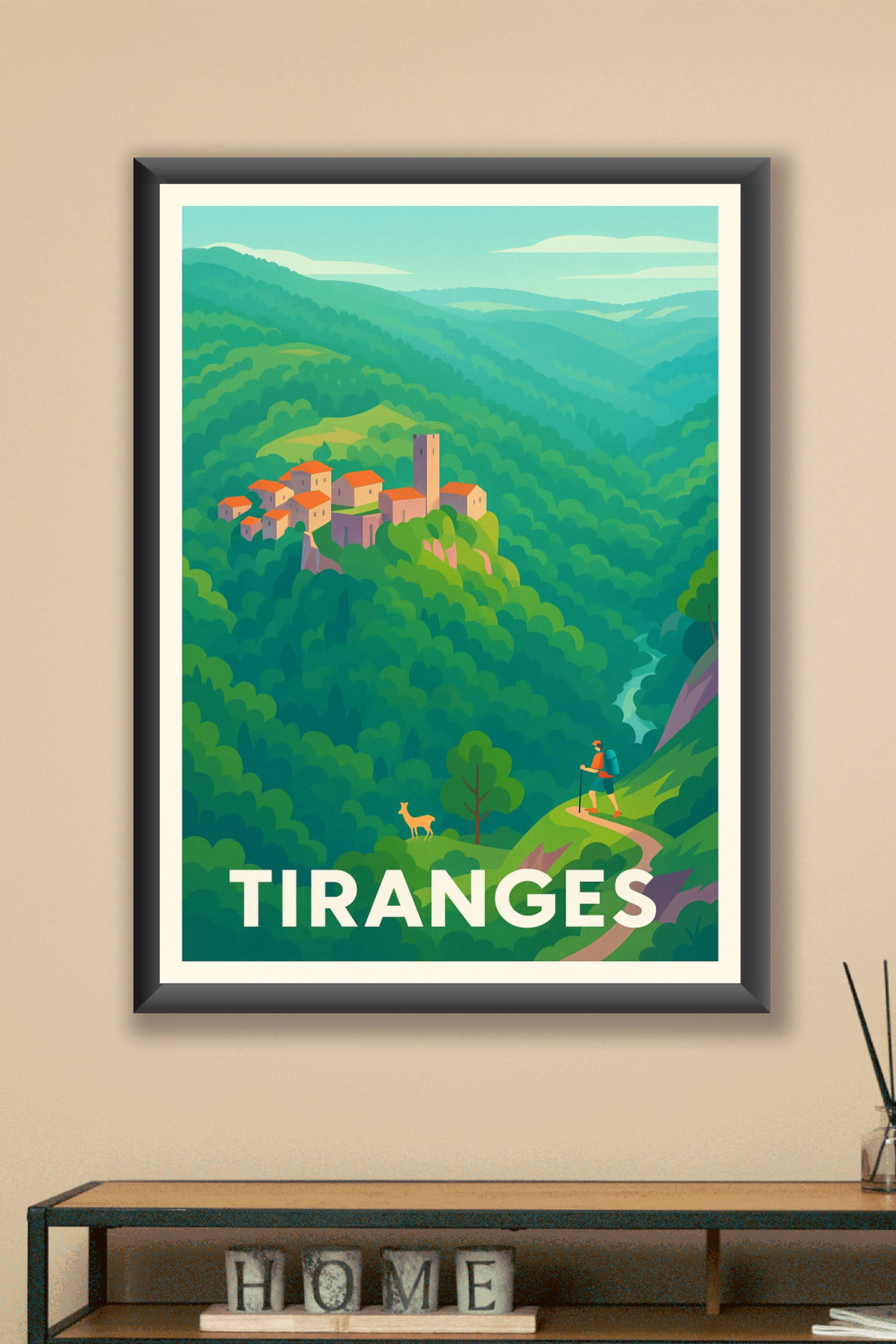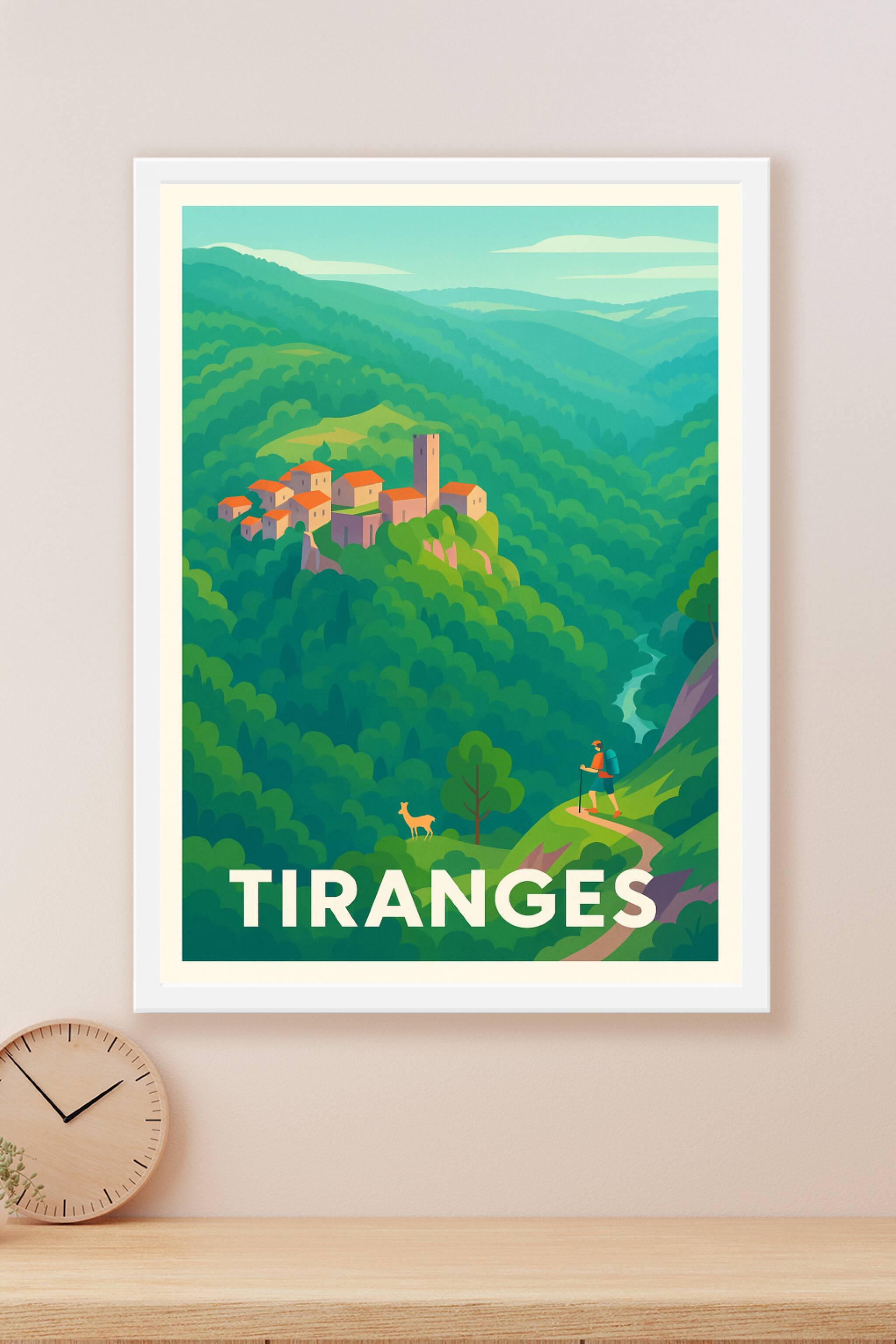 Évadez-vous au cœur des magnifiques paysages de Tiranges avec cette affiche au style rétro-vintage qui célèbre la nature luxuriante et la vie paisi...