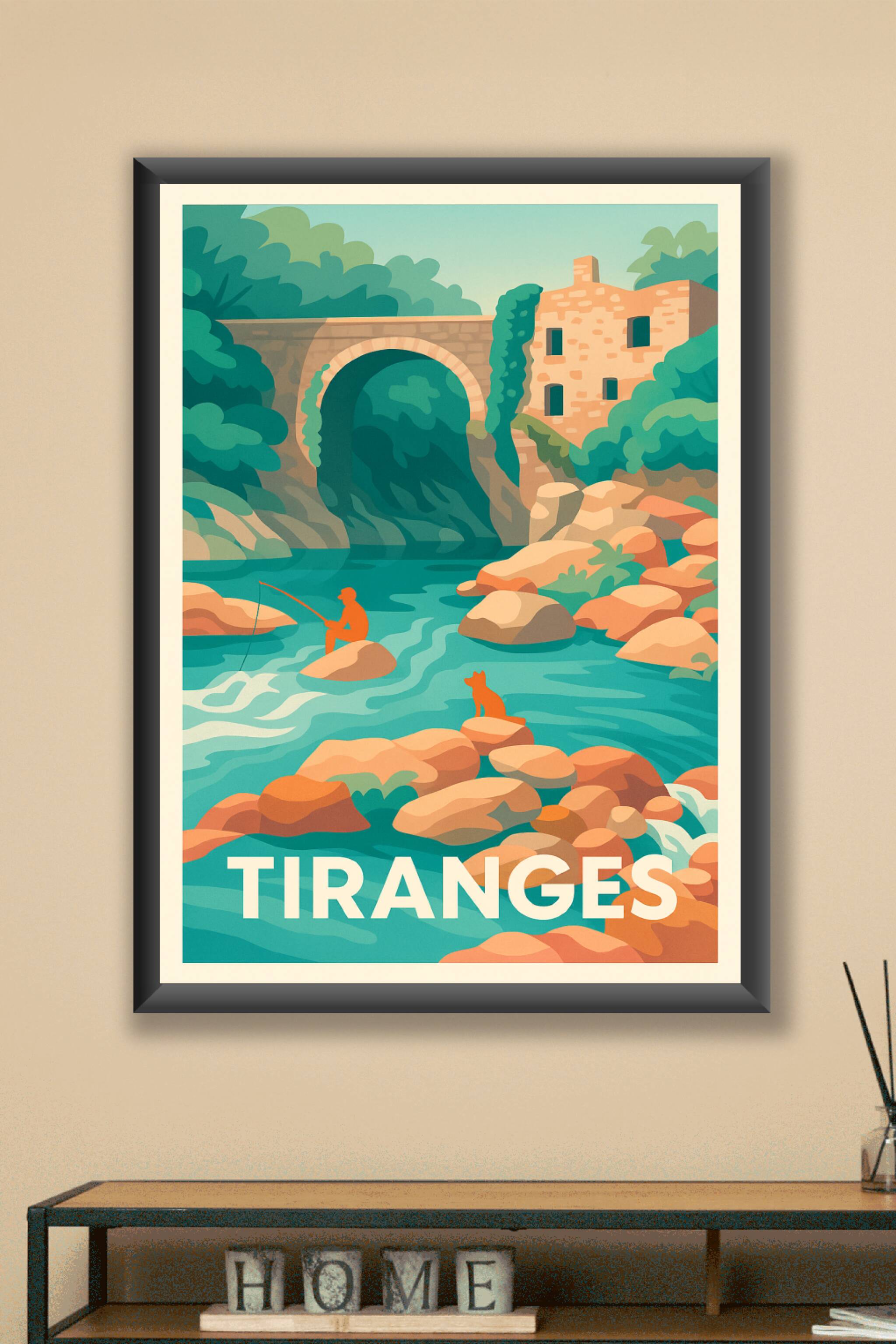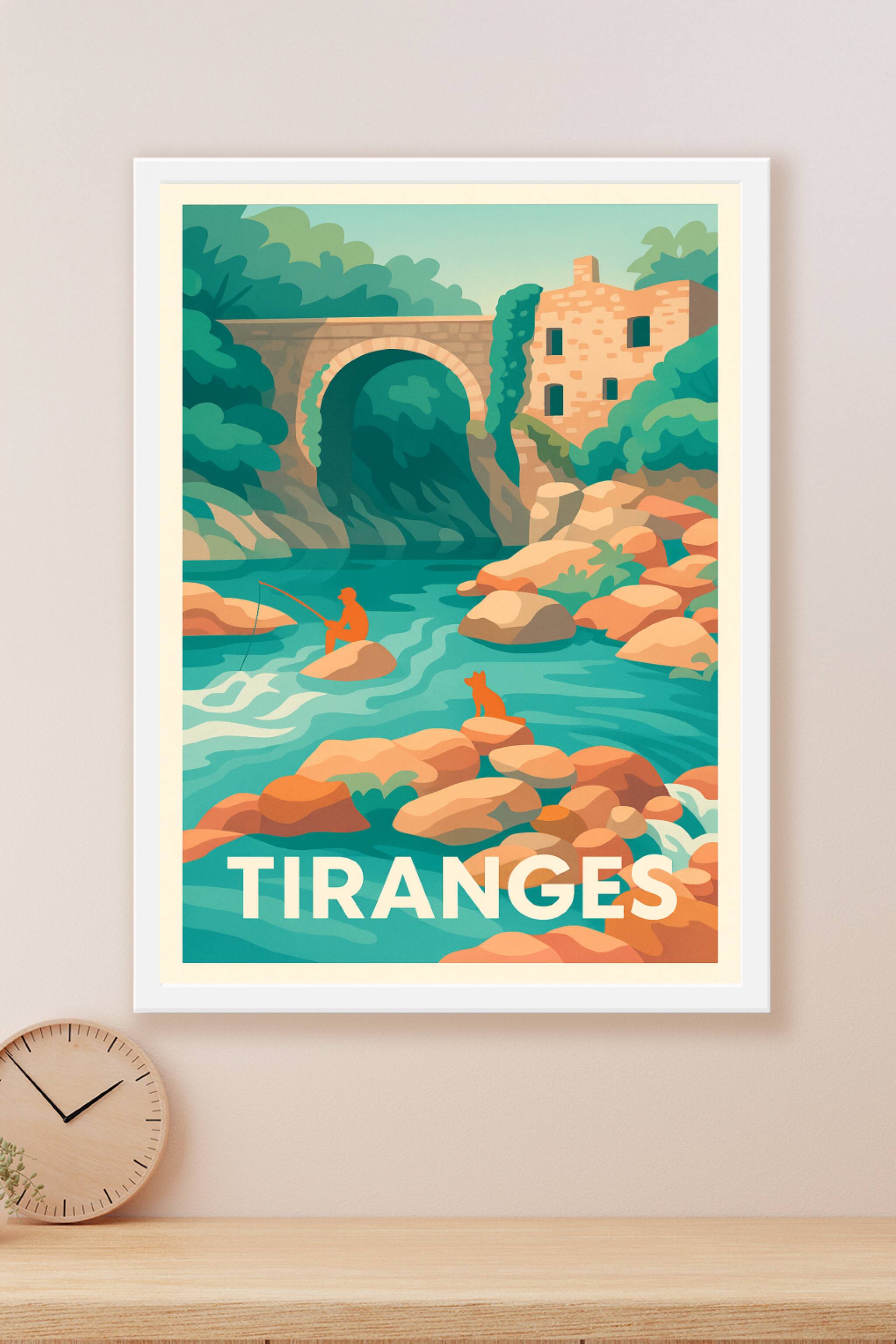 Évadez-vous au cœur de la nature avec cette affiche illustrant une scène paisible de pêche au bord de la rivière à Tiranges. Le pont en pierre et l...