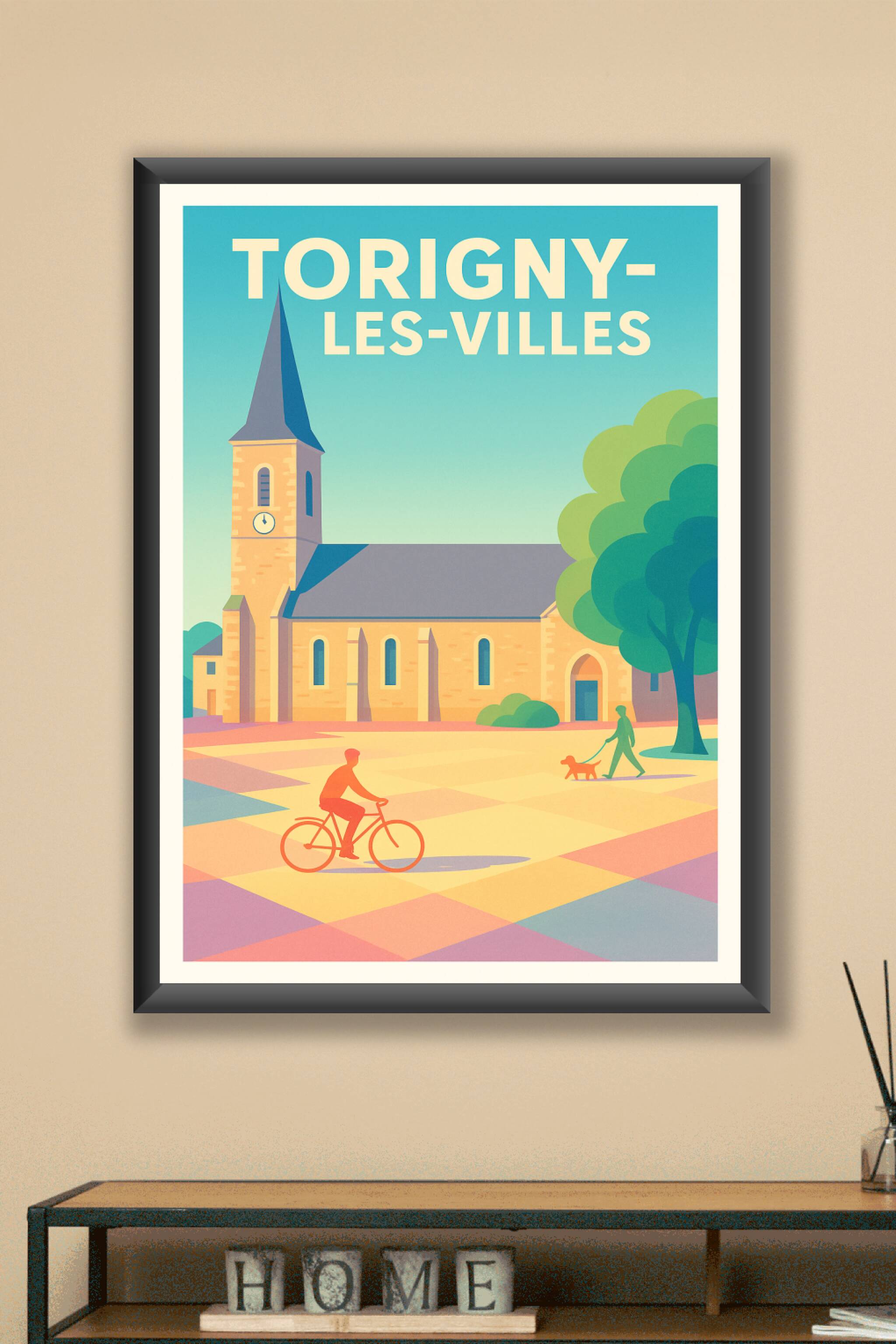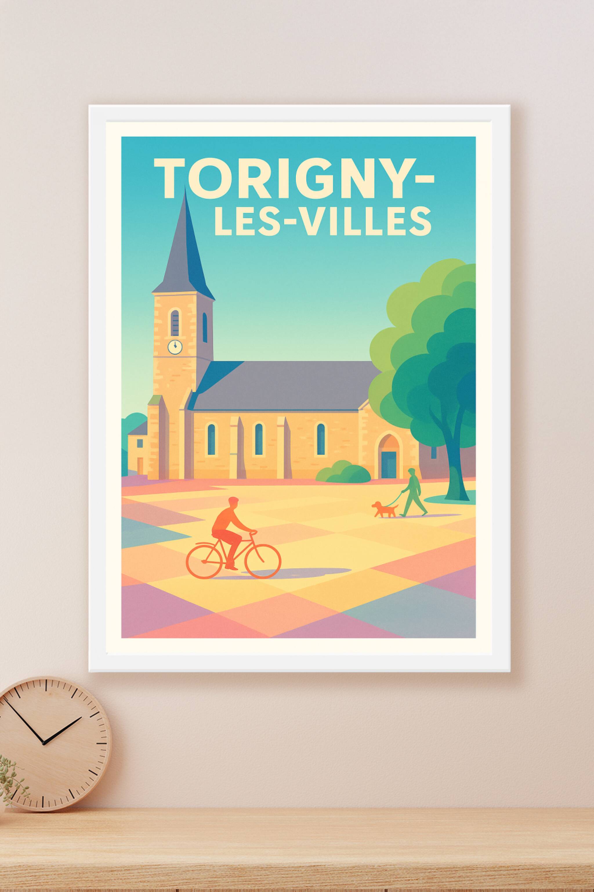 Découvrez l'atmosphère sereine et lumineuse de Torigny-les-Villes capturée dans cette affiche illustrée au style rétro doux et coloré. Le poster me...