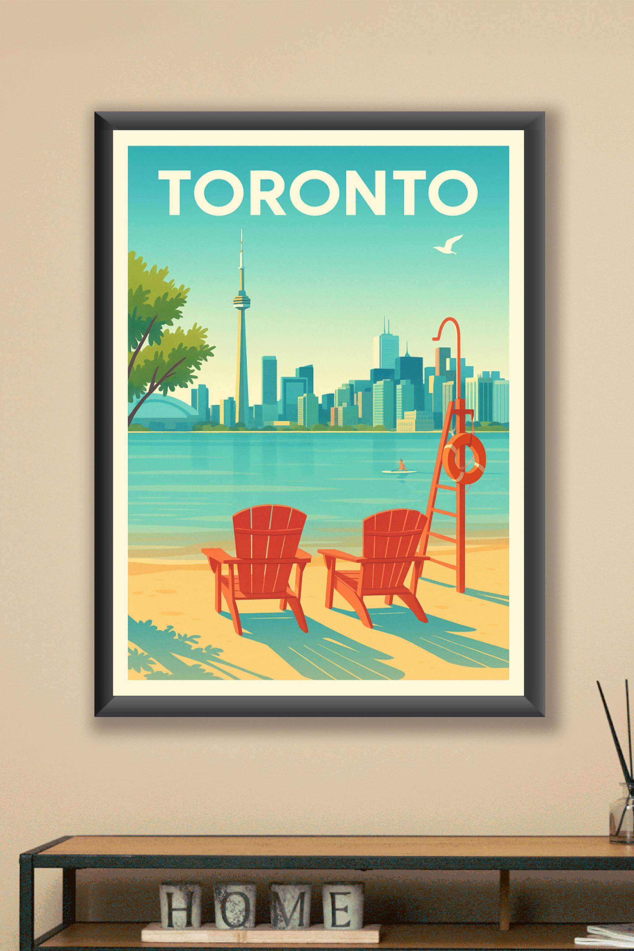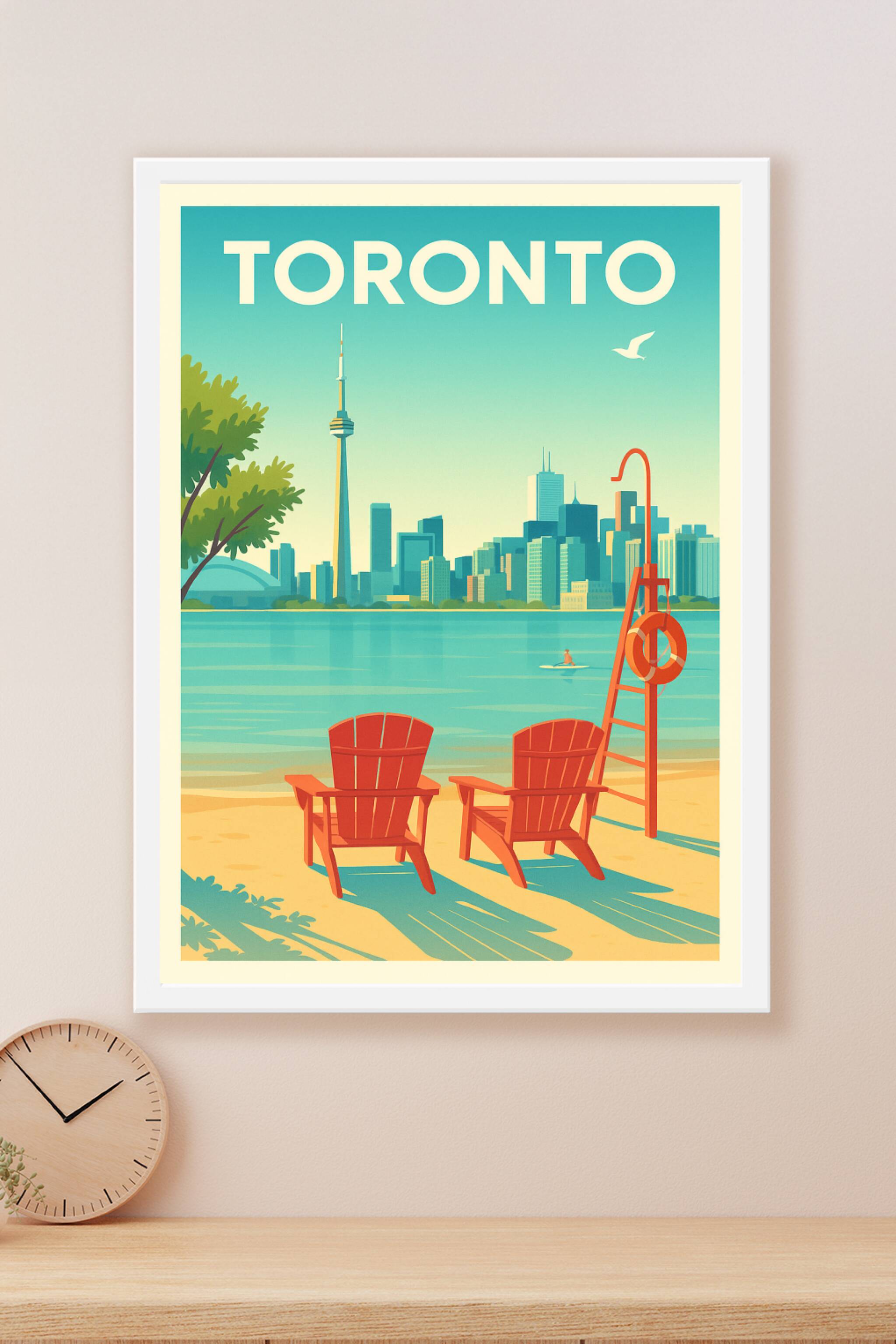 Découvrez la sérénité d'une plage urbaine avec ce poster illustré de Toronto, mettant en scène deux chaises Adirondack rouges face à la skyline emb...