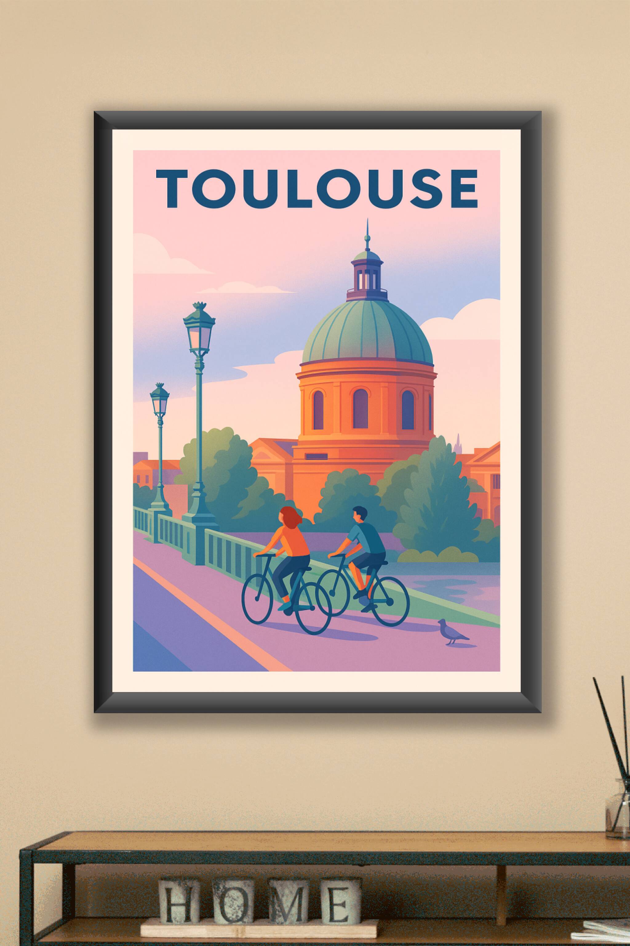 Apportez une touche de douceur et de sérénité à votre décoration avec cette affiche illustrant Toulouse sous un ciel pastel. On y découvre un couple à vélo le long d'une passerelle, avec en toile de fond le célèbre dôme vert qui illumine la Ville Rose. Ce poster en tirage "Fine Art" est imprimé sur un papier 305g coton de haute qualité, garantissant des couleurs vibrantes et une longévité exceptionnelle. Disponible du format A1 à A4, avec ou sans cadre, cette affiche se prête parfaitement à toute pièce à la recherche d'une ambiance détendue et authentique. Profitez d'une impression premium 100% française pour offrir ou embellir votre intérieur avec une œuvre élégante et contemporaine.