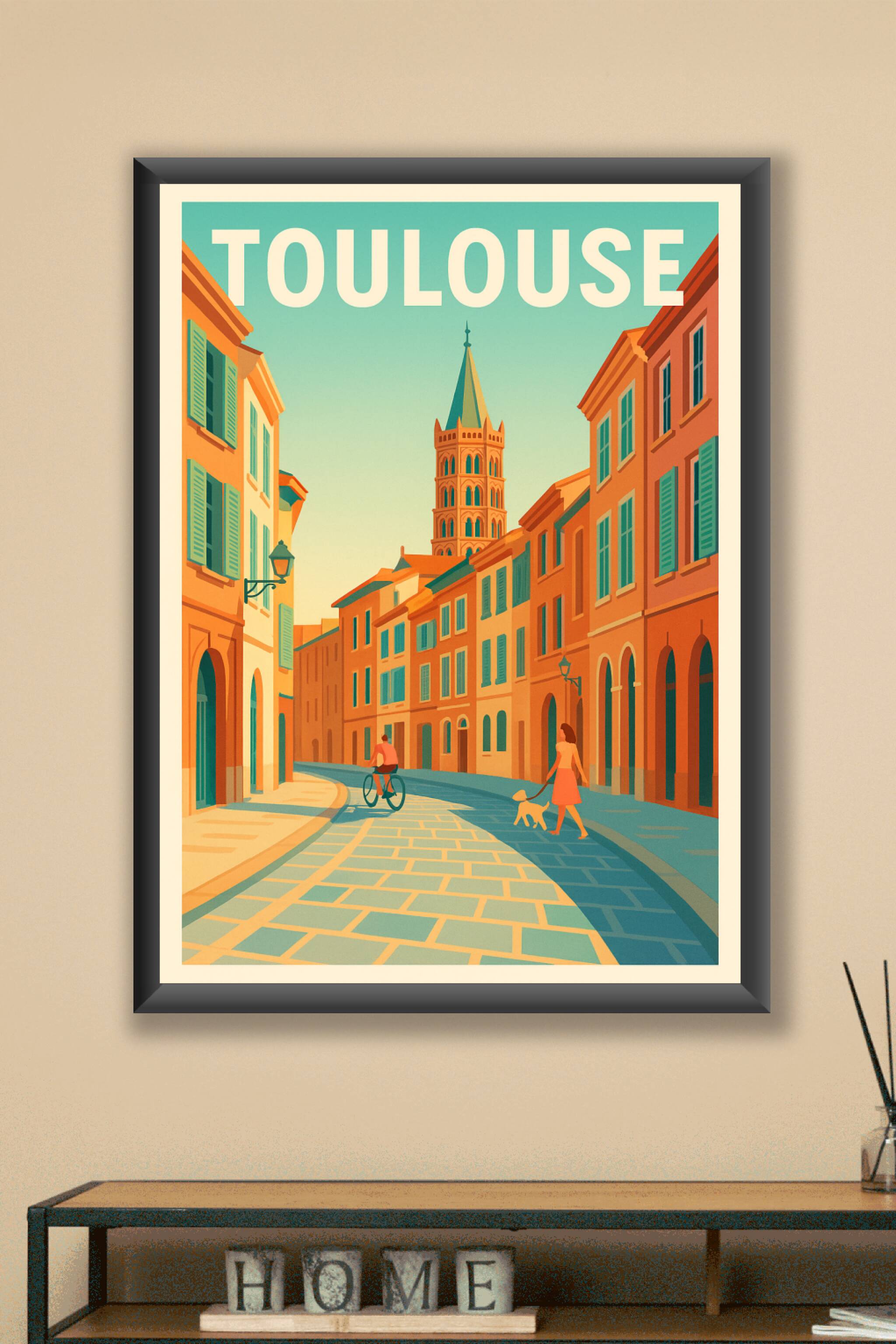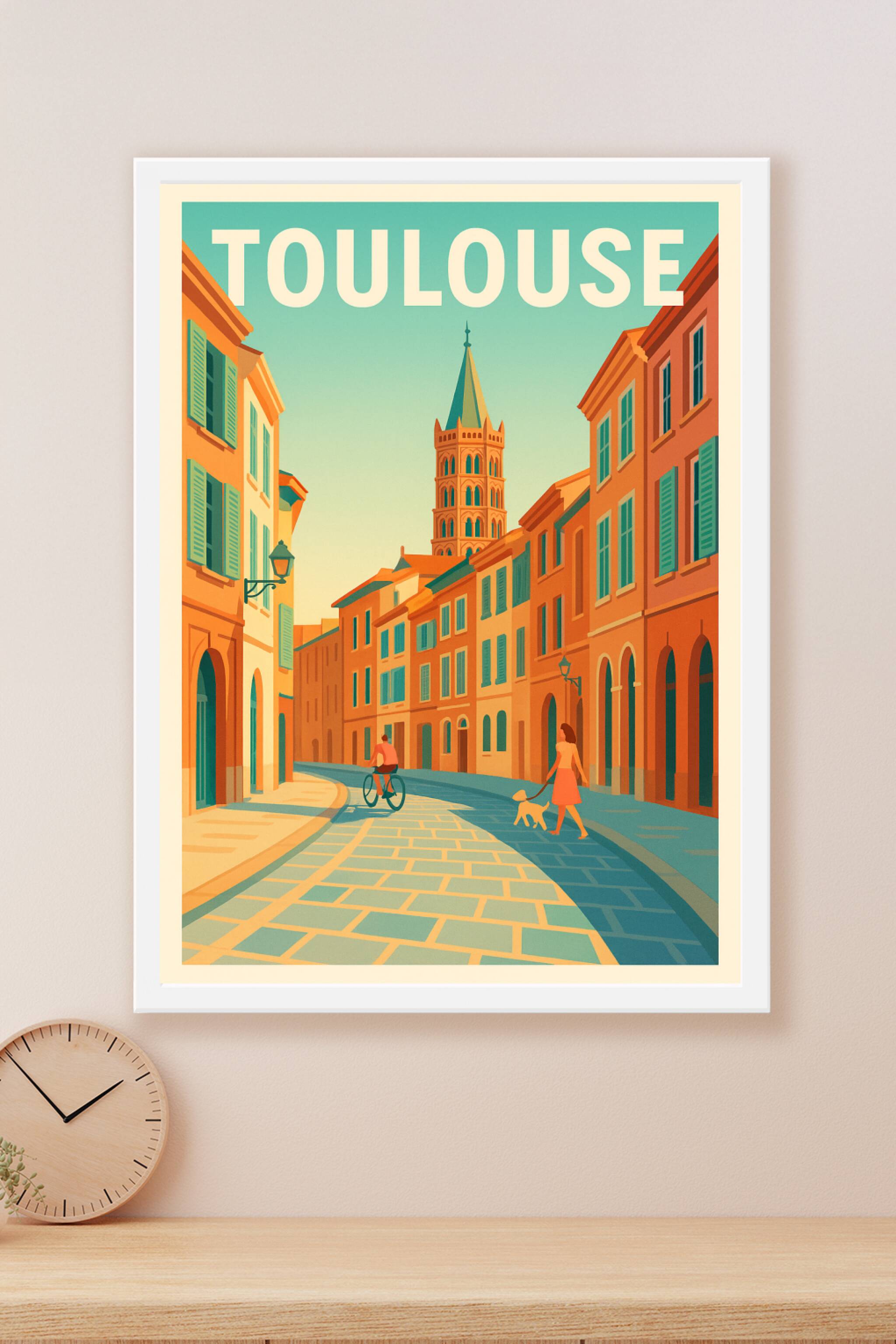 Découvrez le charme authentique de Toulouse avec cette affiche illustrée où les façades ocres et les pavés chaleureux embrassent une scène de vie p...
