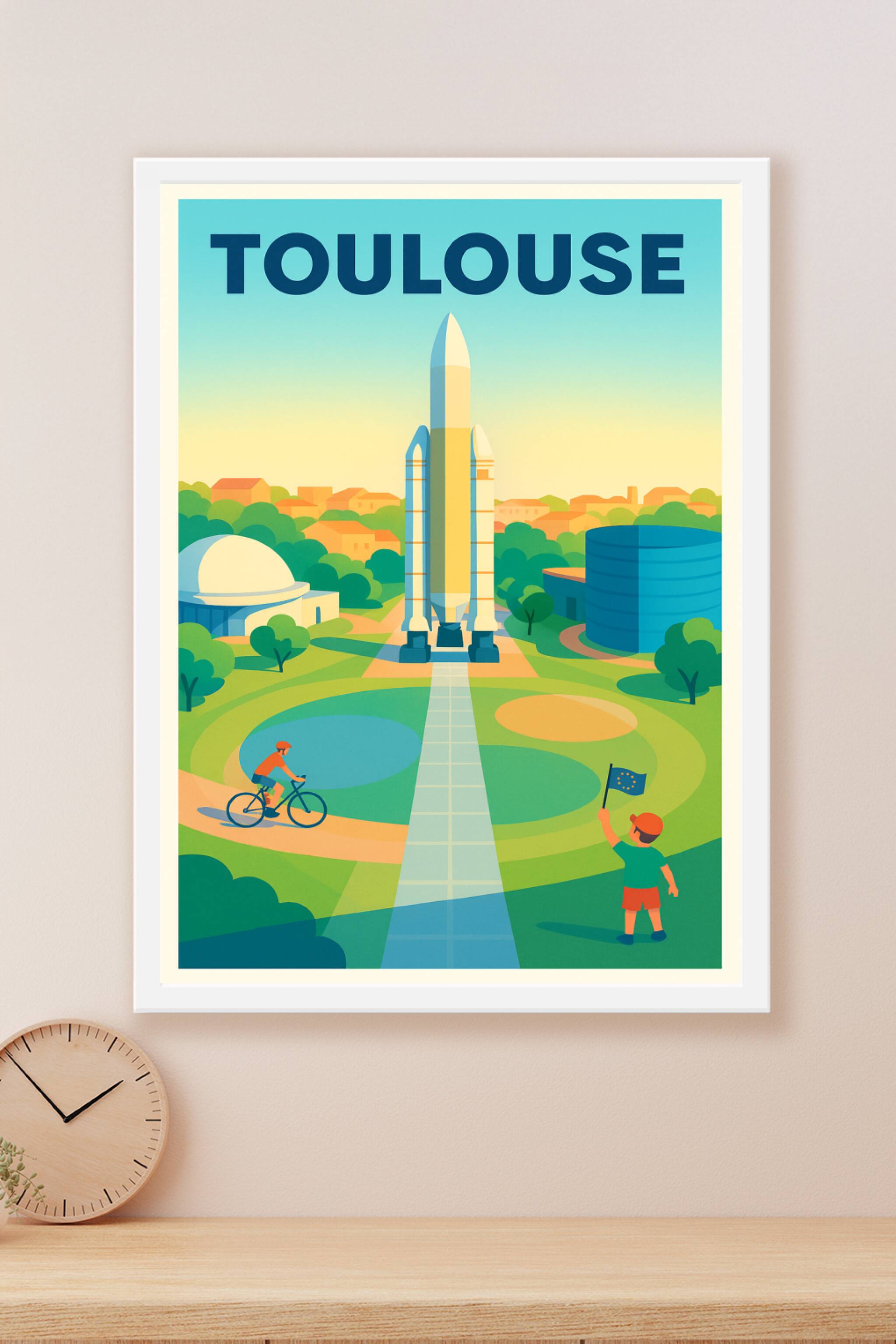 Découvrez Toulouse sous un jour inédit avec ce poster illustré où la nature verdoyante côtoie la modernité symbolisée par la fusée Ariane. Cette af...