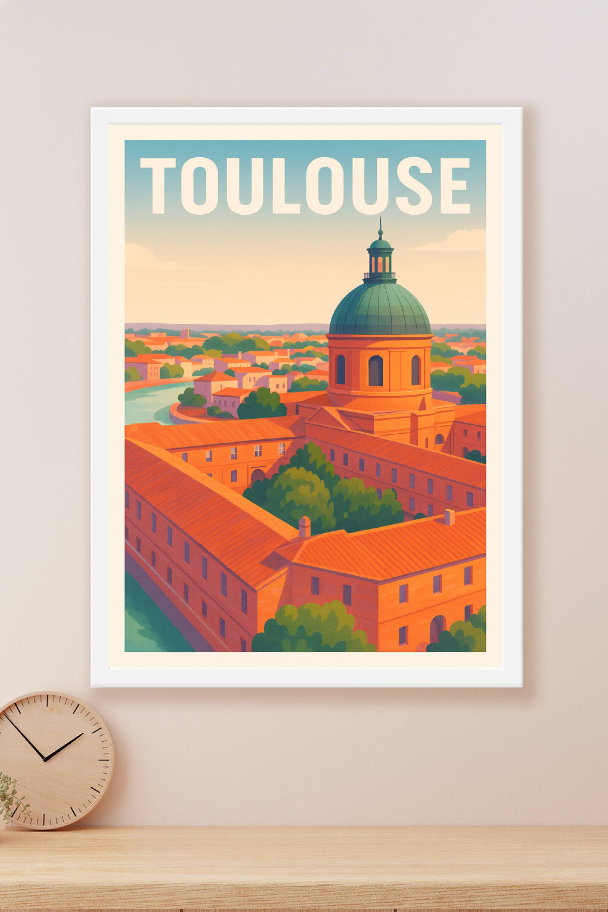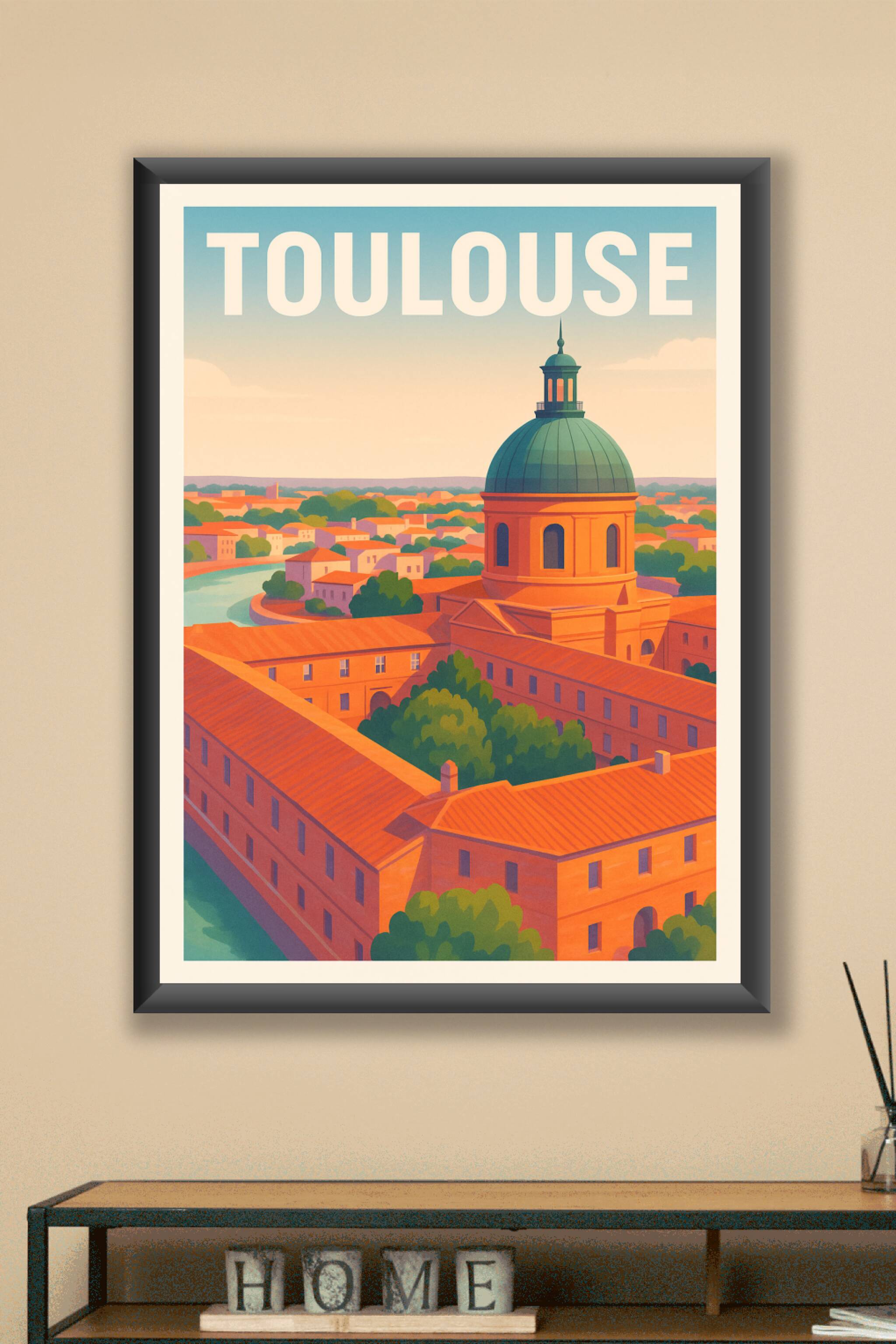 Découvrez le charme architectural et la douceur de vivre toulousaine avec cette affiche illustrée mettant en avant la célèbre coupole et les toits ...