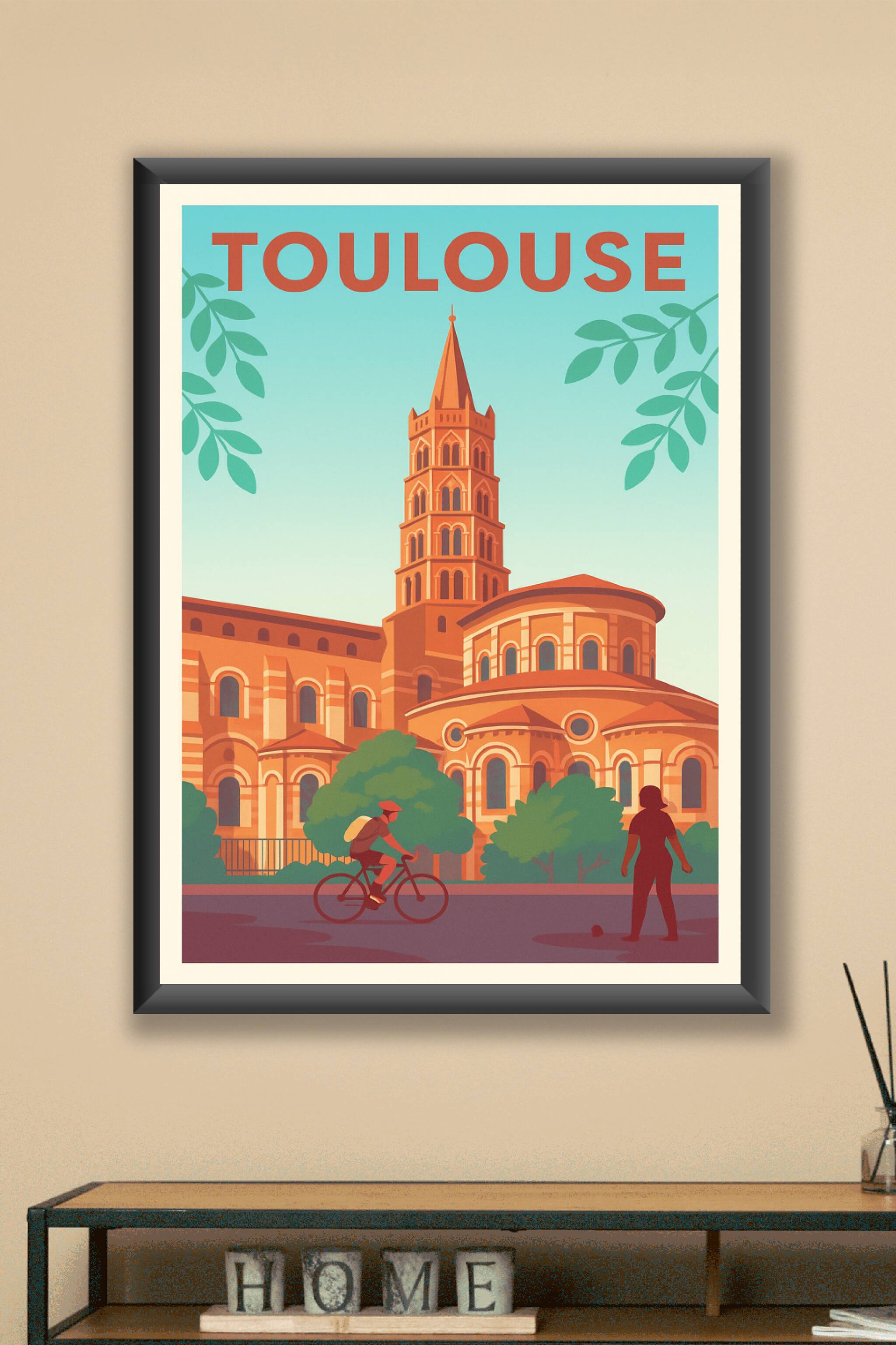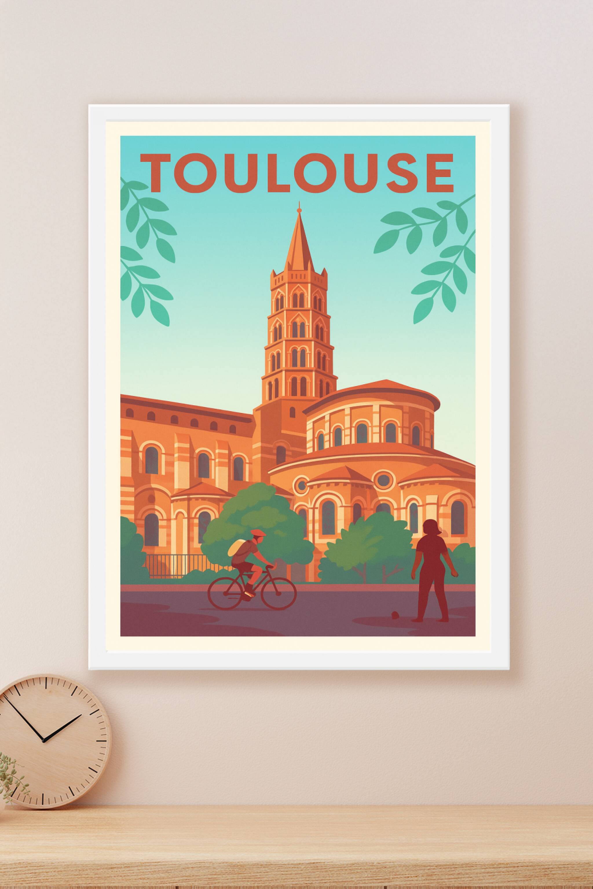 Découvrez la beauté architecturale de Toulouse avec cette affiche illustrée mettant en scène la célèbre Basilique Saint-Sernin, un symbole emblémat...