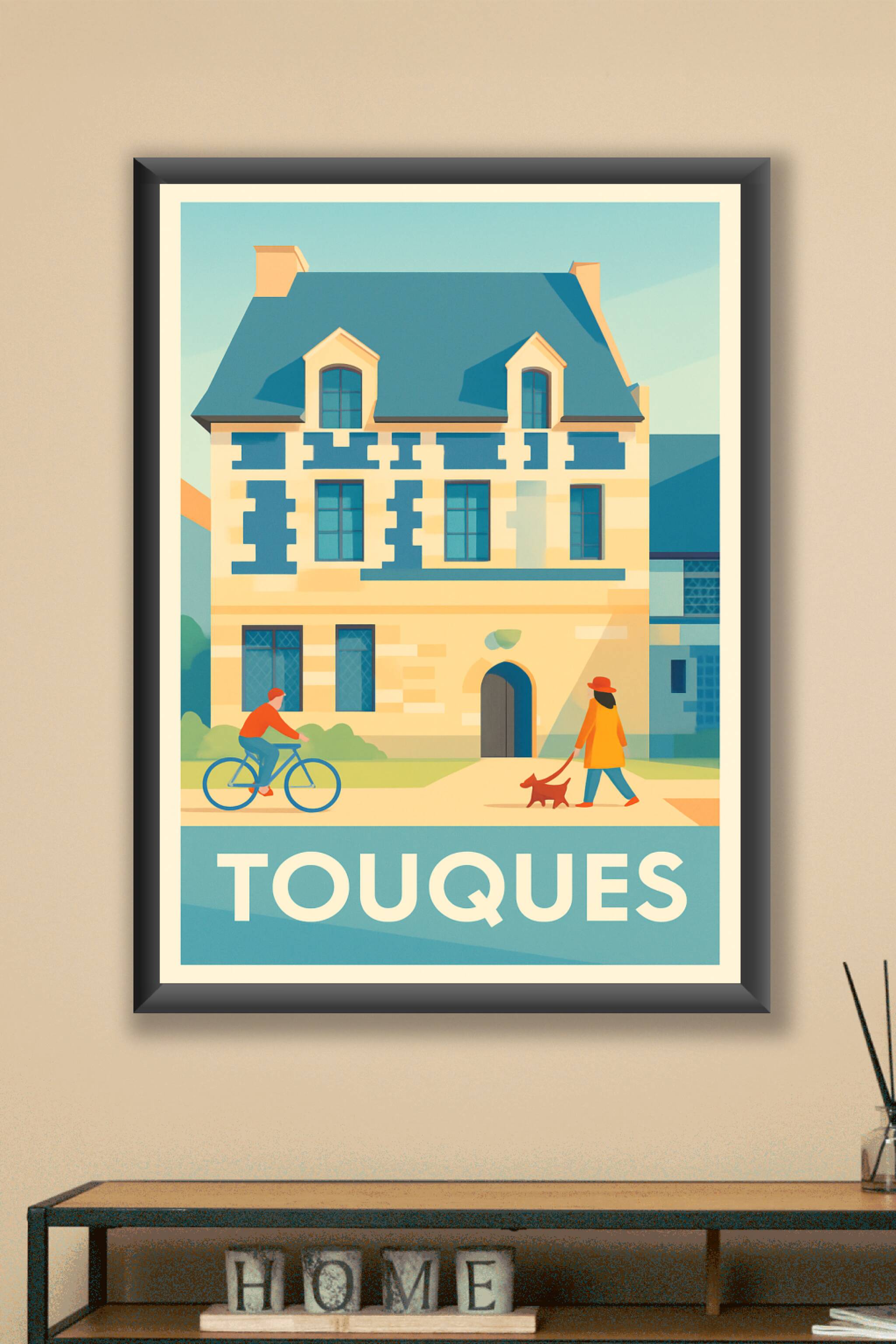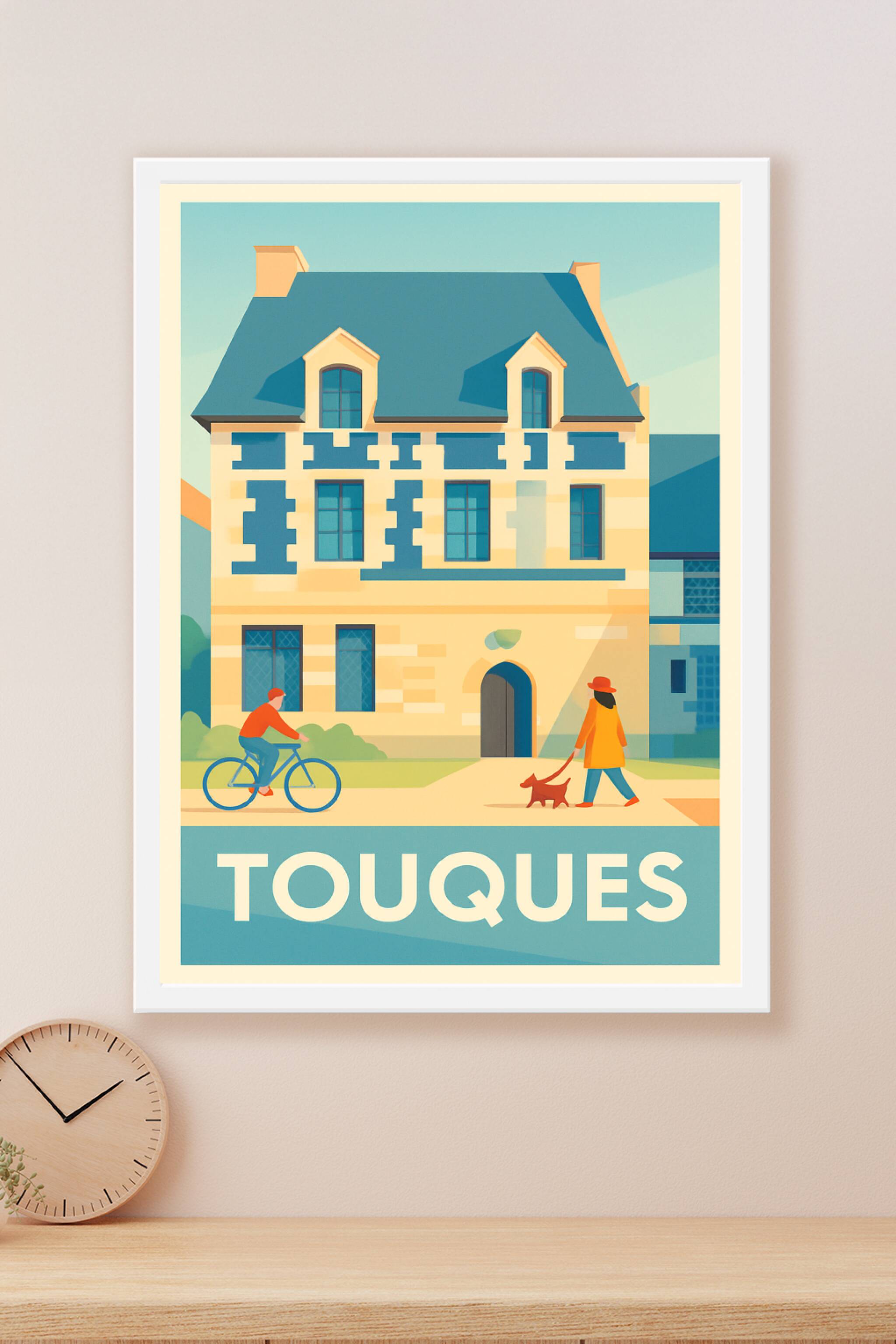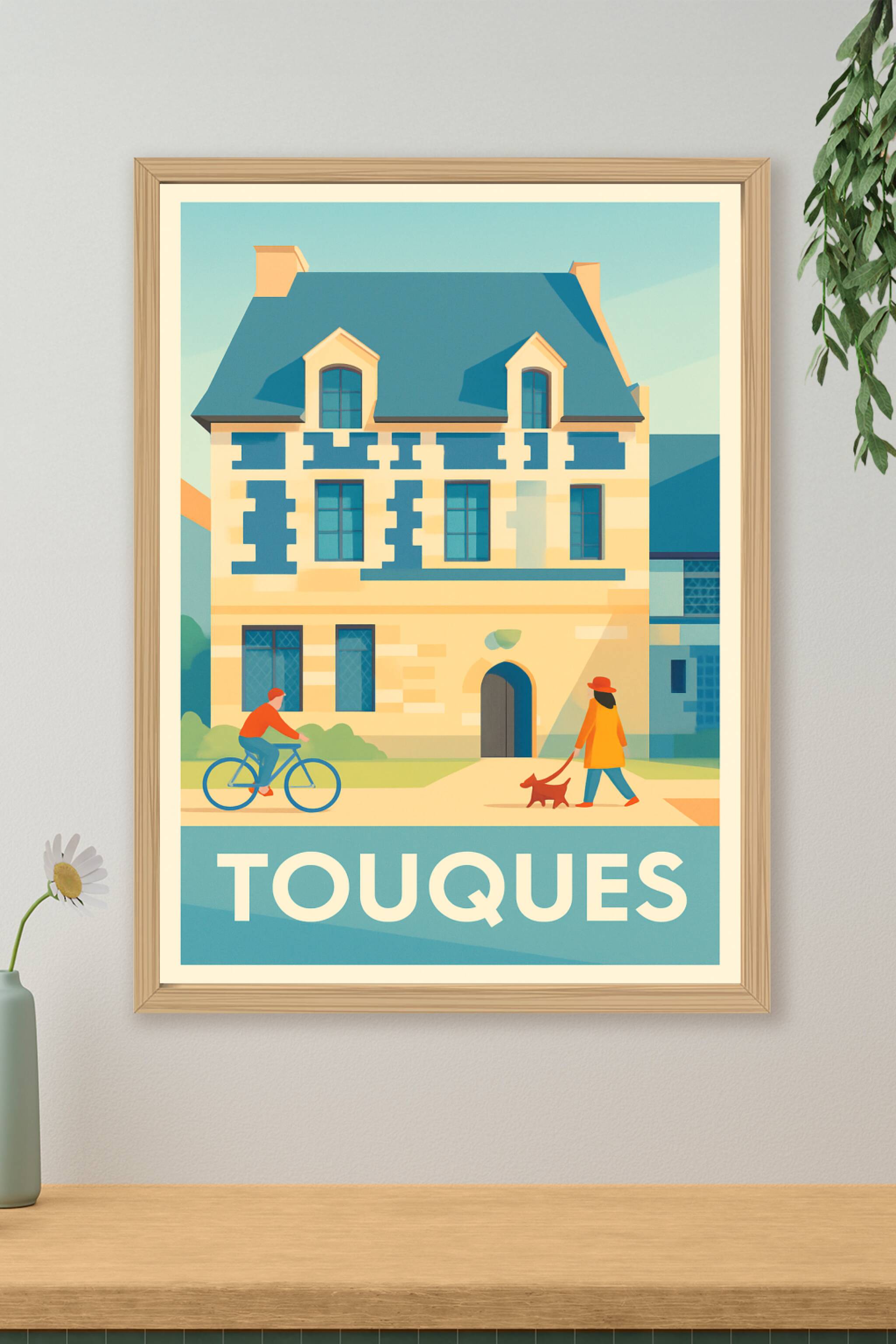 Découvrez le charme authentique de Touques à travers cette affiche au style vintage et épuré. Représentant une maison typique de la ville avec ses nuances chaleureuses, cette illustration invite à la détente et à la promenade, symbolisée par un cycliste et une promeneuse avec son chien.Ce poster est imprimé en tirage "Fine Art" sur papier 305g coton, garantissant une qualité d'impression exceptionnelle et une fidélité parfaite des couleurs. Disponible en formats A1 à A4, avec ou sans cadre, cette affiche apportera une touche élégante et apaisante à votre décoration intérieure. Profitez d'une finition premium, 100% fabriquée en France, idéale pour offrir ou embellir votre espace de vie.