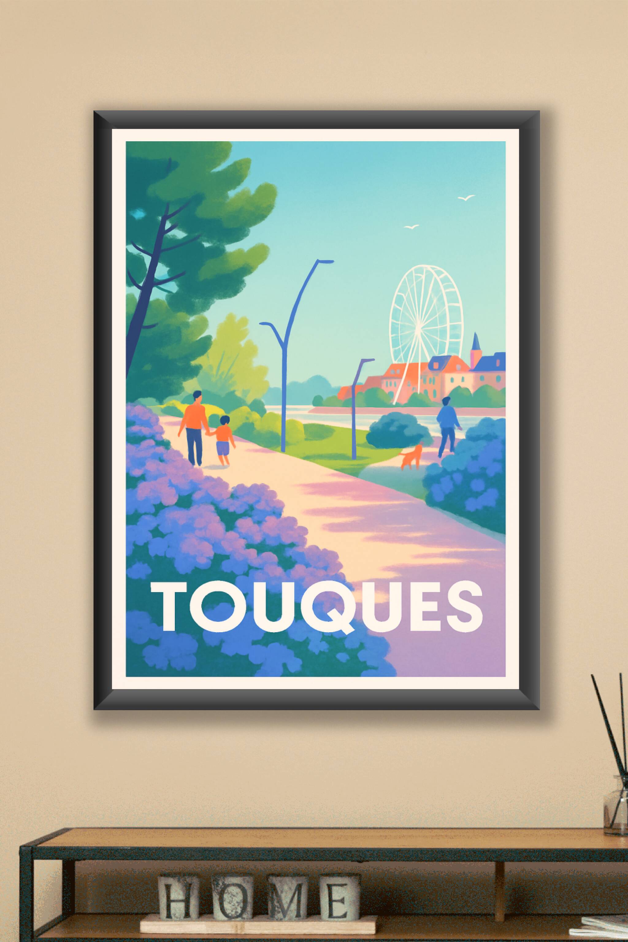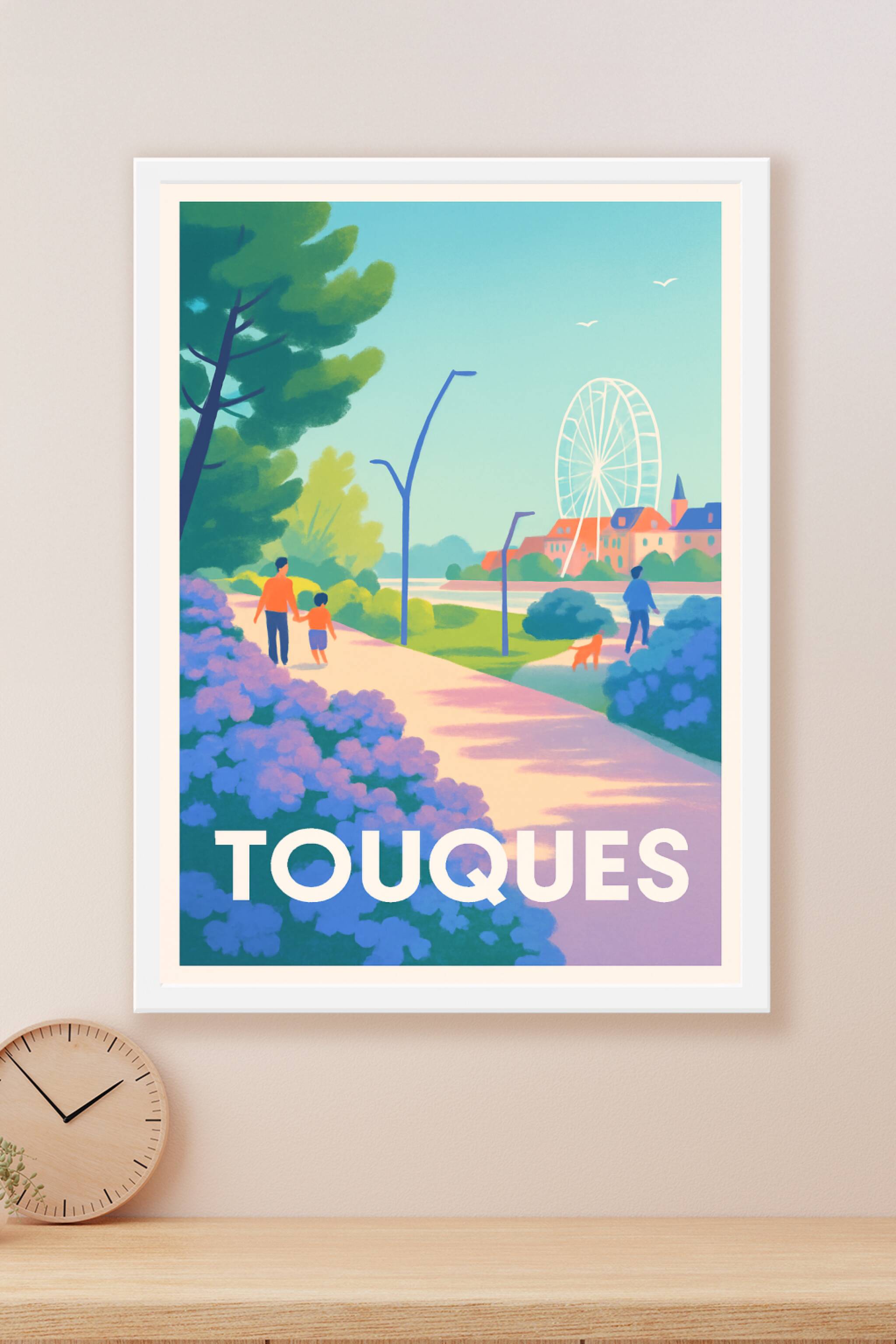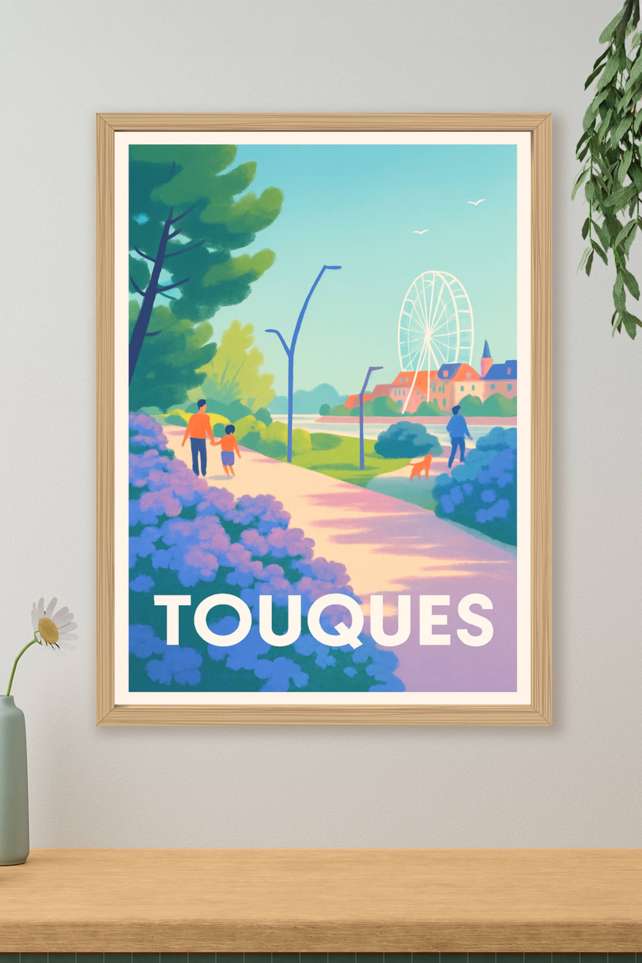 Découvrez la douceur de vivre normande avec ce poster illustré qui capture une balade tranquille à Touques, au bord de la rivière, sous un ciel lum...