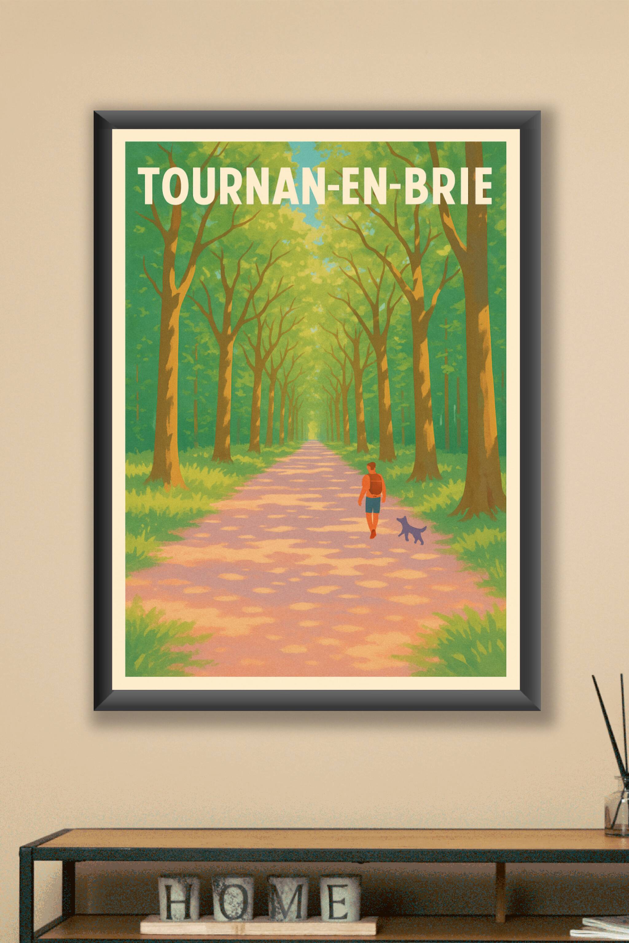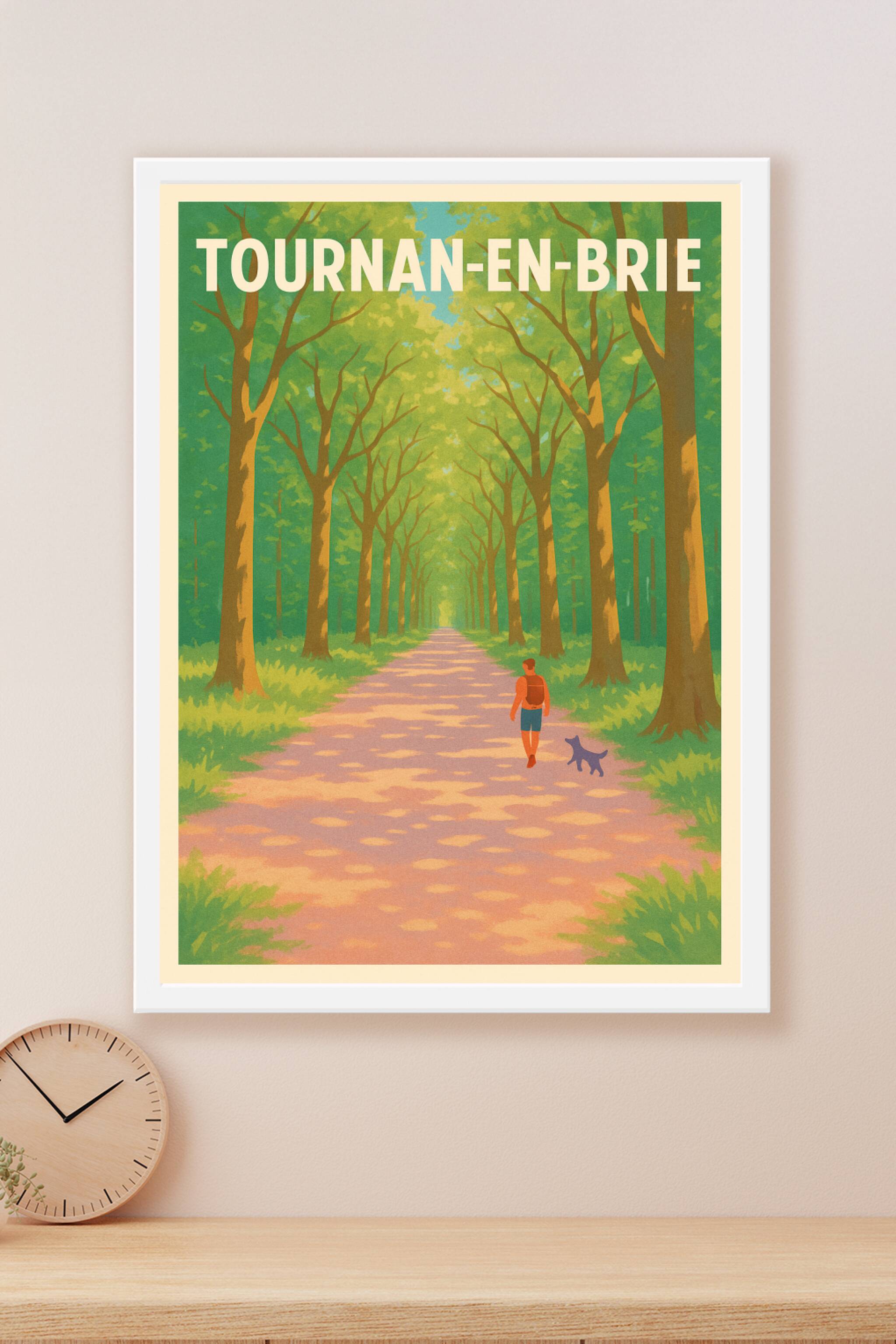 Découvrez la sérénité de Tournan-en-Brie avec cette affiche illustrée, capturant une allée bordée d'arbres majestueux baignés de lumière douce. Un ...
