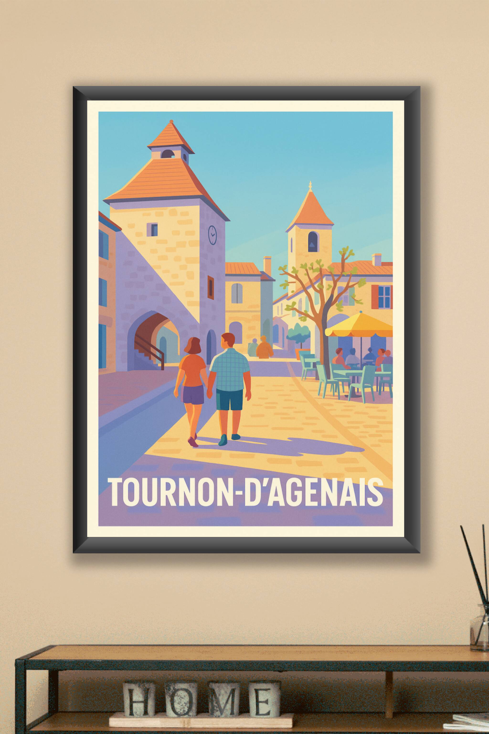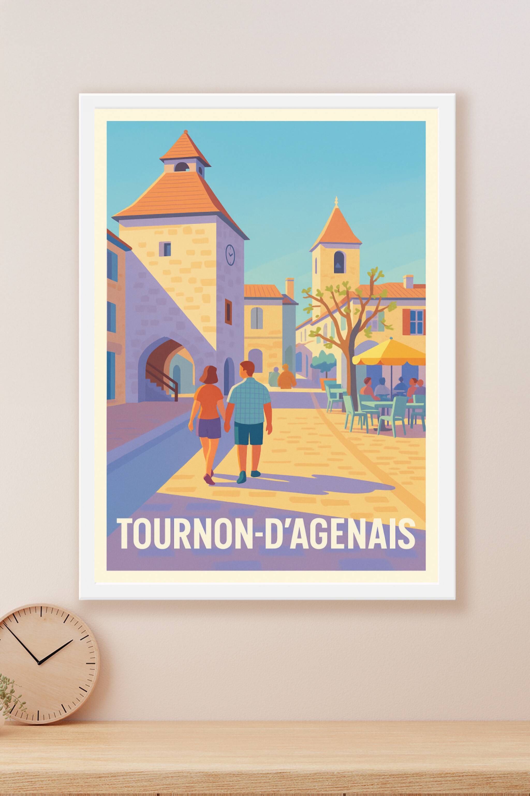 Découvrez le charme authentique de Tournon-d'Agenais avec cette affiche illustrée qui capture une promenade paisible sous un ciel bleu éclatant. Cette scène conviviale met en avant les ruelles pavées, les bâtiments aux toits de tuiles rouges et l'ambiance chaleureuse de cette bastide historique. Imprimée en tirage "Fine Art" sur un papier 305g coton, cette affiche garantit une qualité d'impression exceptionnelle pour sublimer votre décoration. Disponible en formats A1 à A4, avec ou sans cadre, ce poster apportera une touche d'élégance et de douceur méditerranéenne à votre intérieur. Offrez-vous ou offrez un souvenir raffiné de Tournon-d'Agenais avec ce poster de qualité premium, 100% fabriqué en France.