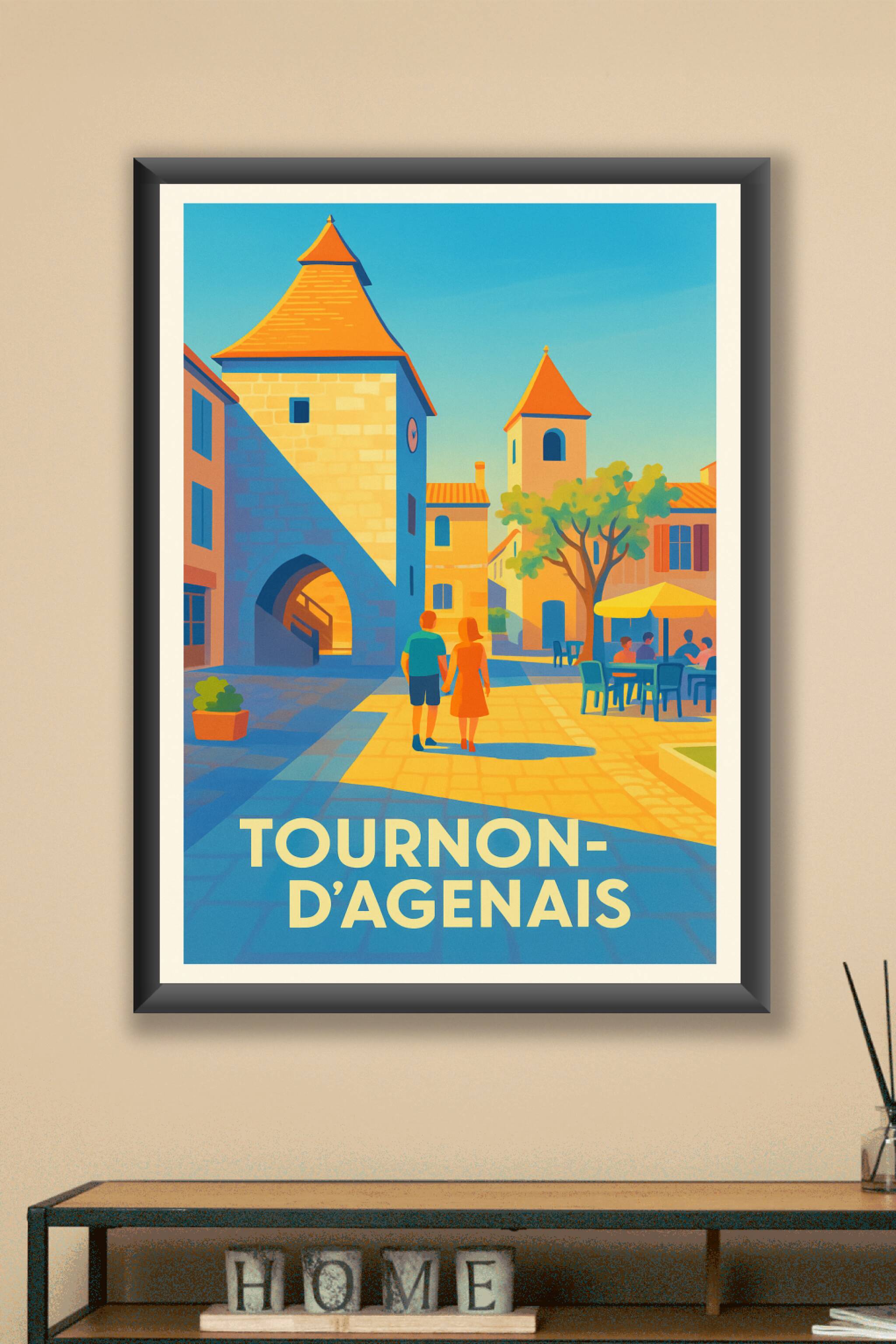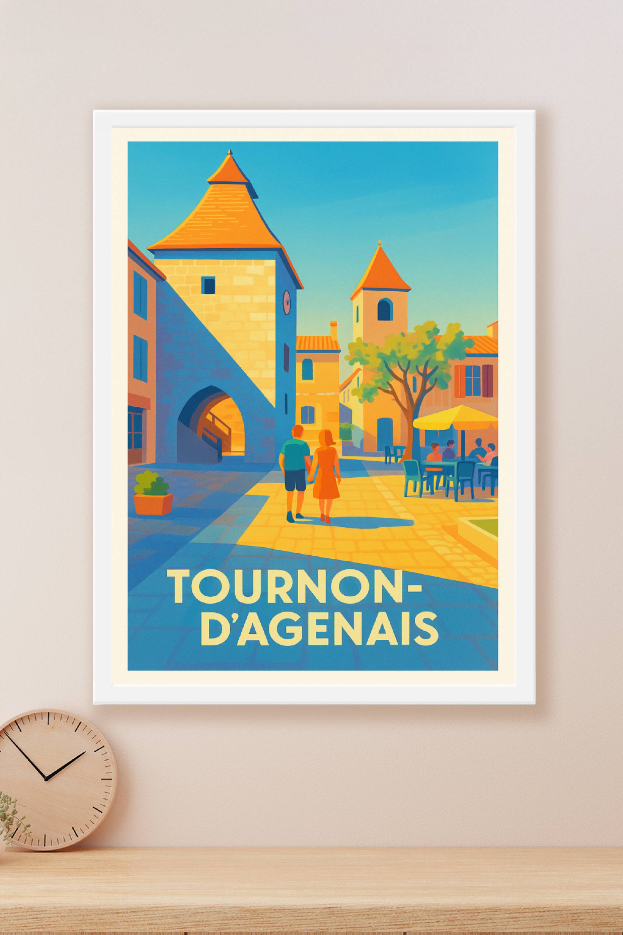 Découvrez l'élégance et la douceur de vivre de Tournon-d'Agenais avec cette affiche vintage aux couleurs chaudes et lumineuses. Ce poster met en sc...