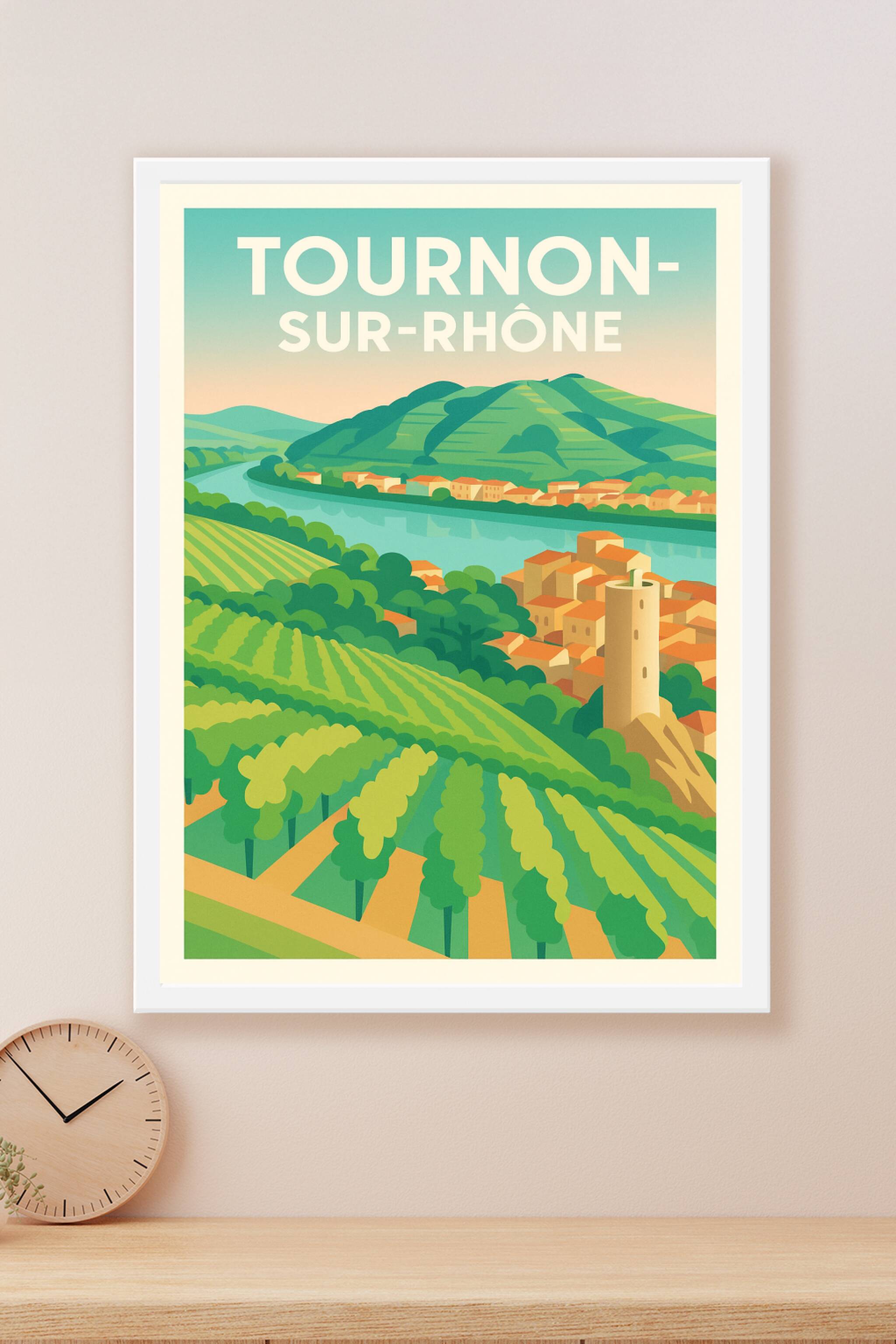 Découvrez l'élégance paisible de Tournon-sur-Rhône à travers cette affiche aux couleurs douces et au style graphique épuré. Ce poster met en lumièr...