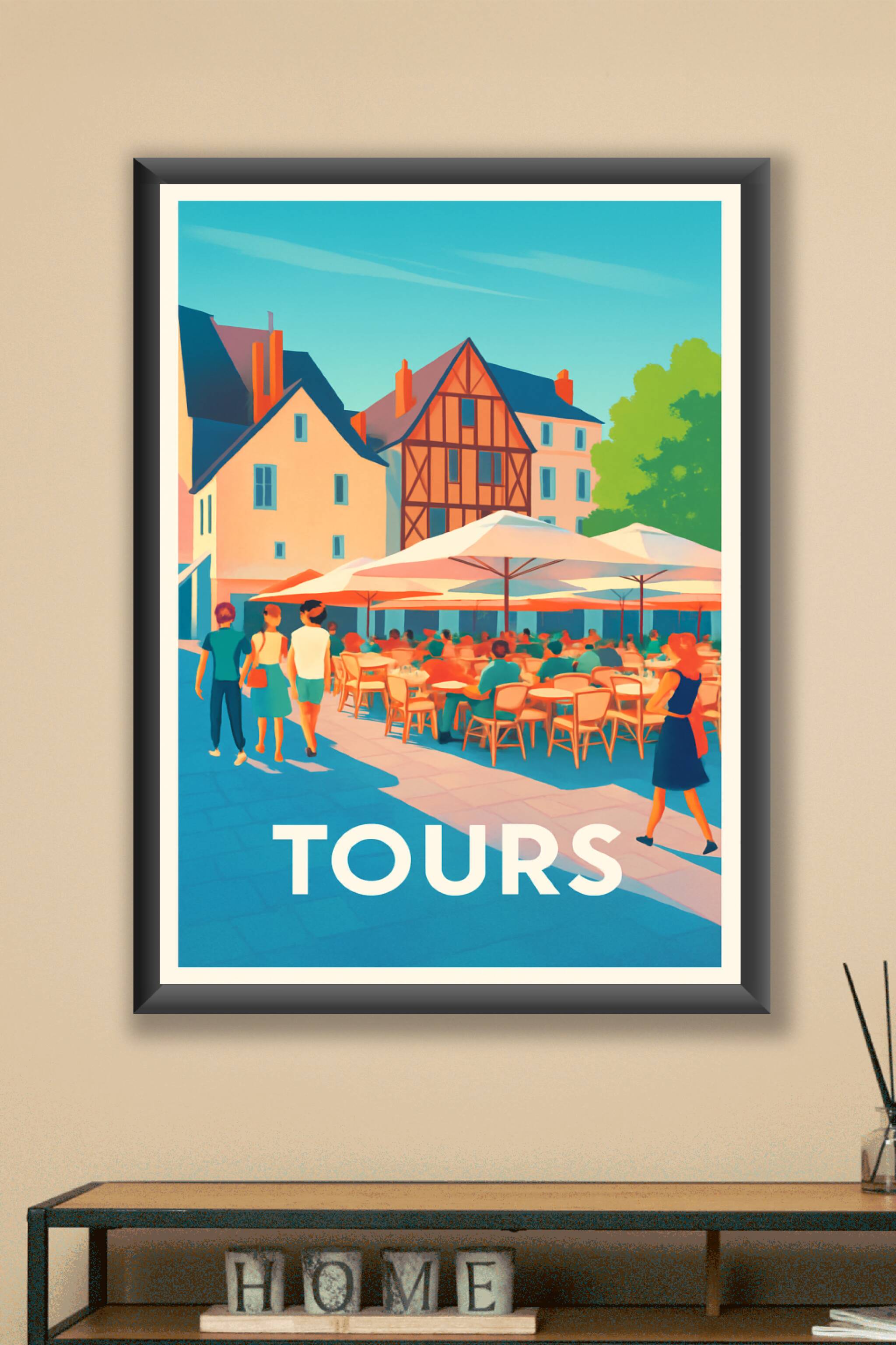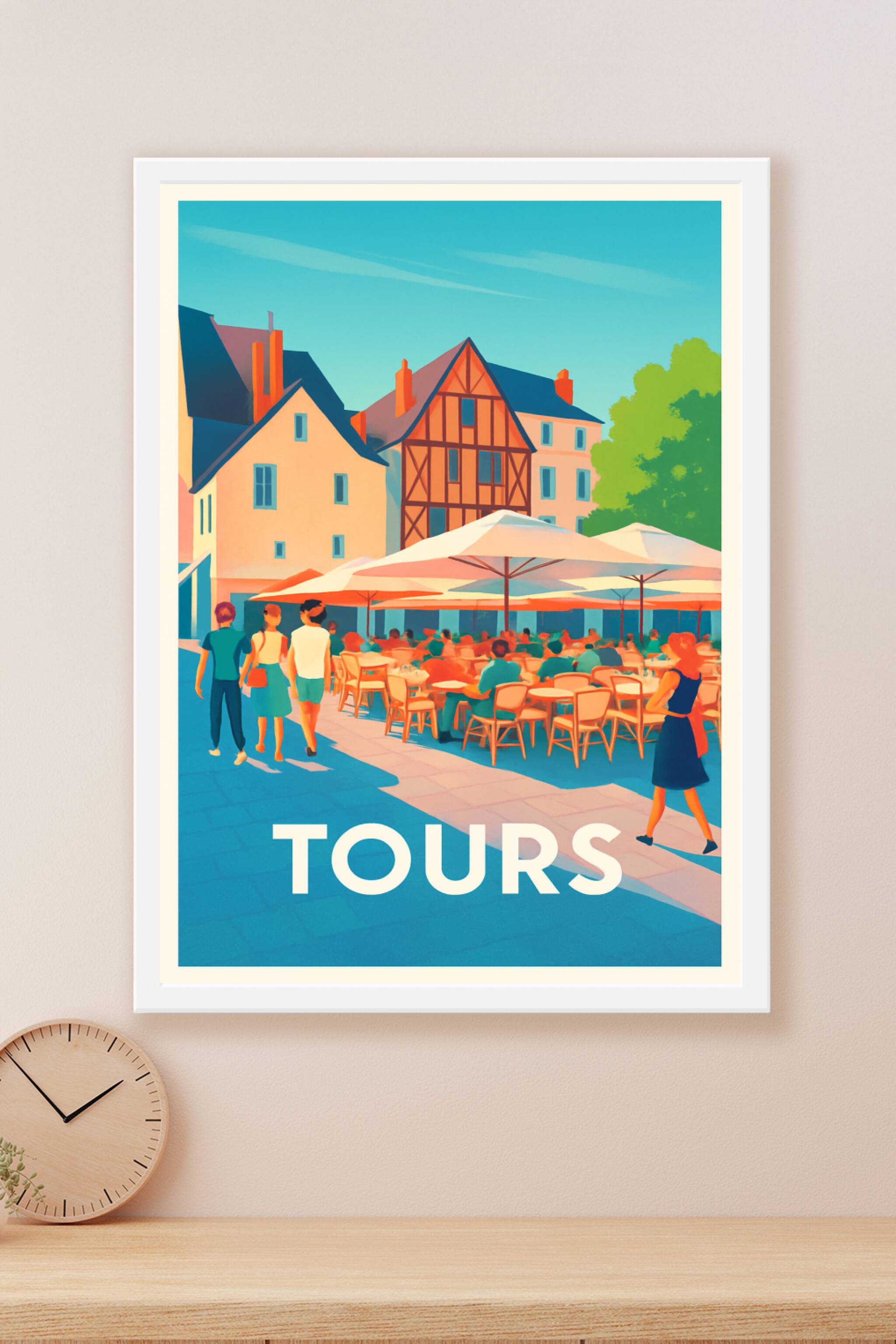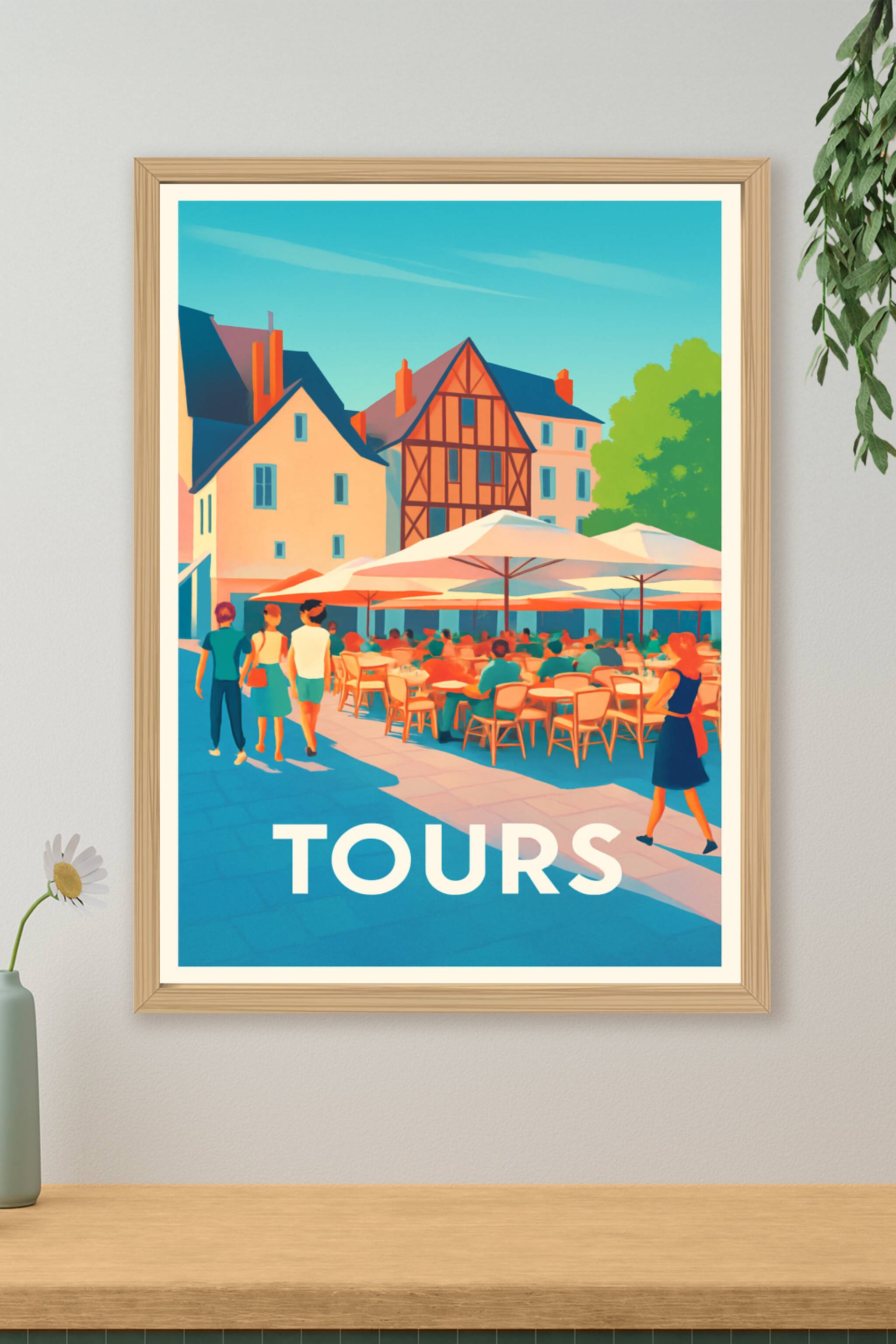 Découvrez l'ambiance conviviale et ensoleillée de Tours avec ce poster illustrant une terrasse pleine de vie, au cœur de la ville historique. Les m...