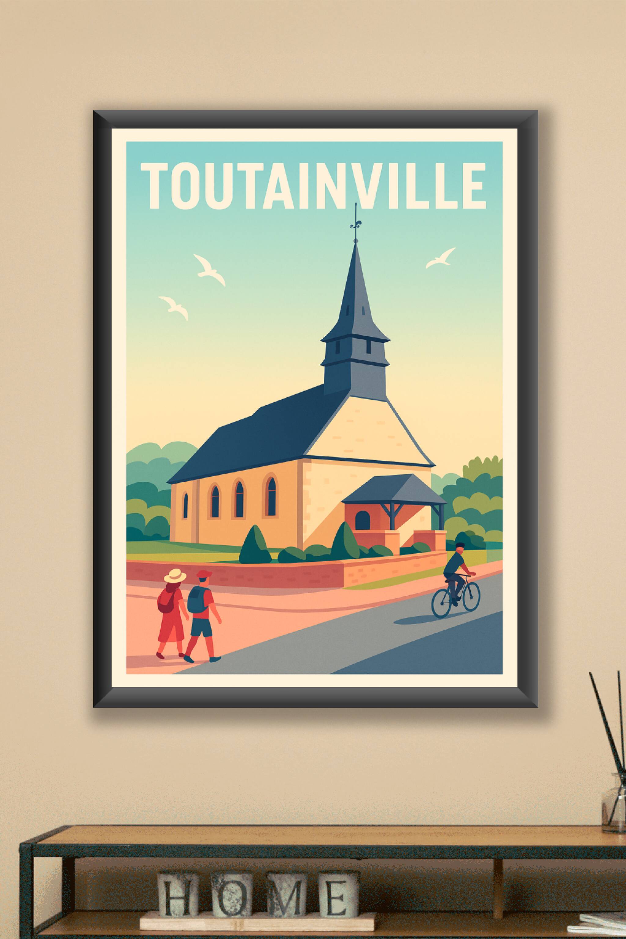 Découvrez le charme tranquille de Toutainville à travers cette affiche illustrée mettant en scène son église emblématique sous un ciel doux et lumineux. Ce poster capture l'essence d'un village normand typique, idéal pour apporter une touche de sérénité et d'authenticité à votre décoration intérieure. Imprimé en tirage "Fine Art" sur papier 305g coton de haute qualité, ce poster vous garantit des couleurs éclatantes et une durabilité exceptionnelle. Disponible en formats A1 à A4, avec ou sans cadre, cette affiche est parfaite pour embellir votre salon, bureau ou offrir un cadeau raffiné aux amateurs de lieux pittoresques. Les finitions soignées et la qualité d'impression premium, 100% fabriquée en France, feront de cette affiche un véritable objet décoratif à chérir.