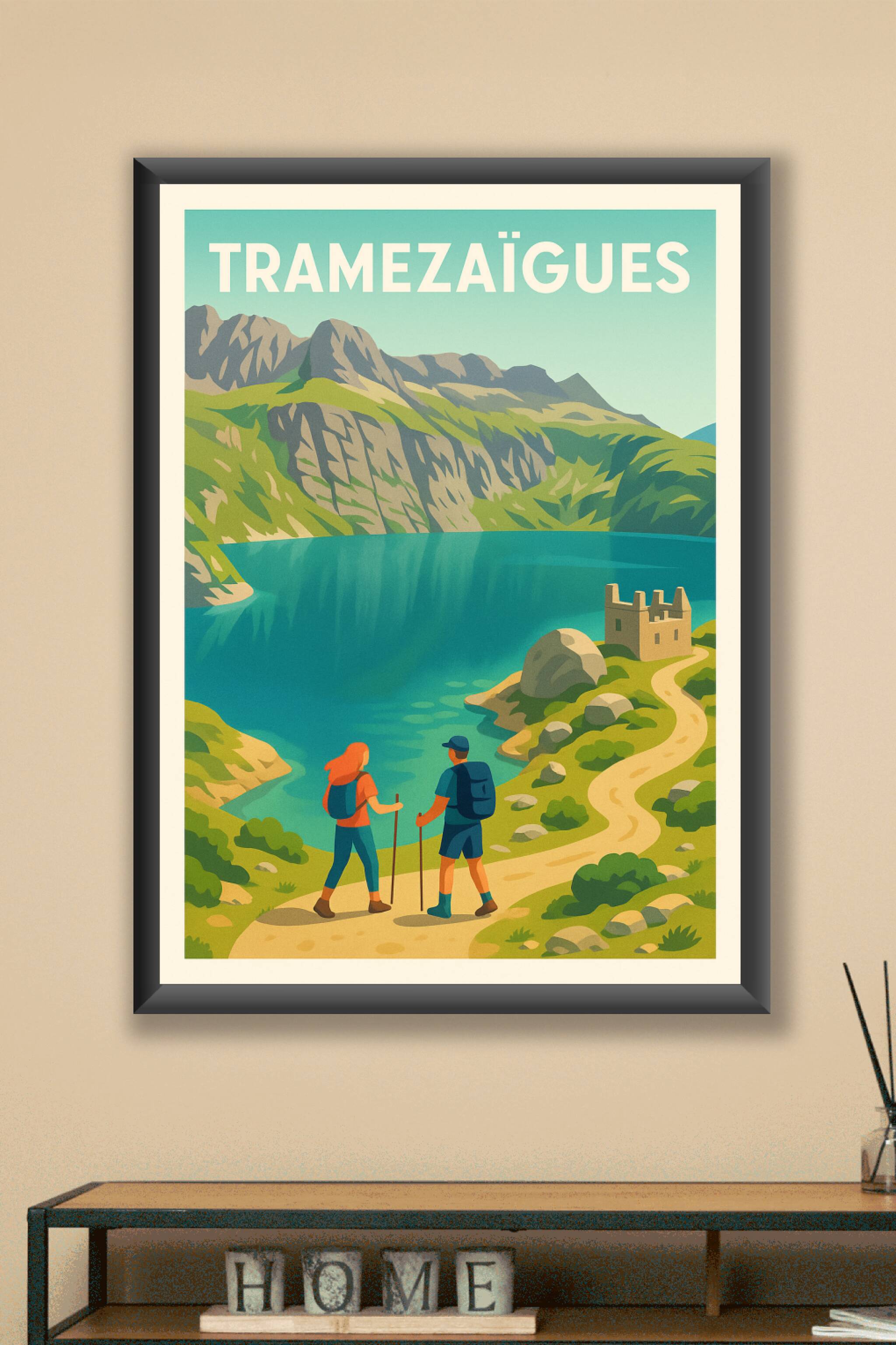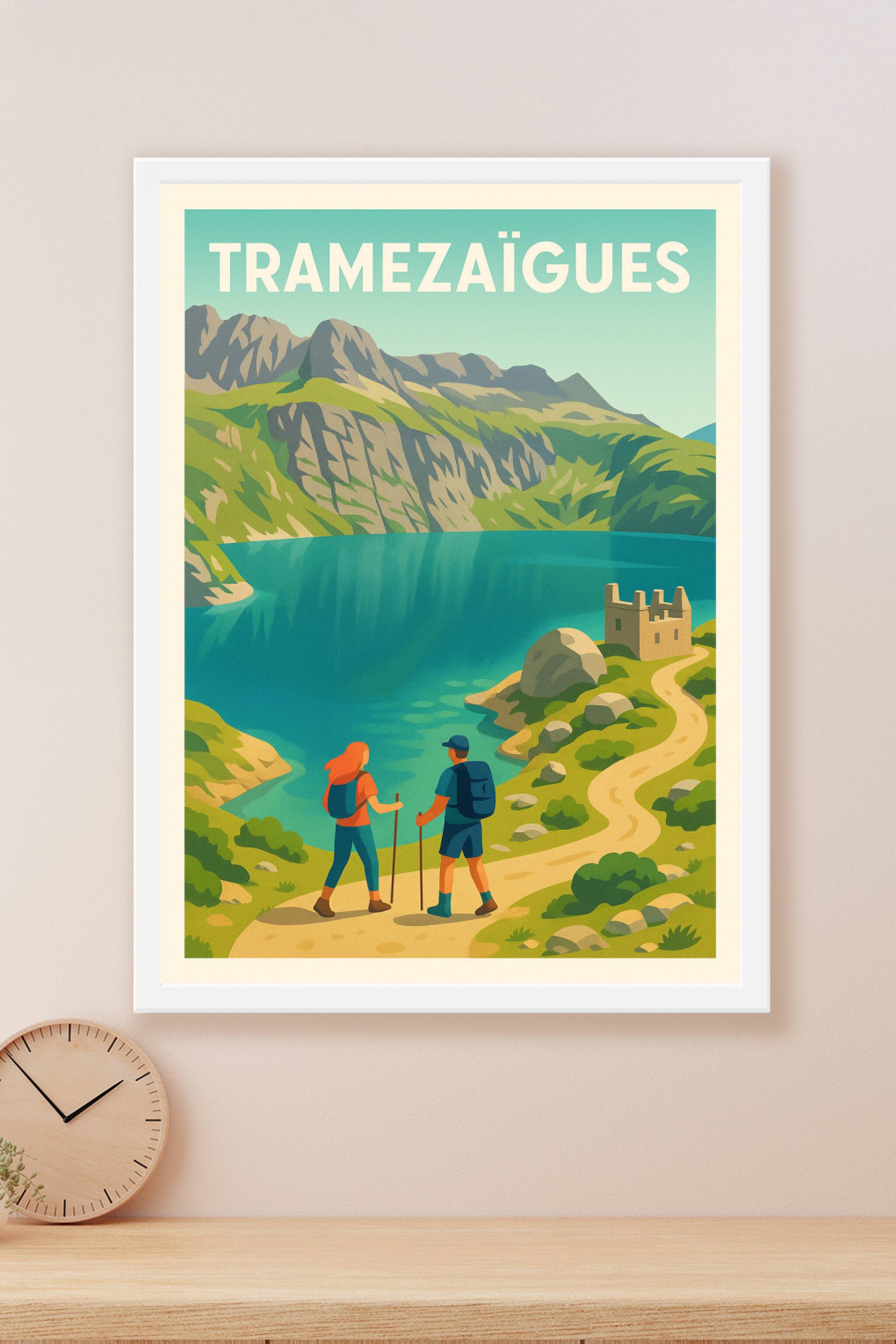 Découvrez la beauté sauvage et paisible de Tramezaïgues avec cette affiche au style vintage élégant. Le poster immortalise une scène de randonnée a...