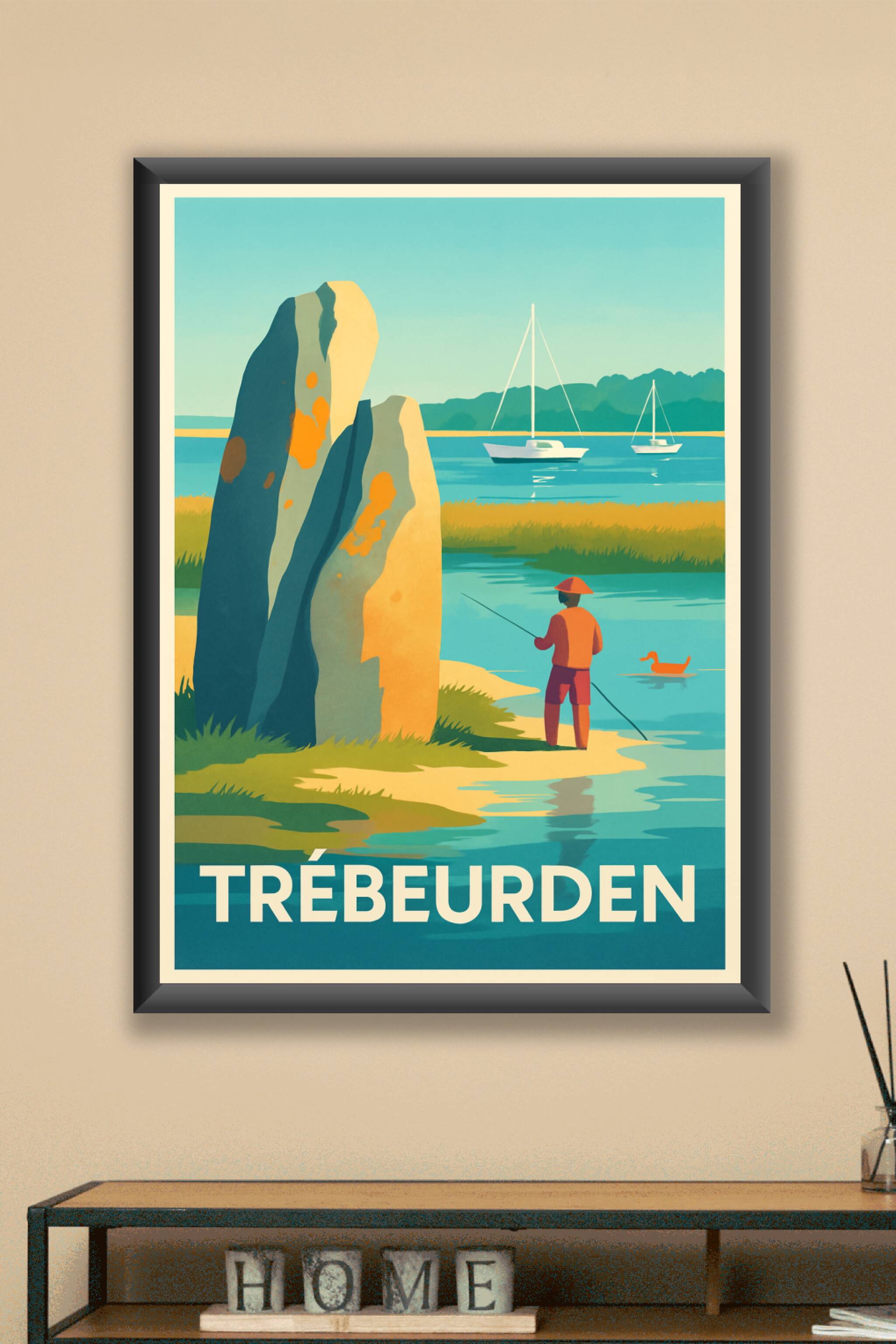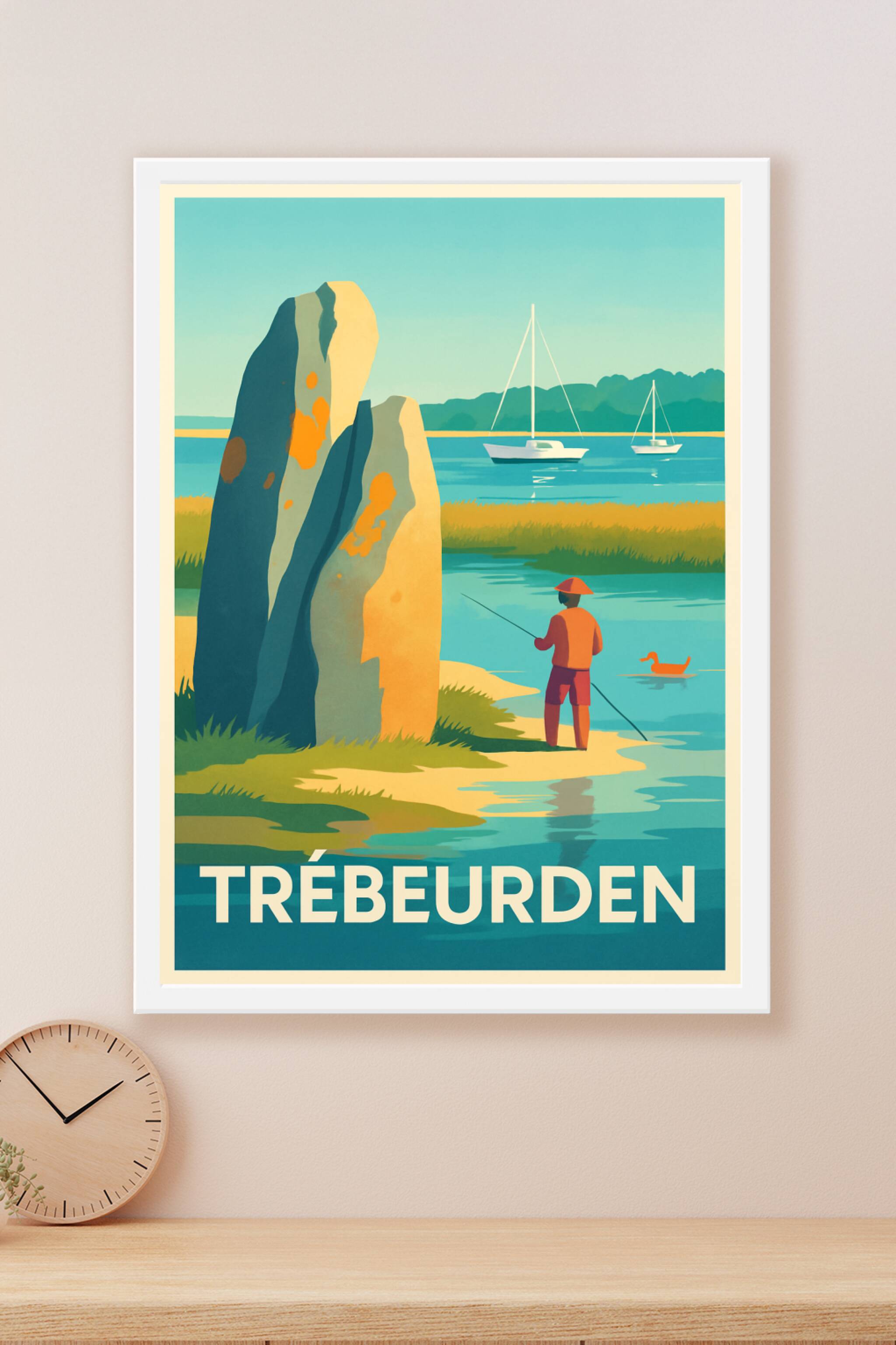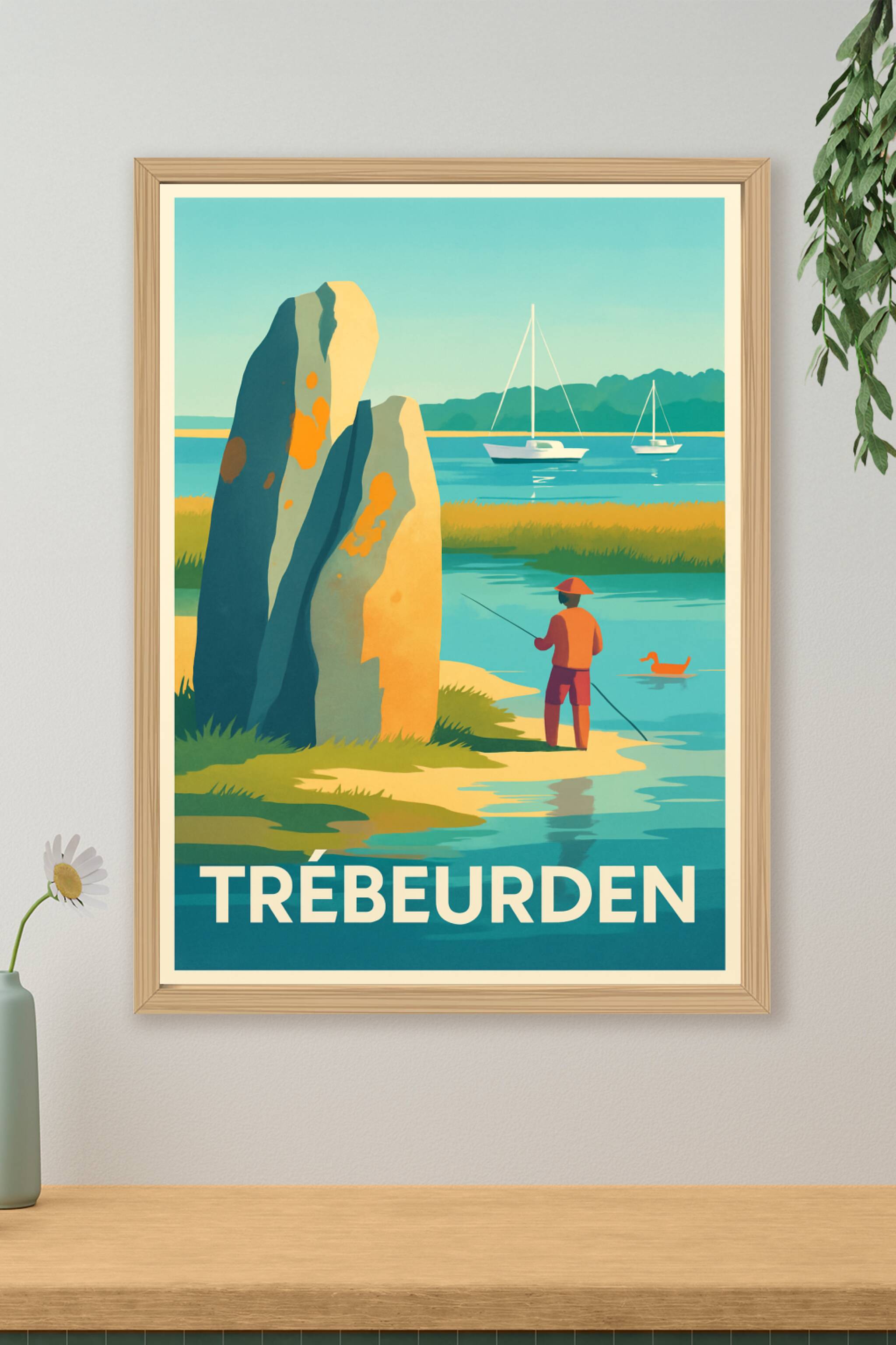Découvrez la sérénité de Trébeurden avec cette affiche élégante qui capture une scène paisible au bord de l'eau, entre menhirs emblématiques, pêche...