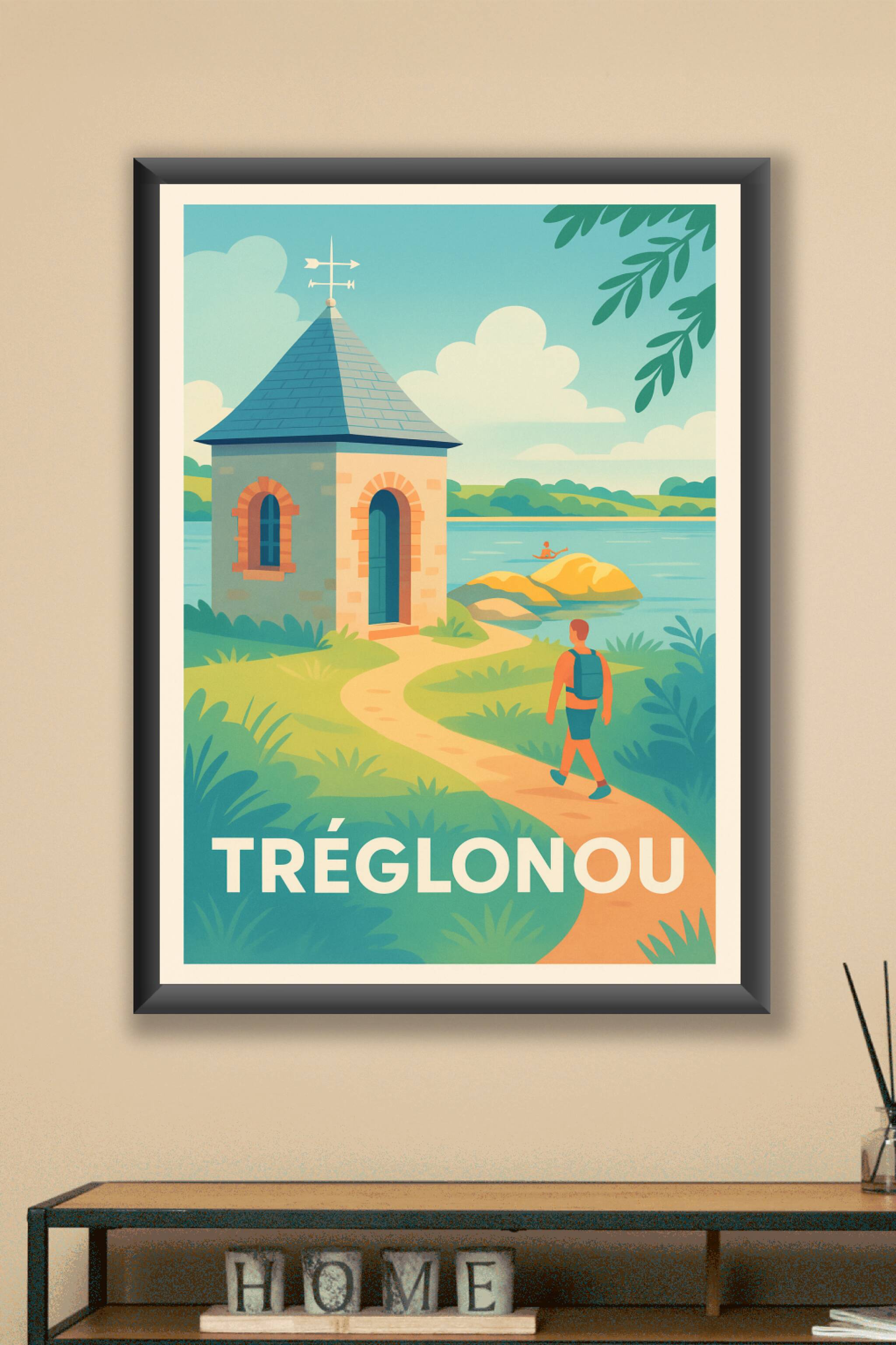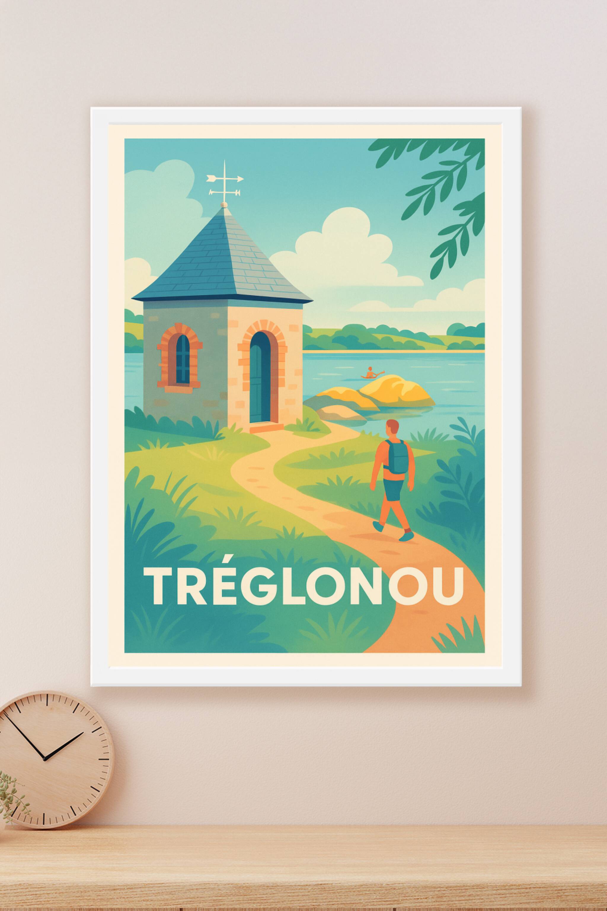 Découvrez la sérénité de Tréglonou avec cette affiche au design doux et coloré, représentant un paysage paisible au bord de l'eau. Ce poster illust...