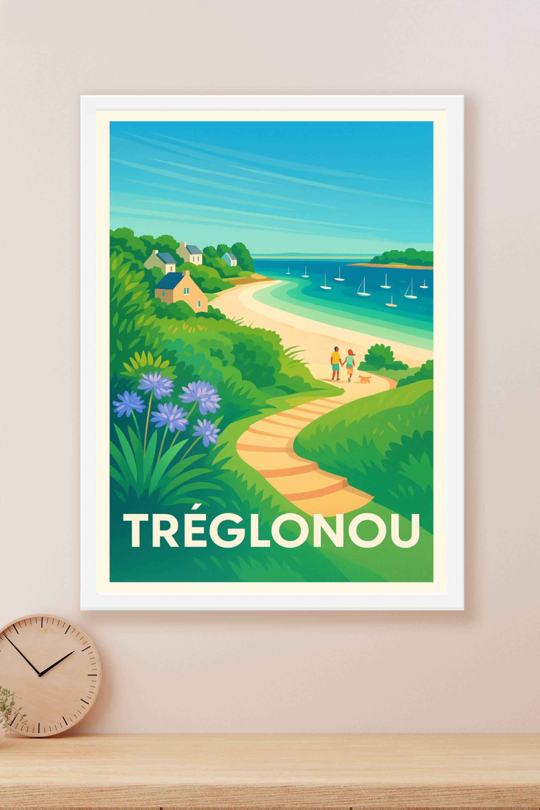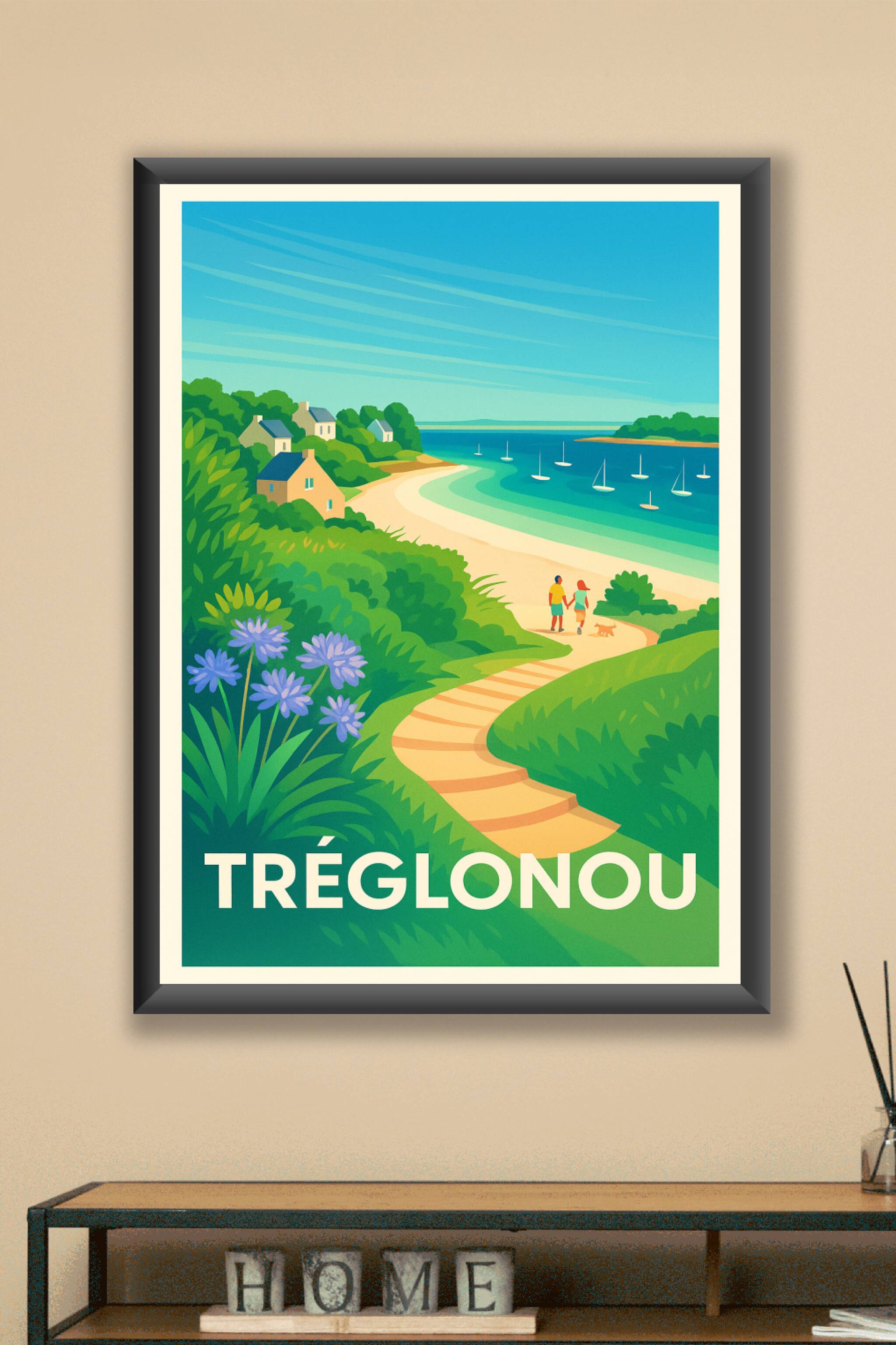 Imprégnez-vous de la douceur de vivre bretonne avec cette affiche représentant le charmant littoral de Tréglonou. Ce poster capture une promenade a...