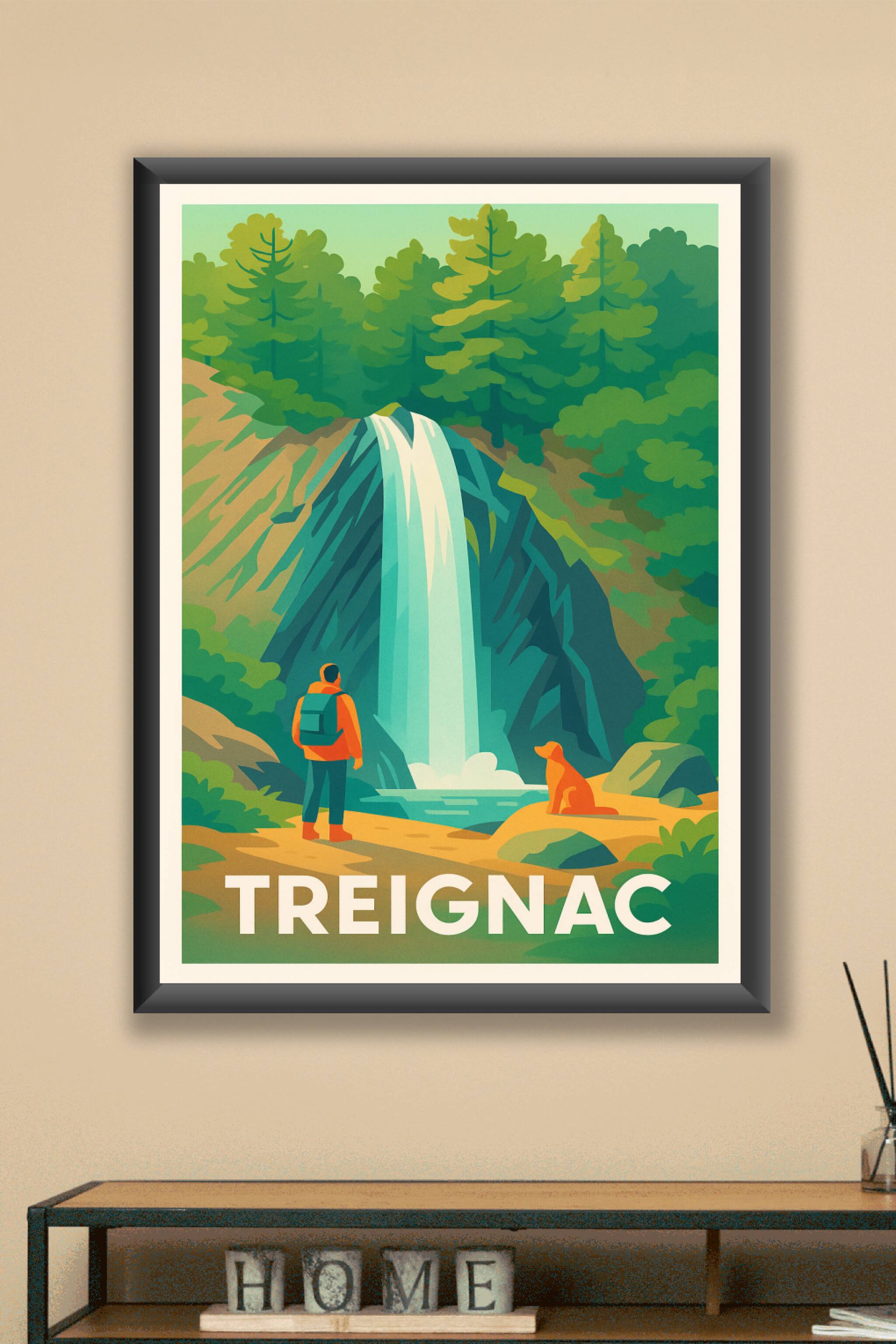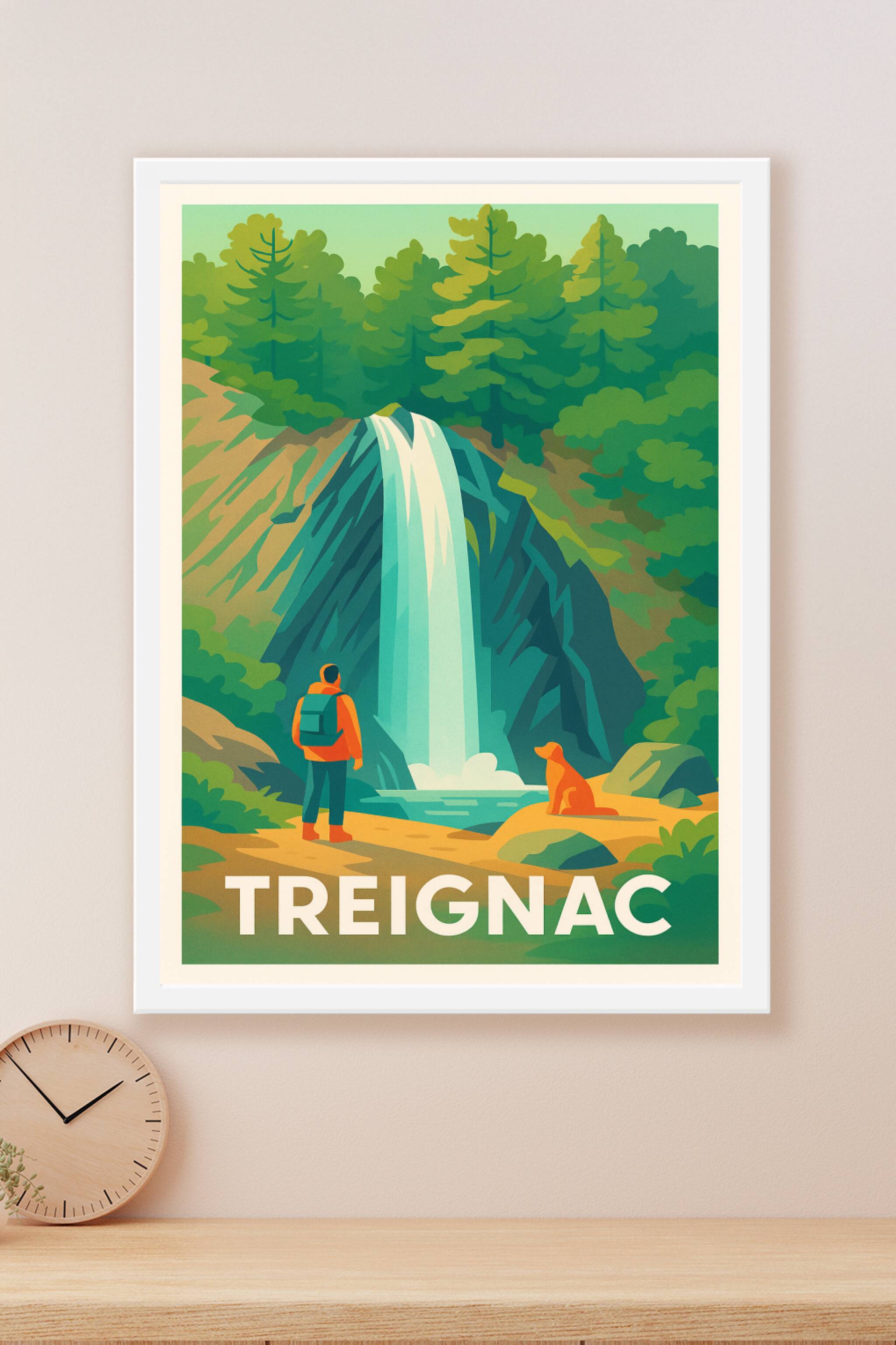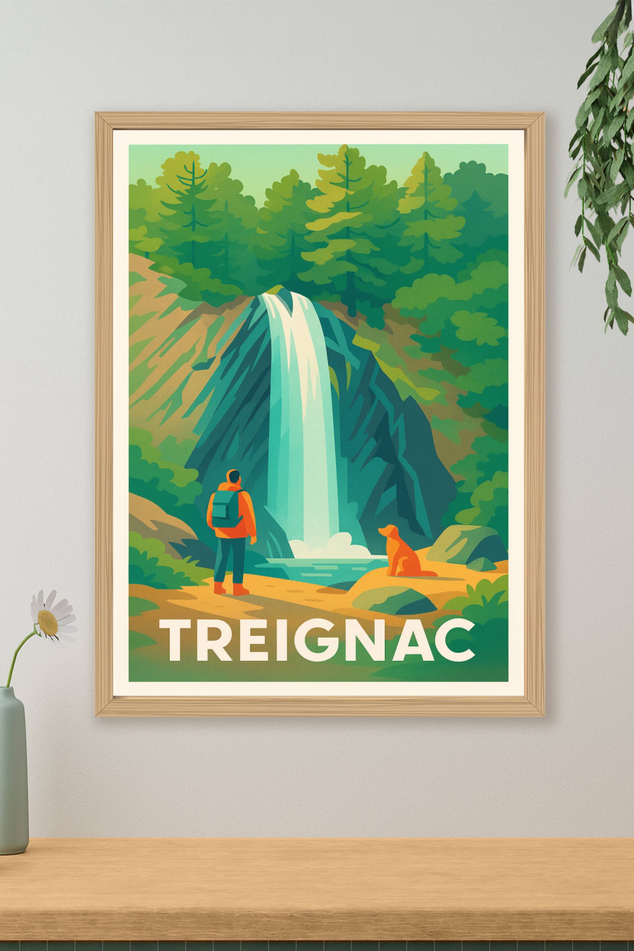 Découvrez la beauté naturelle de Treignac avec cette affiche illustrée qui capture un moment paisible face à une cascade majestueuse entourée de ve...