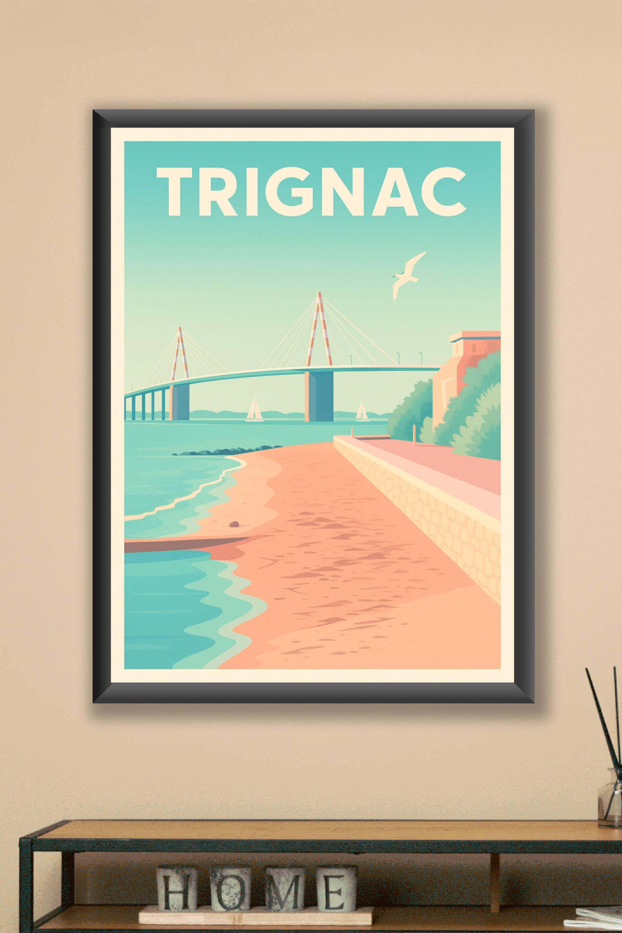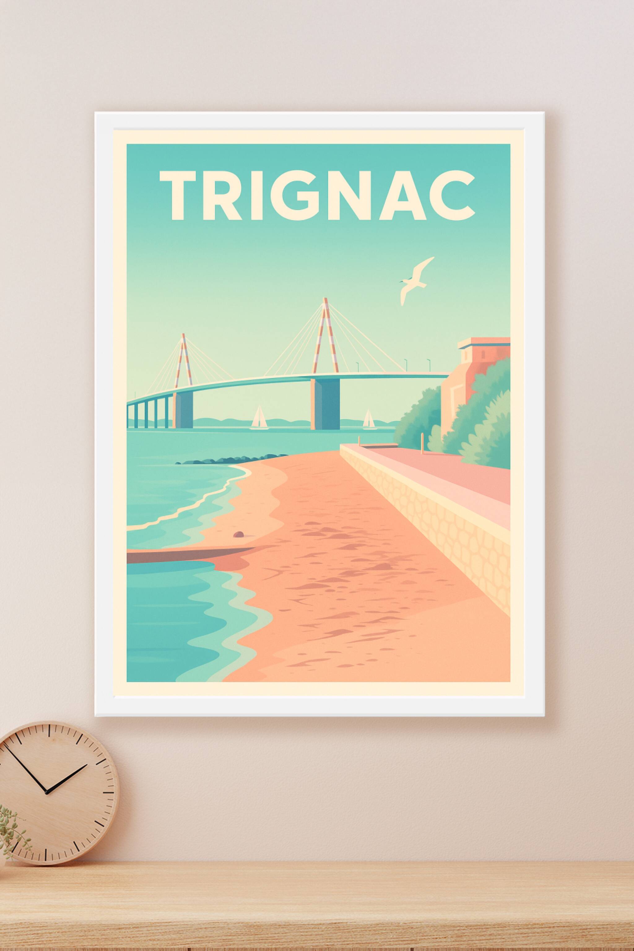 Découvrez la douceur de vivre de Trignac avec cette affiche au style rétro illustrant la plage paisible et l'iconique pont suspendu. L'ambiance pas...