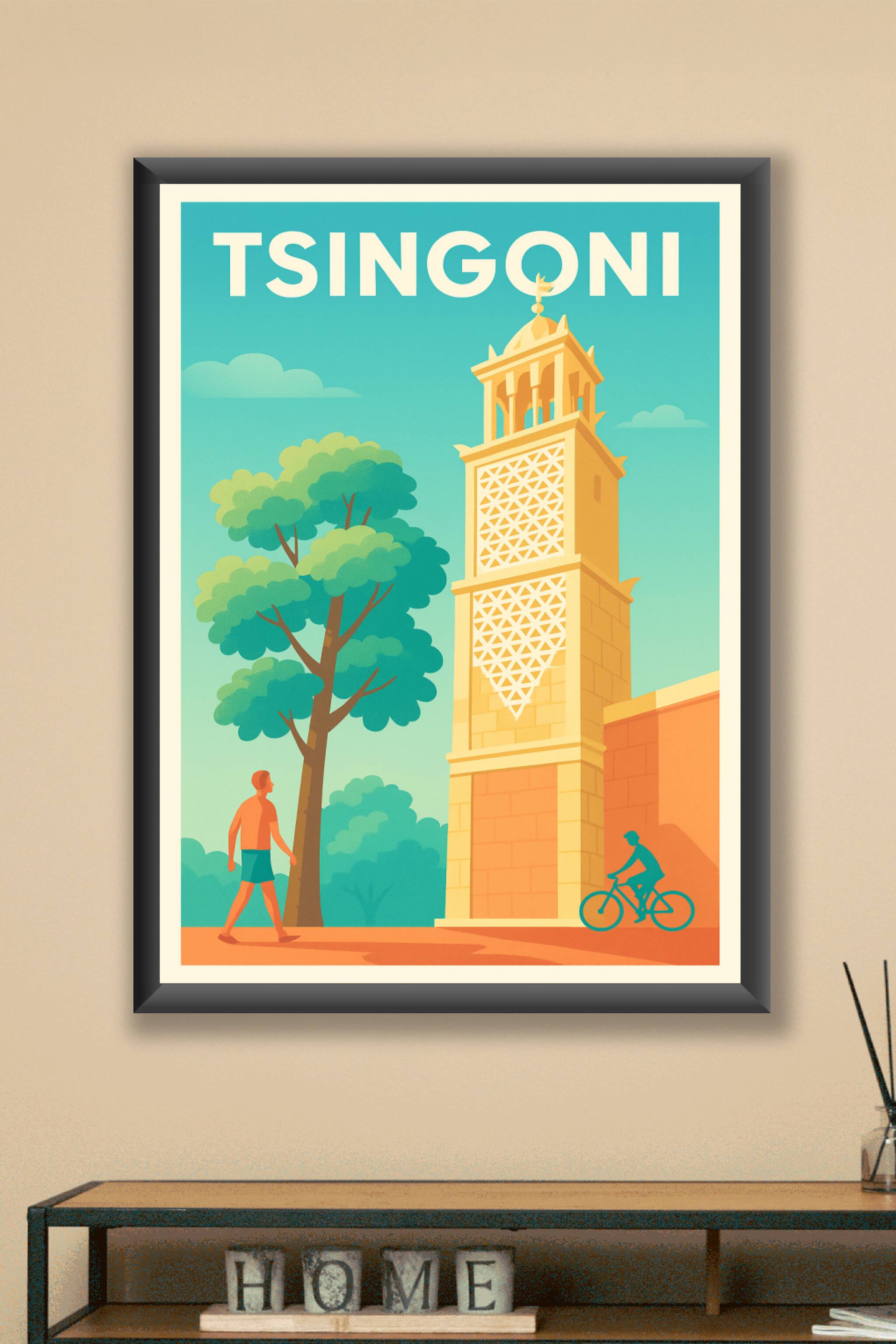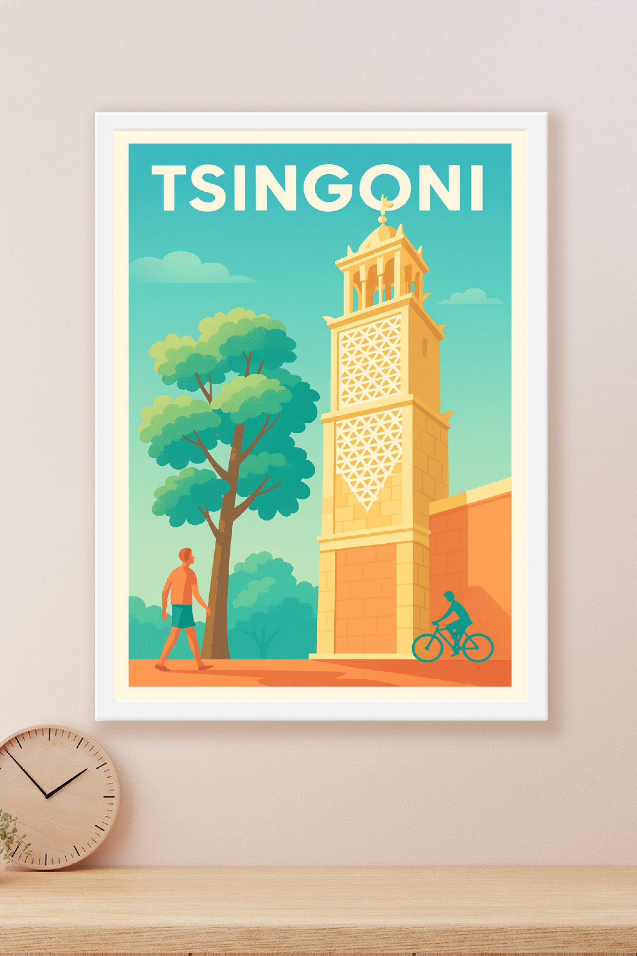 Découvrez l'atmosphère paisible de Tsingoni à travers ce poster illustré mettant en valeur son architecture emblématique. L'affiche capte la lumièr...