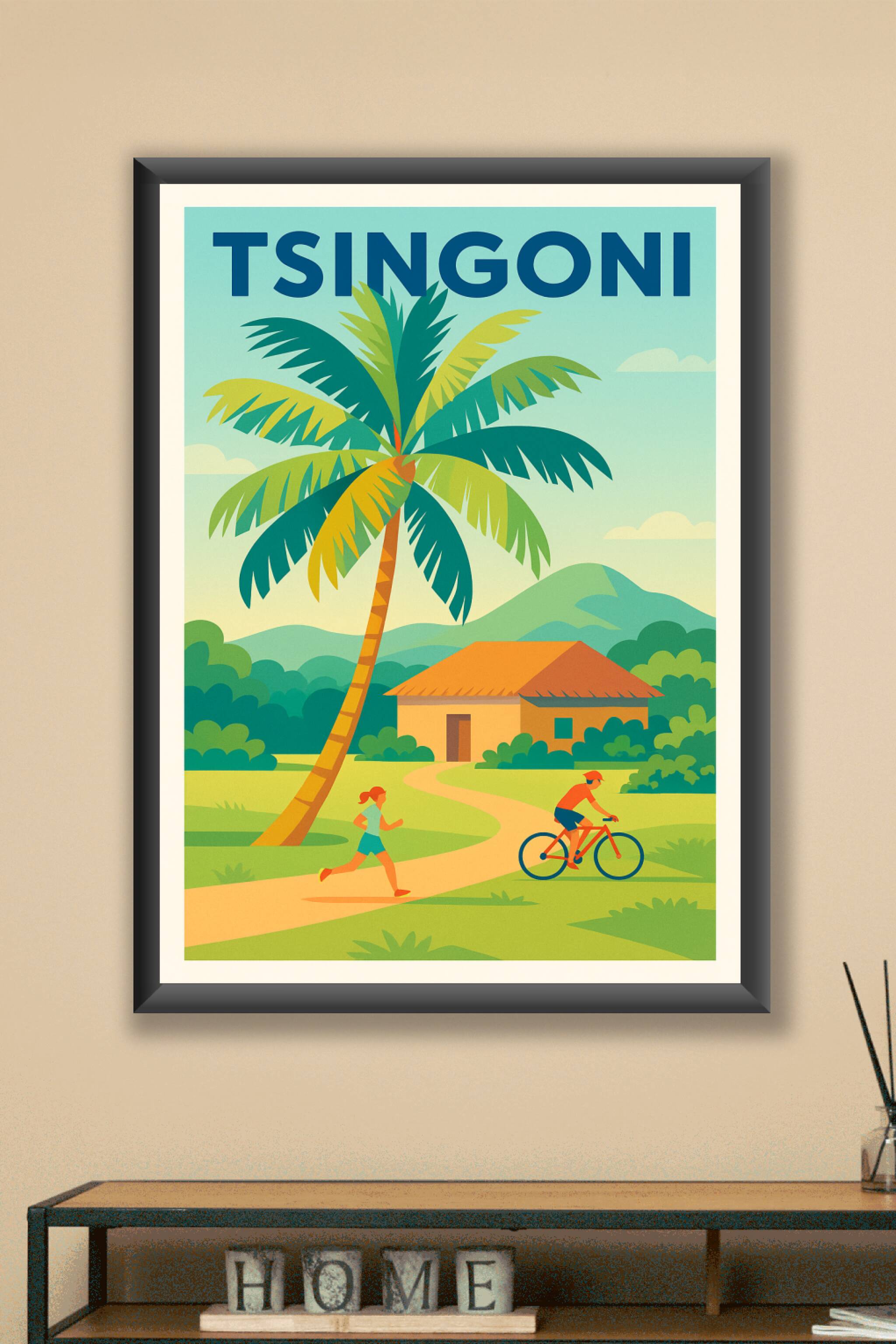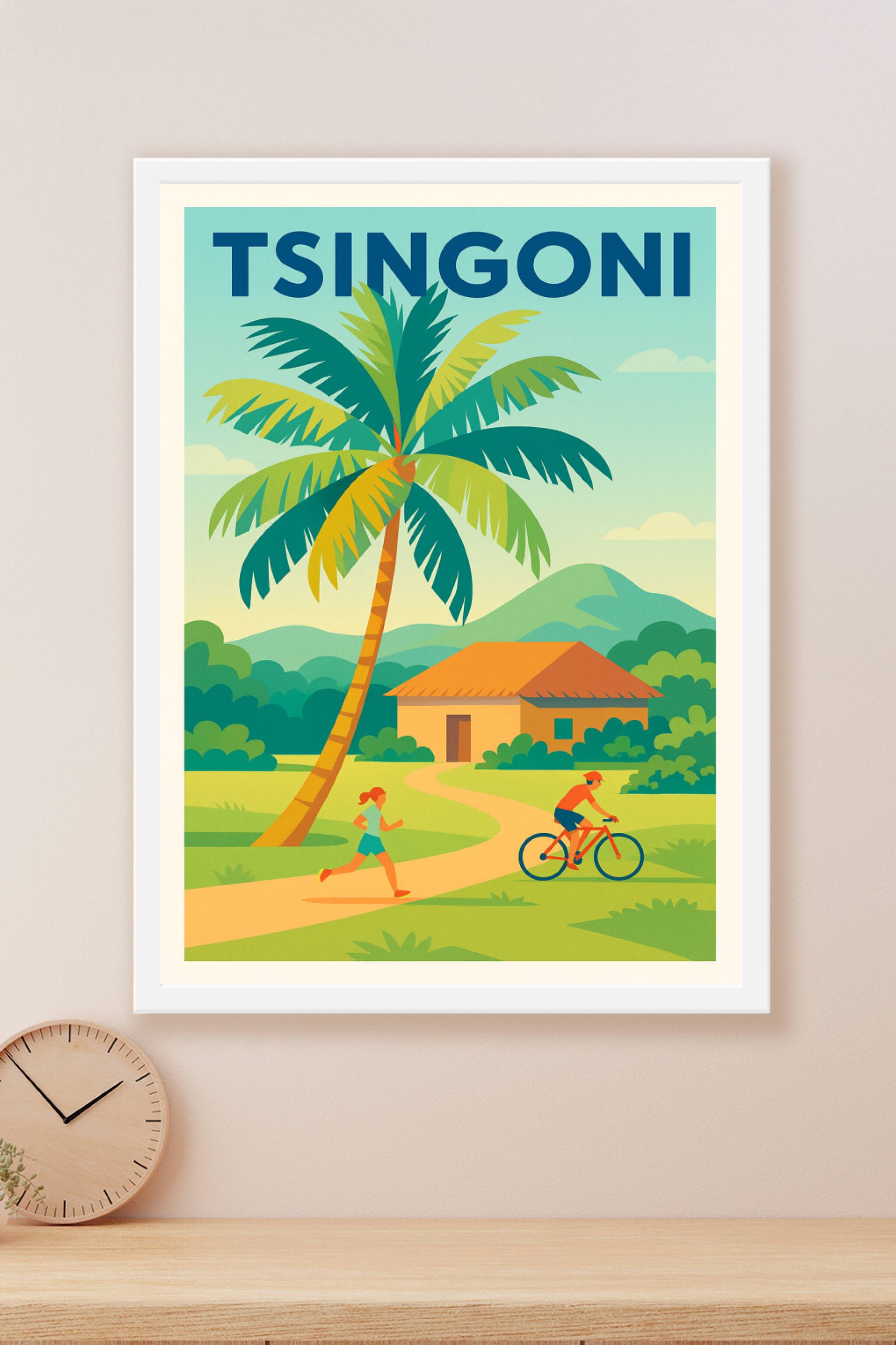 Découvrez l'ambiance paisible et sauvage de Tsingoni avec cette affiche illustrée aux couleurs vives et à l'esprit détendu. Une maison traditionnel...