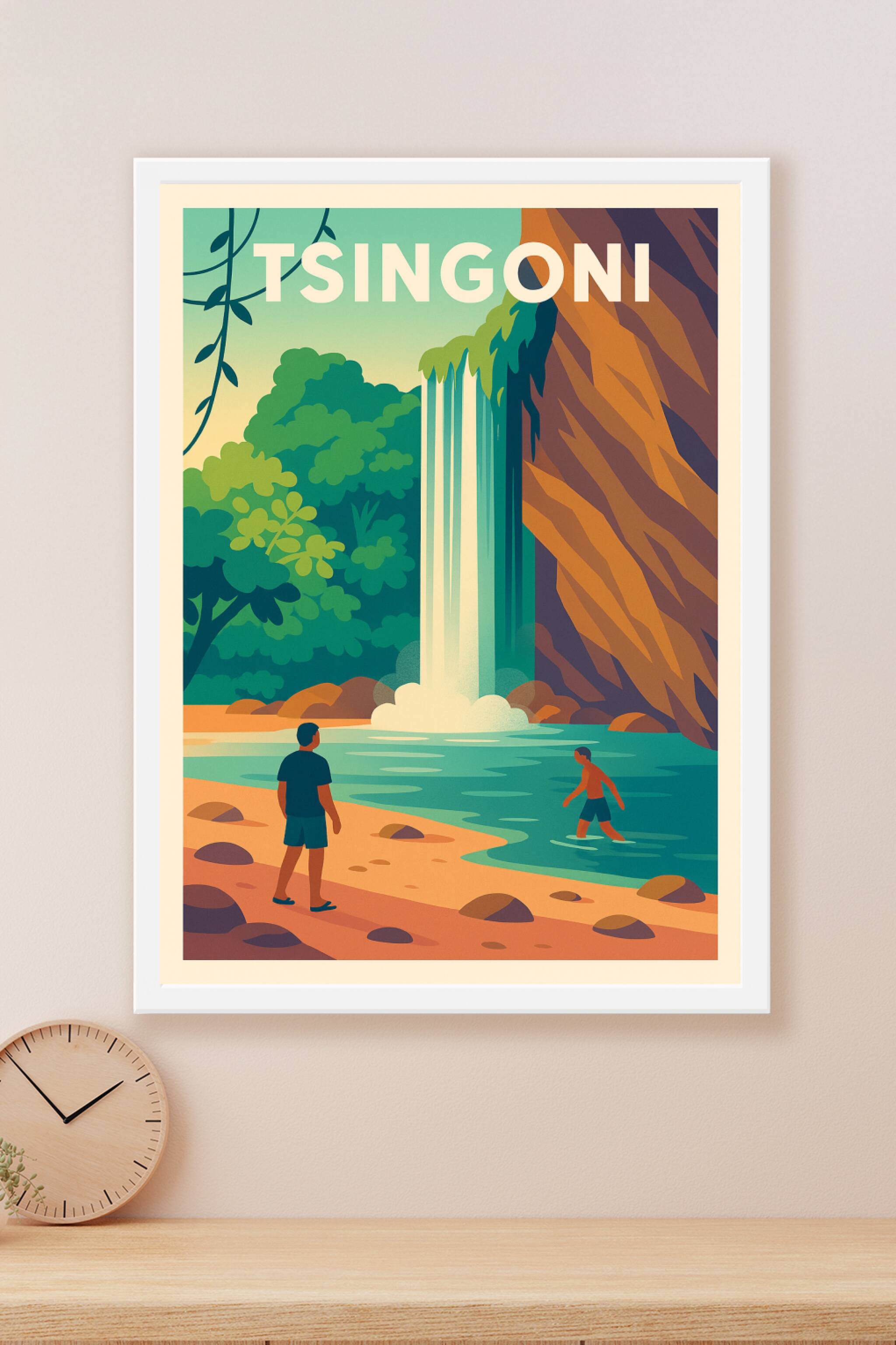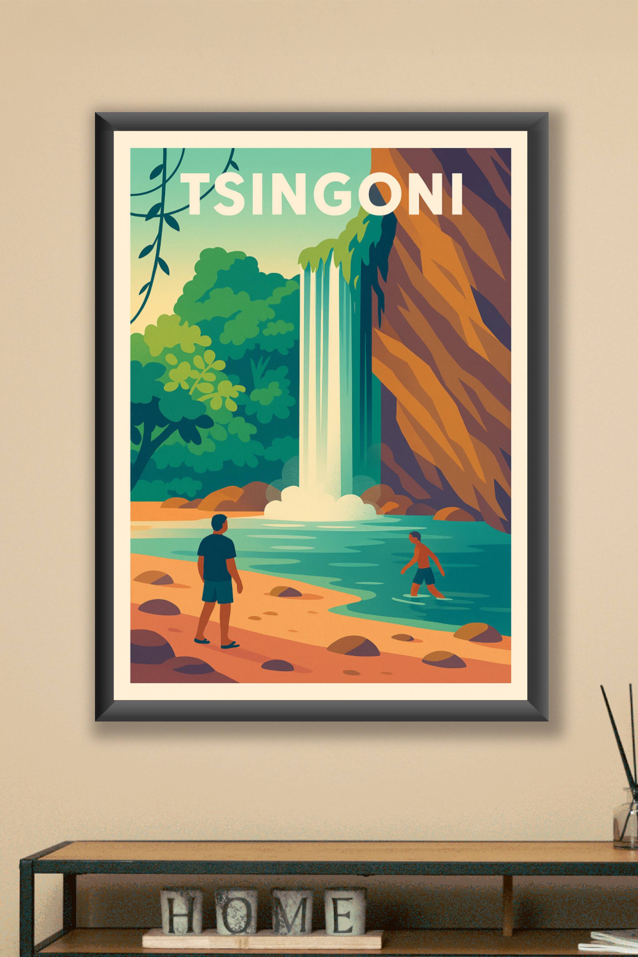 Découvrez la beauté sauvage et apaisante de Tsingoni avec ce poster illustré mettant en scène une cascade majestueuse tombant dans un lagon cristal...