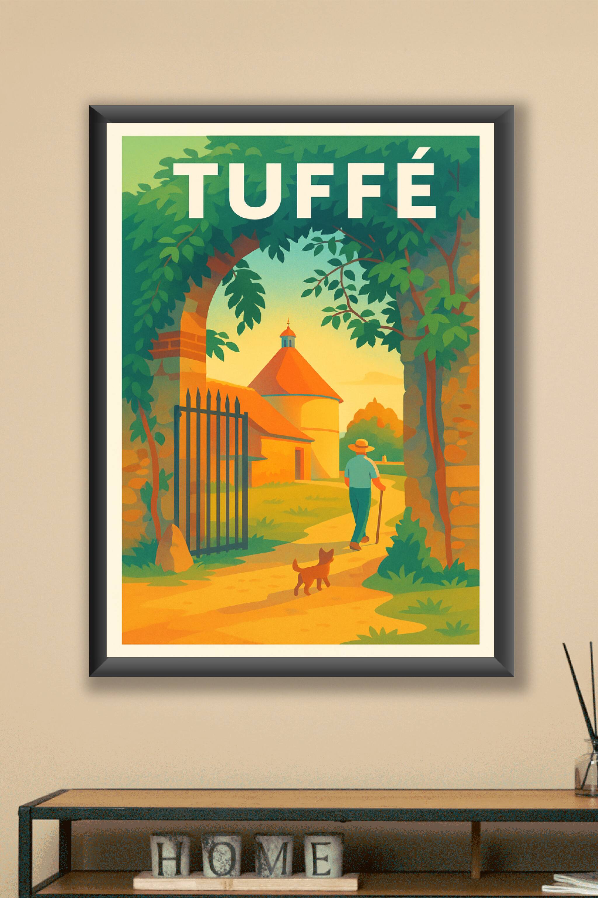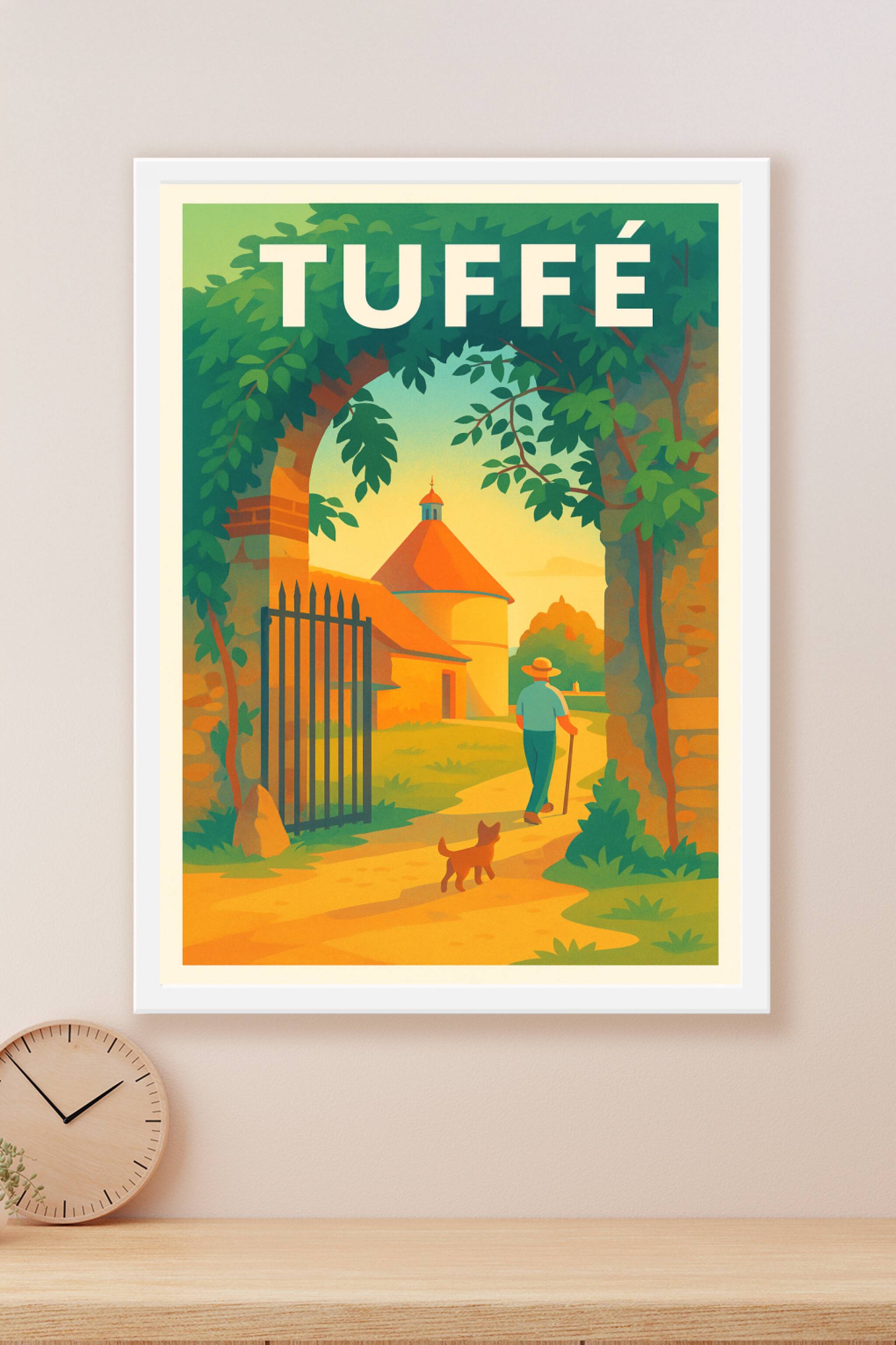Découvrez la quiétude charmante de Tuffé avec cette affiche aux teintes chaleureuses et au style vintage. Le poster illustre une scène apaisante où...