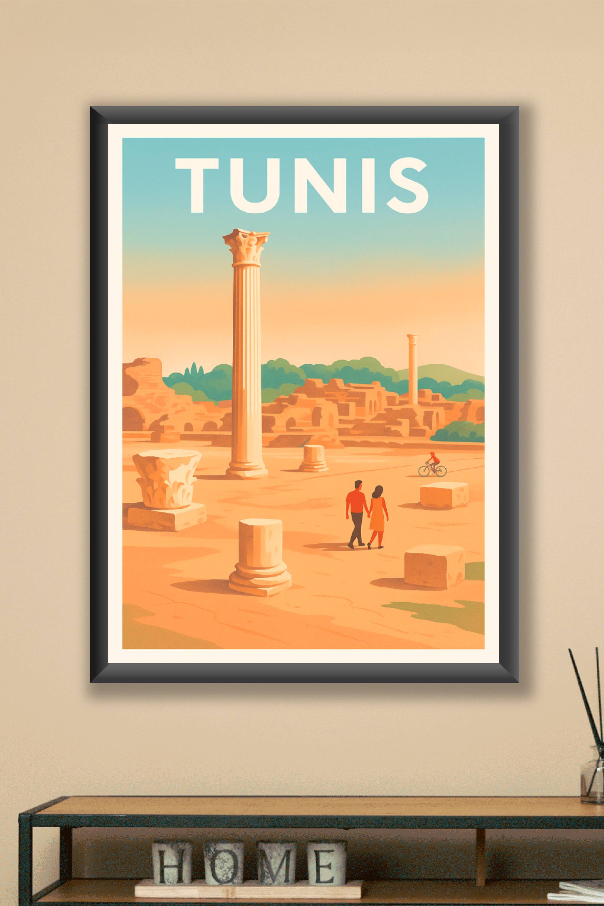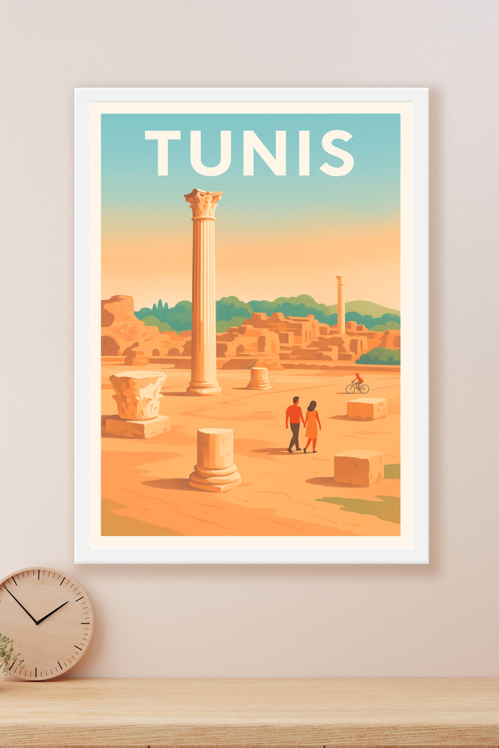 Découvrez la beauté intemporelle de Tunis avec cette affiche illustrée représentant les ruines historiques baignées par la lumière dorée du soleil....