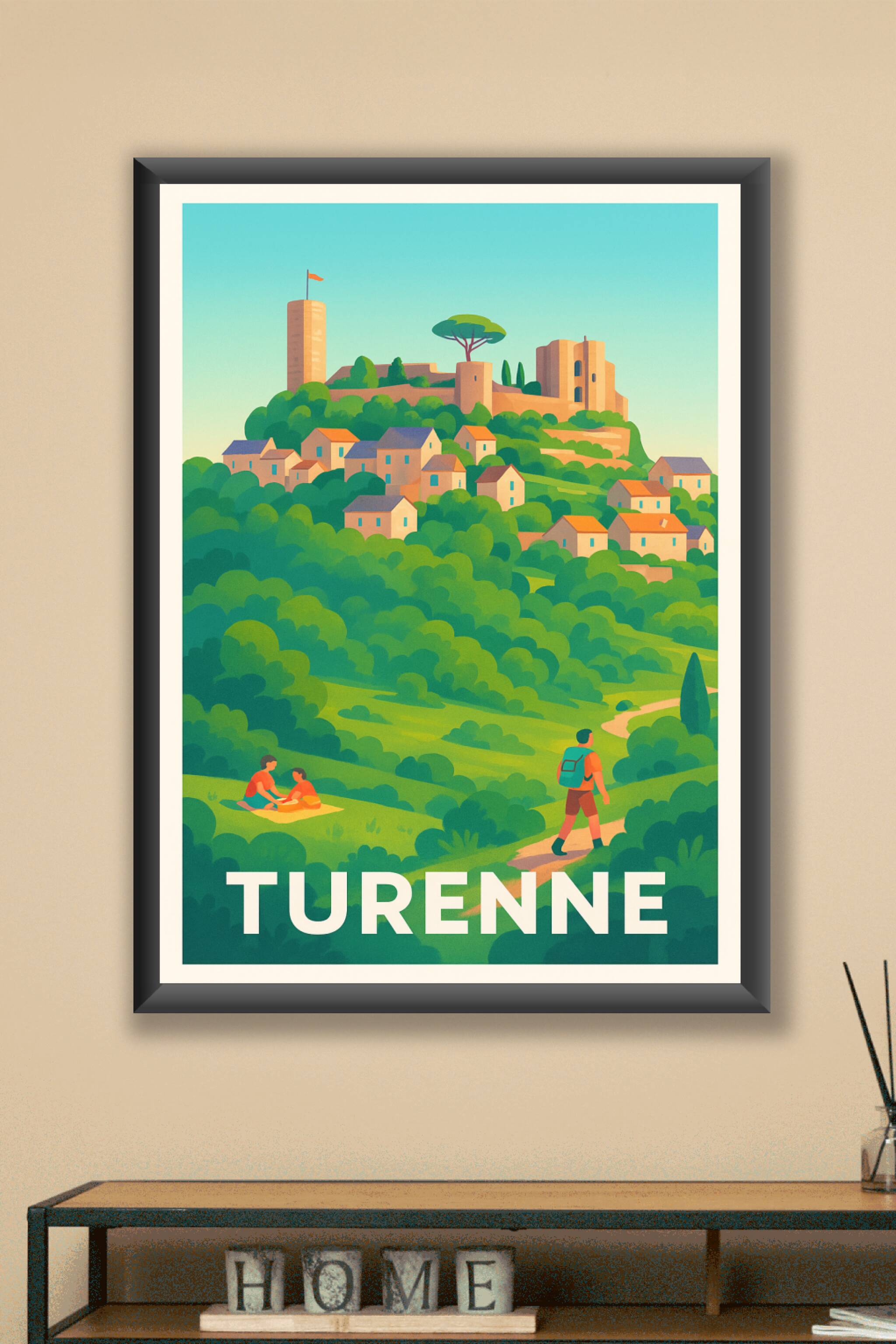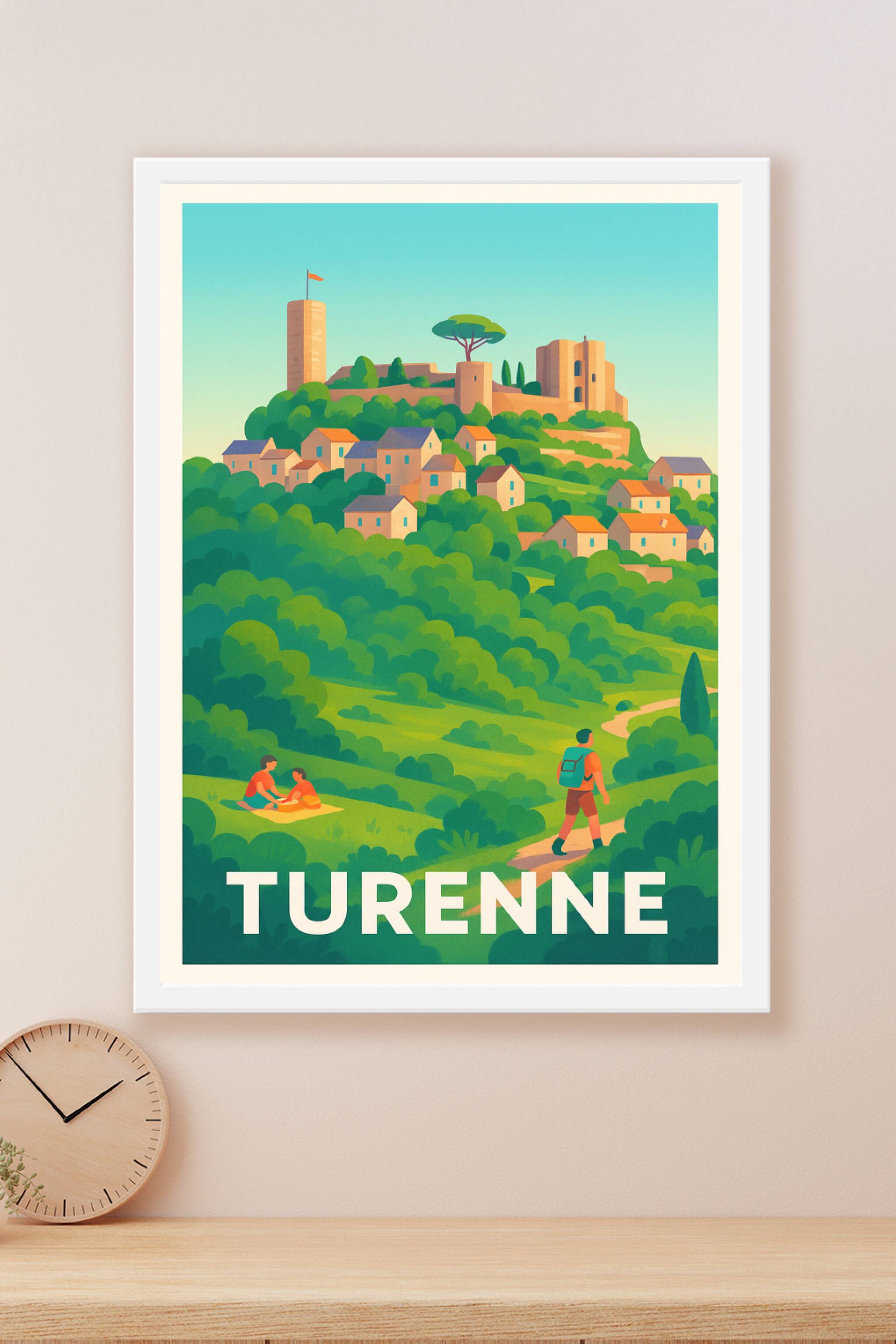 Découvrez la sérénité et la beauté verdoyante du village historique de Turenne avec cette superbe affiche illustrée. Ce poster capture l'atmosphère...