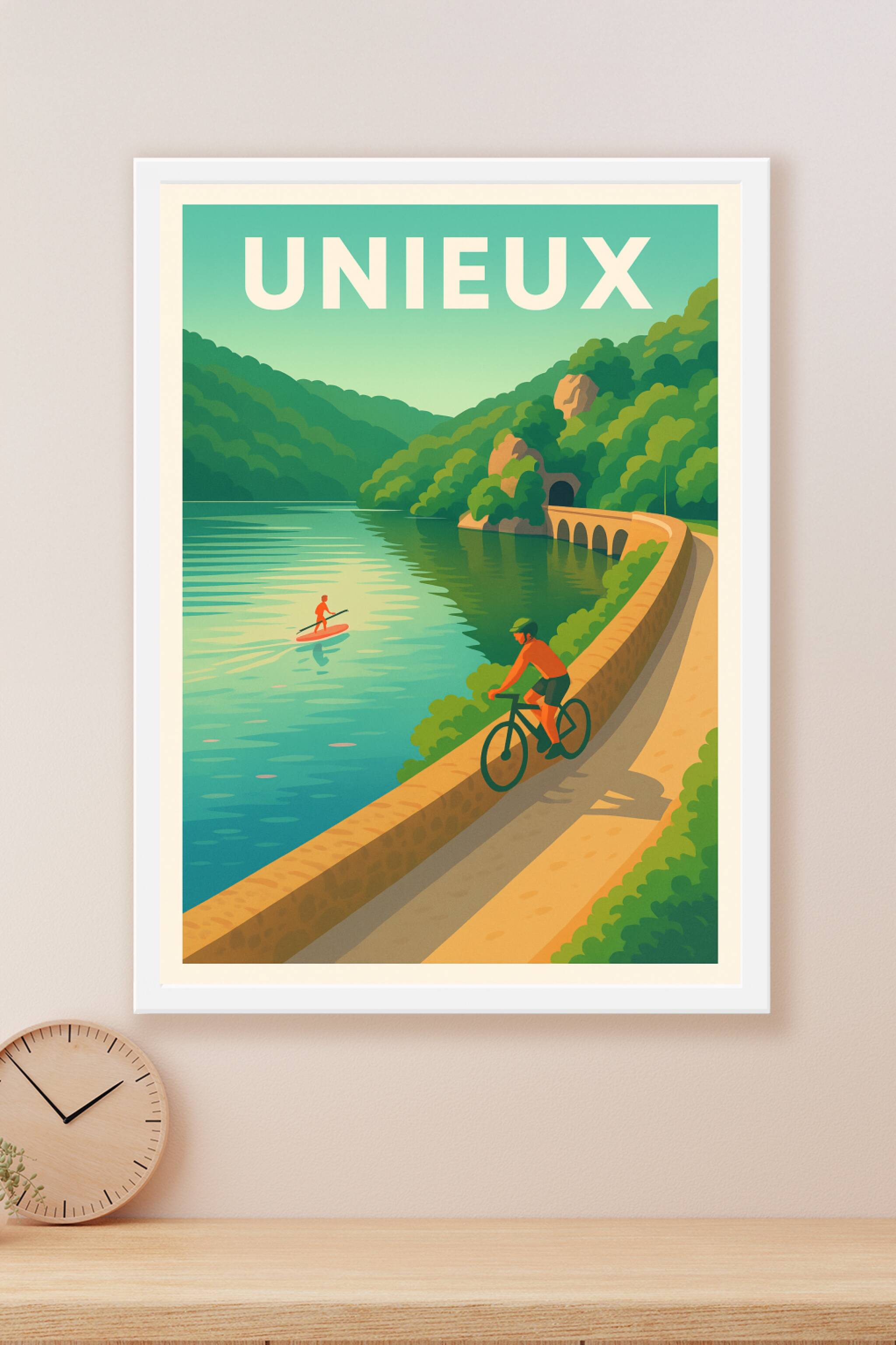 Découvrez la douceur de vivre à Unieux avec cette affiche illustrée au style vintage mettant en scène les activités de plein air au bord de l'eau. Que ce soit à vélo le long des chemins sinueux ou en paddle sur la rivière tranquille, ce poster incarne l'esprit dynamique et apaisant de cette ville. Imprimé en tirage "Fine Art" sur un papier 305g coton de haute qualité, cet article garantit des couleurs vibrantes et une finition raffinée. Disponible en formats A1 à A4, avec ou sans cadre, ce poster s'adapte parfaitement à toutes les envies de décoration. Apportez une touche nature et sportive à votre intérieur avec cette affiche premium, conçue pour les amoureux d'Unieux et des paysages authentiques.