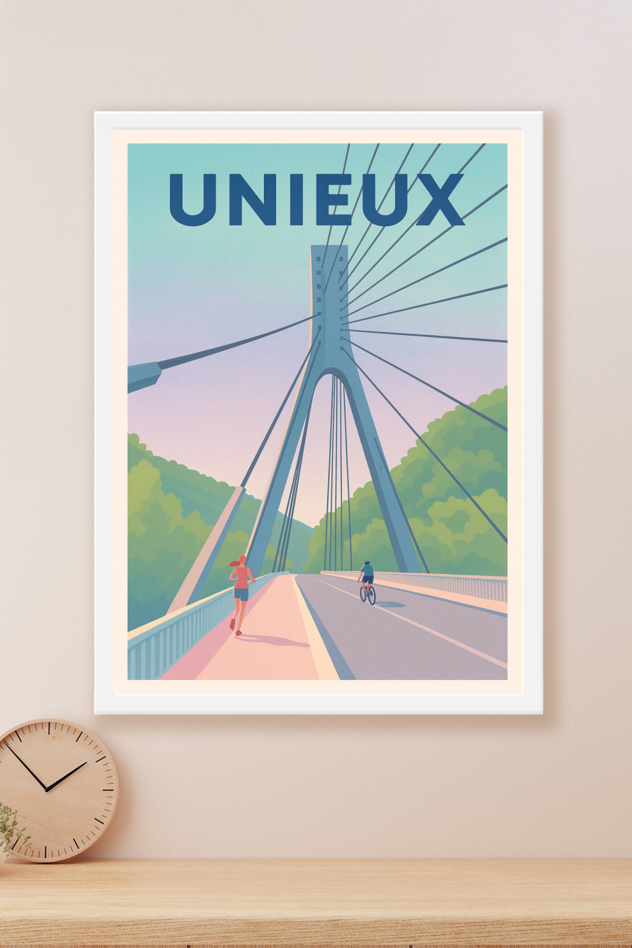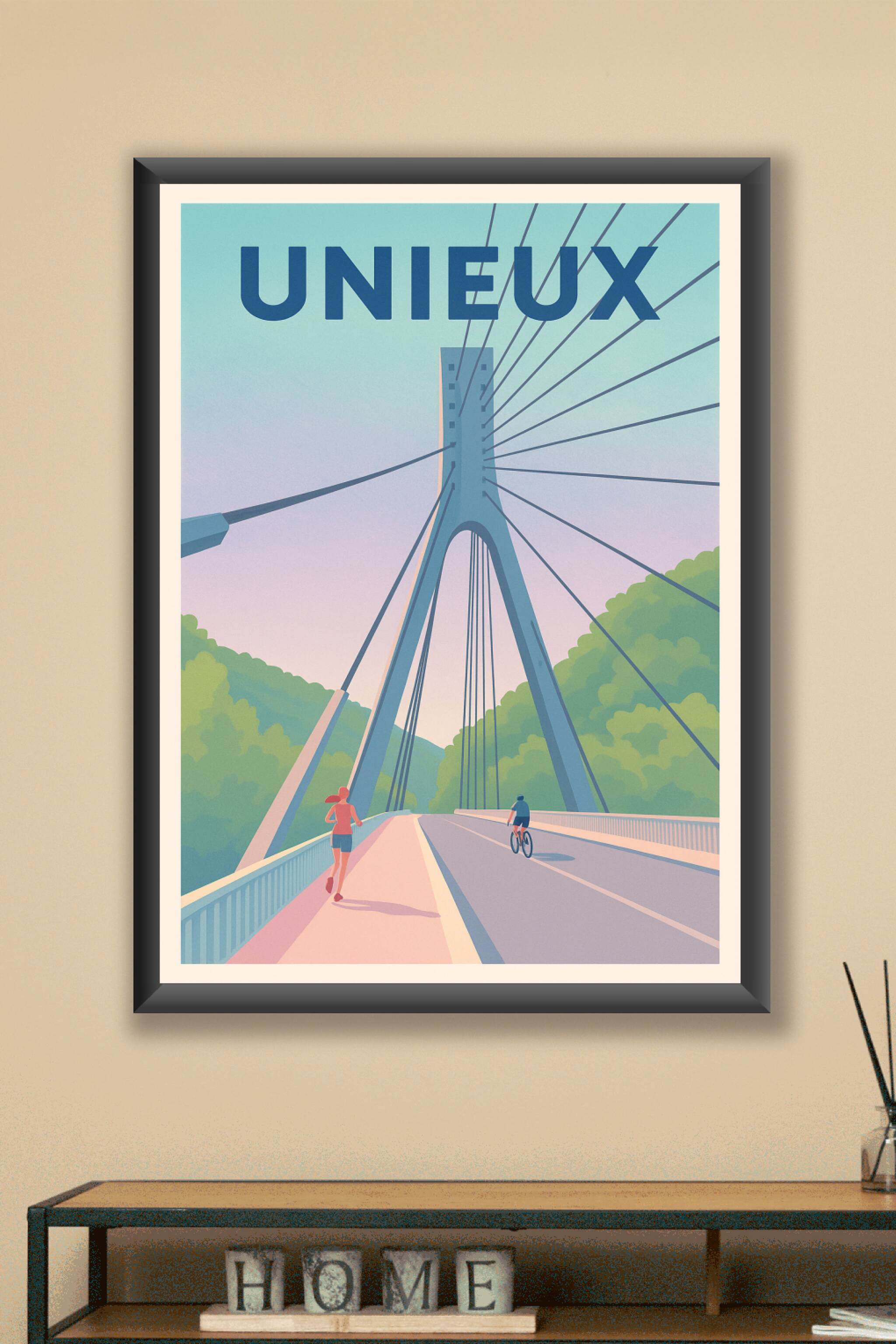 Découvrez l'énergie vibrante d'Unieux à travers cette affiche stylisée mettant en scène son pont emblématique. Entre nature verdoyante et architect...