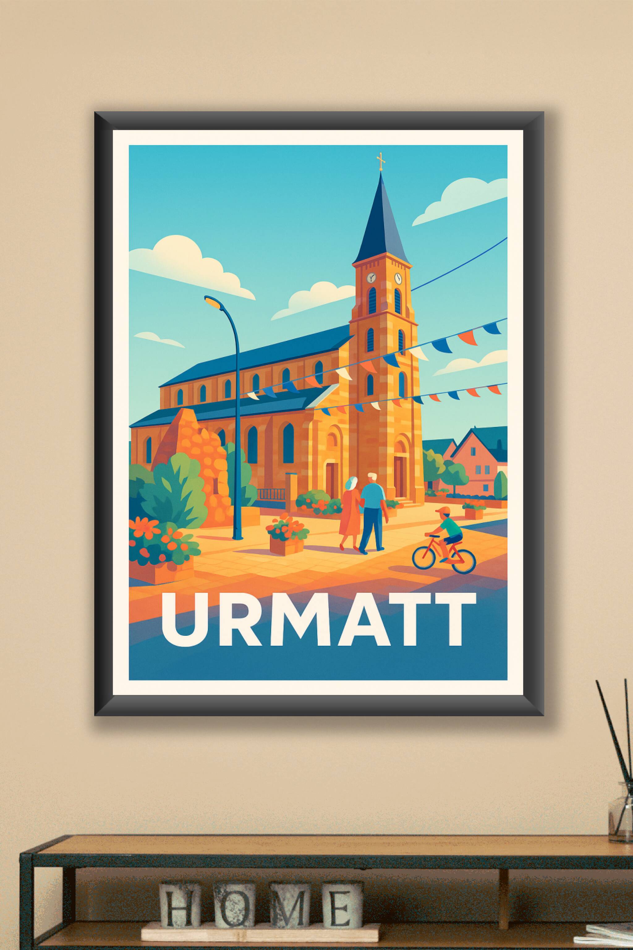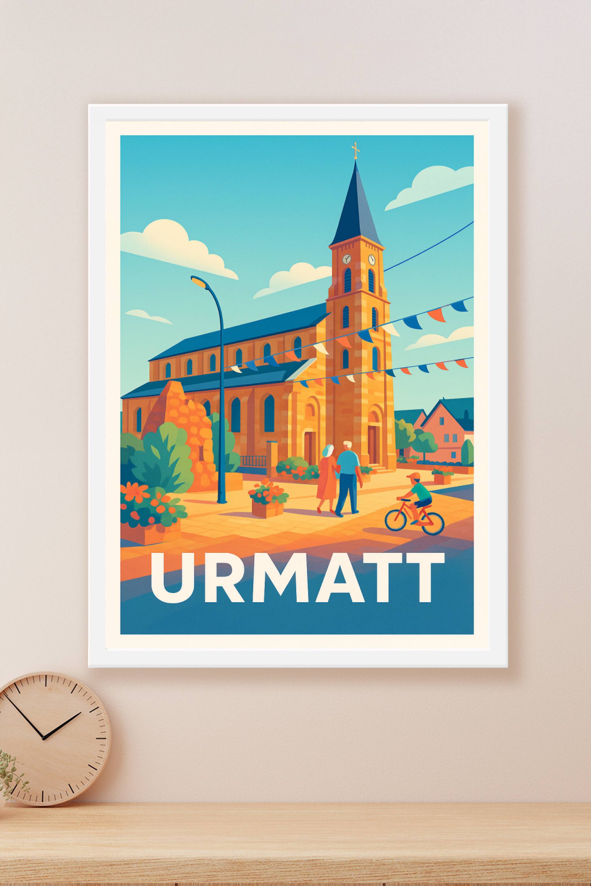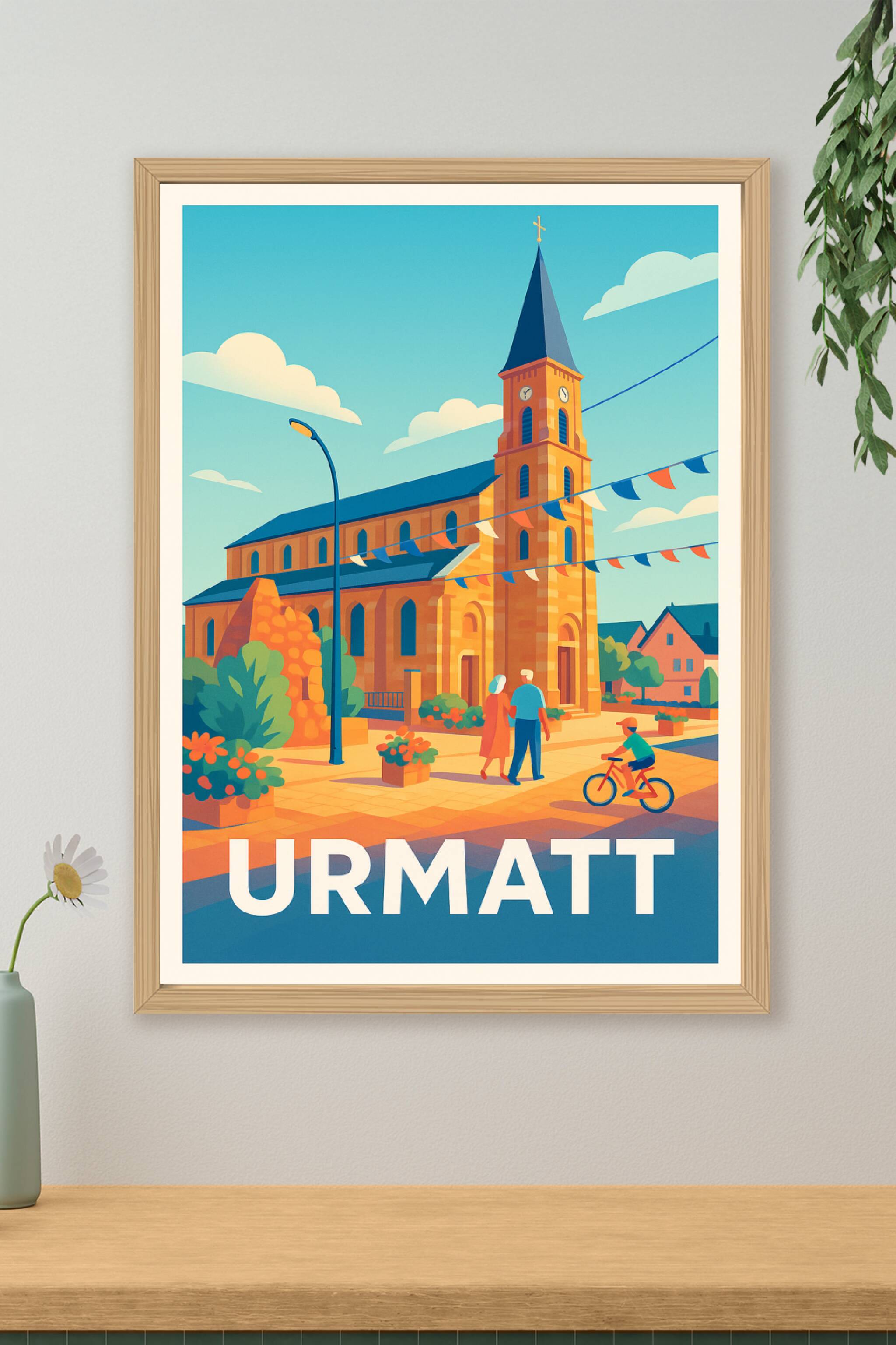 Découvrez l'atmosphère paisible et chaleureuse d'Urmatt avec cette affiche stylisée mettant en scène son église emblématique sous un ciel bleu écla...