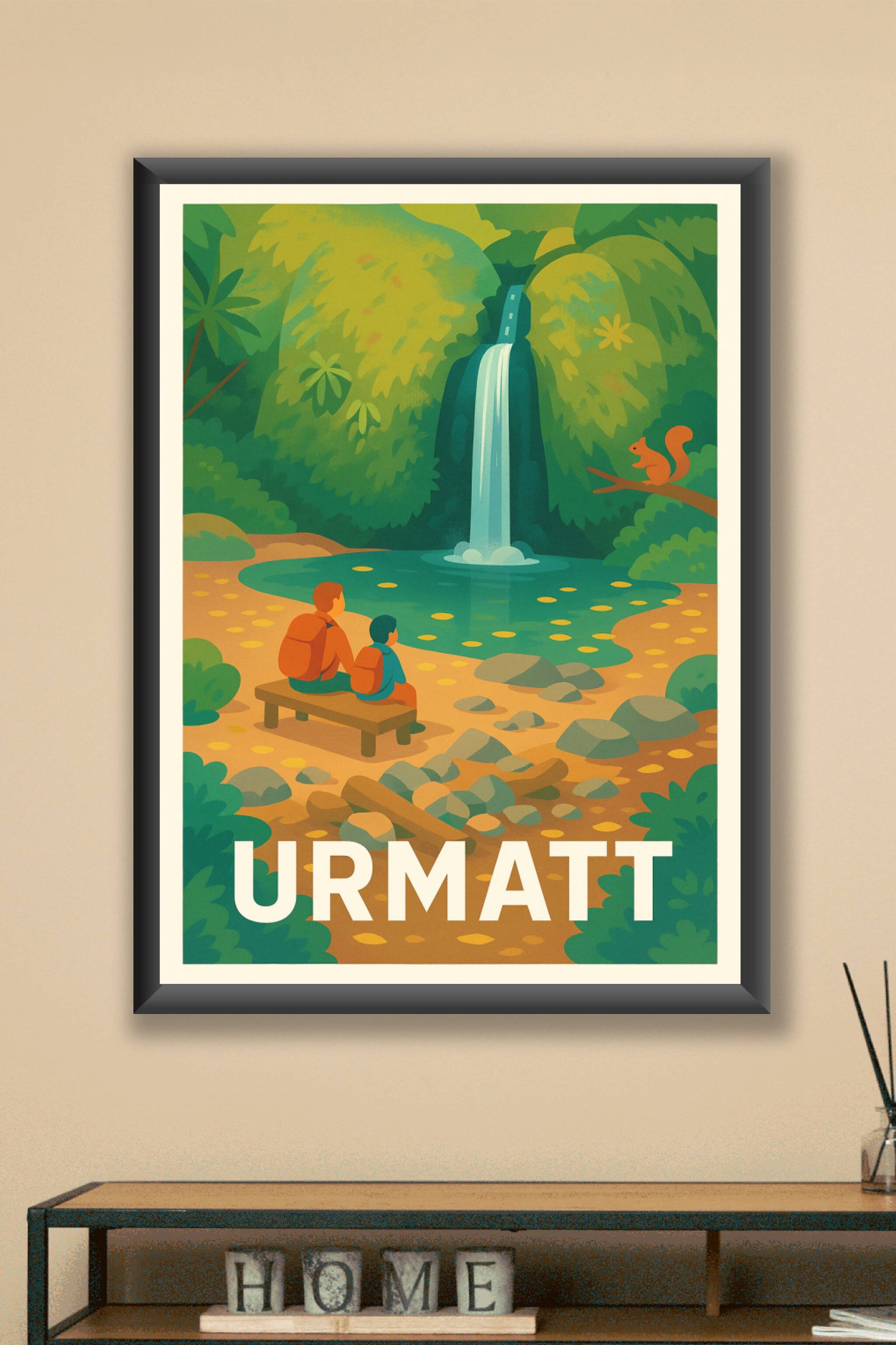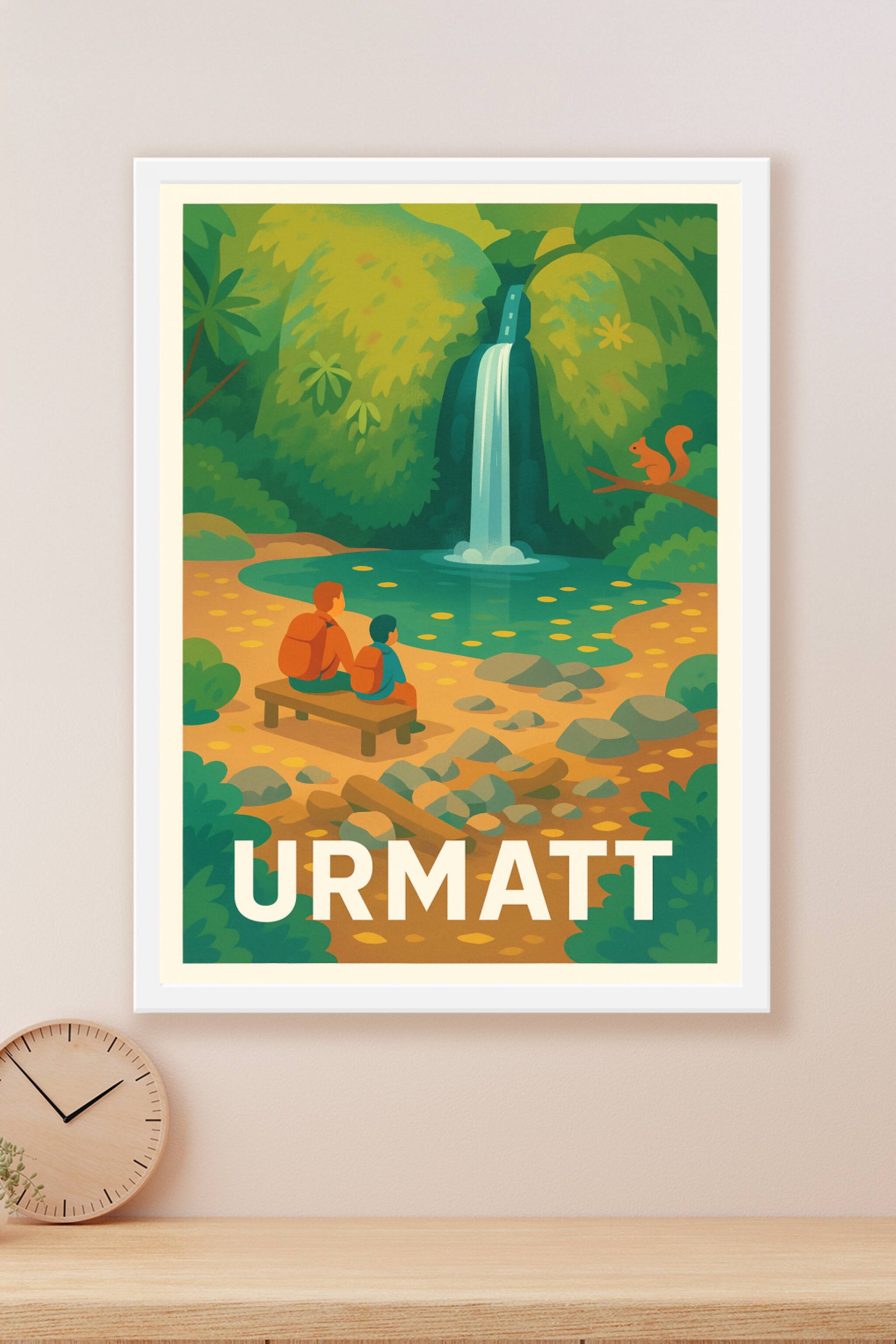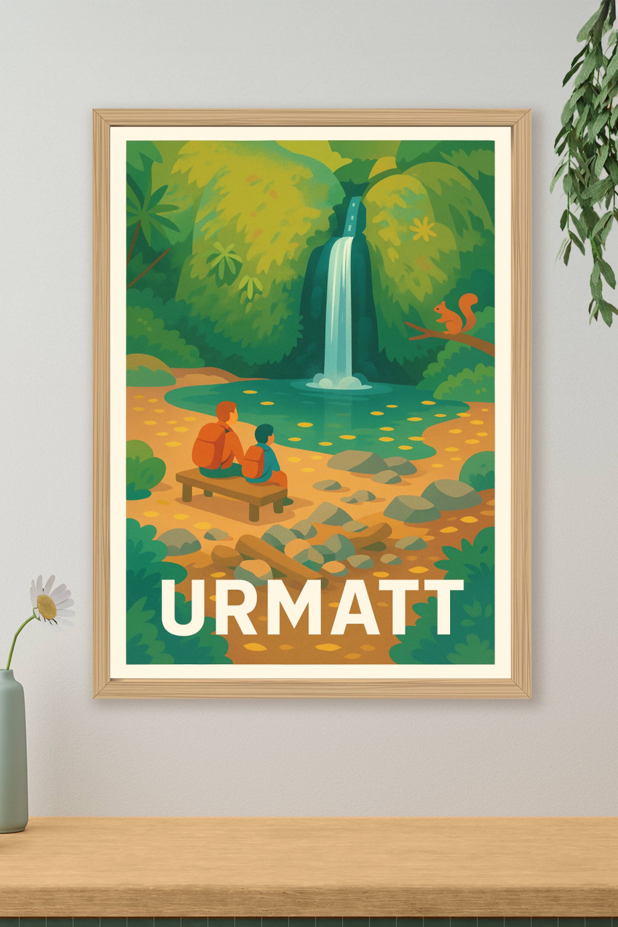 Découvrez la beauté paisible d'Urmatt avec cette affiche au style doux et coloré illustrant une cascade entourée de forêt luxuriante. Deux randonne...
