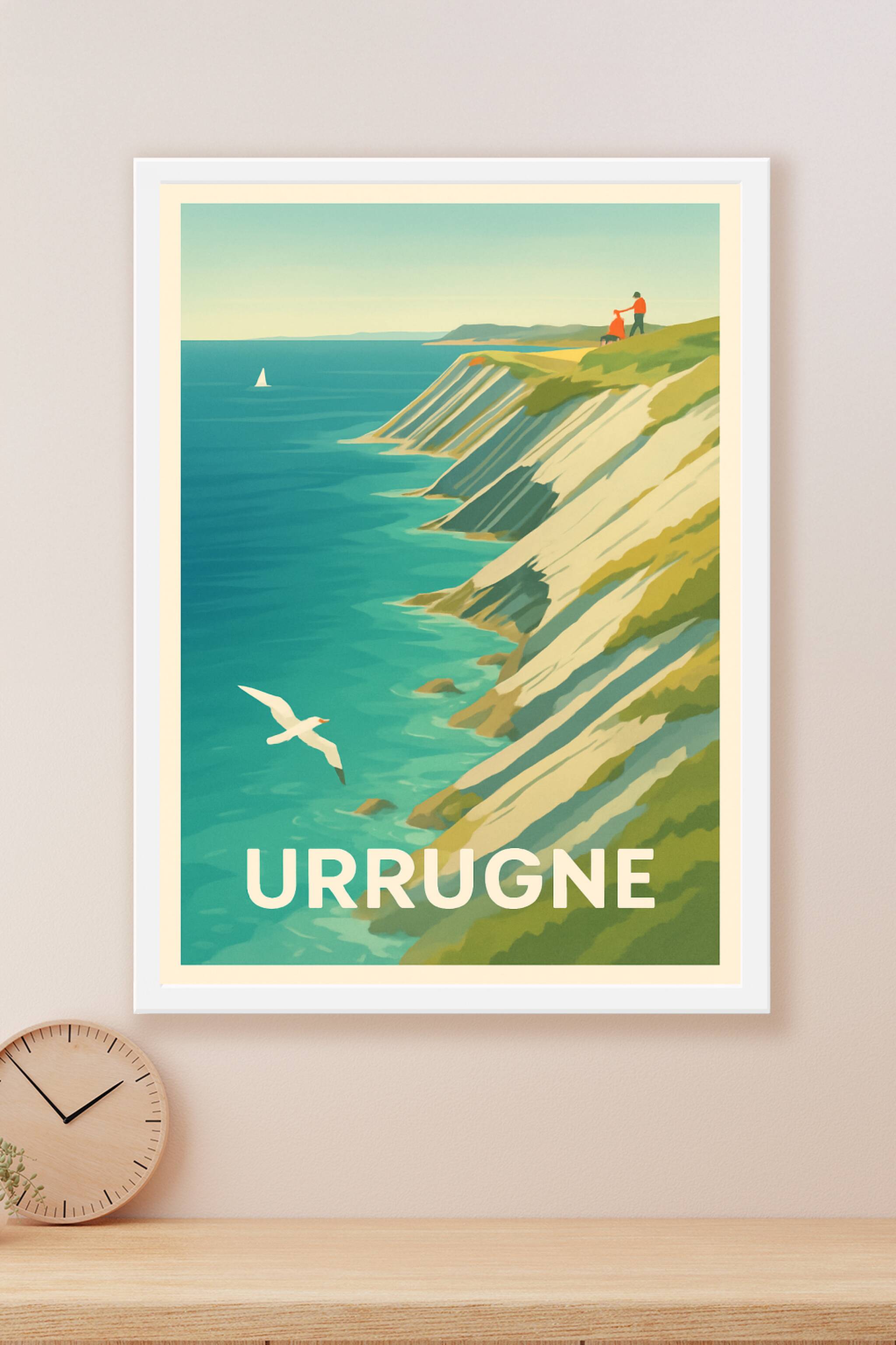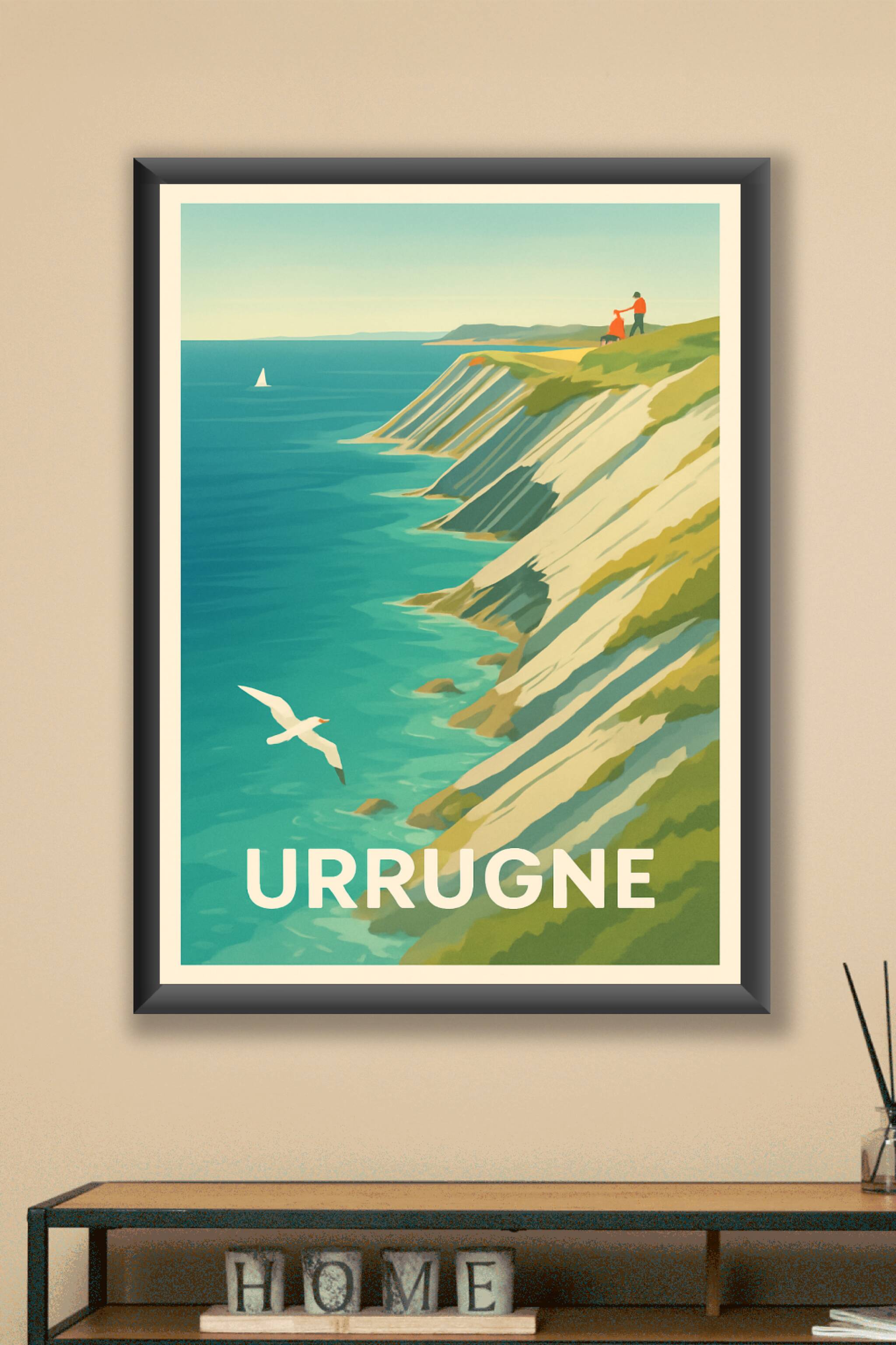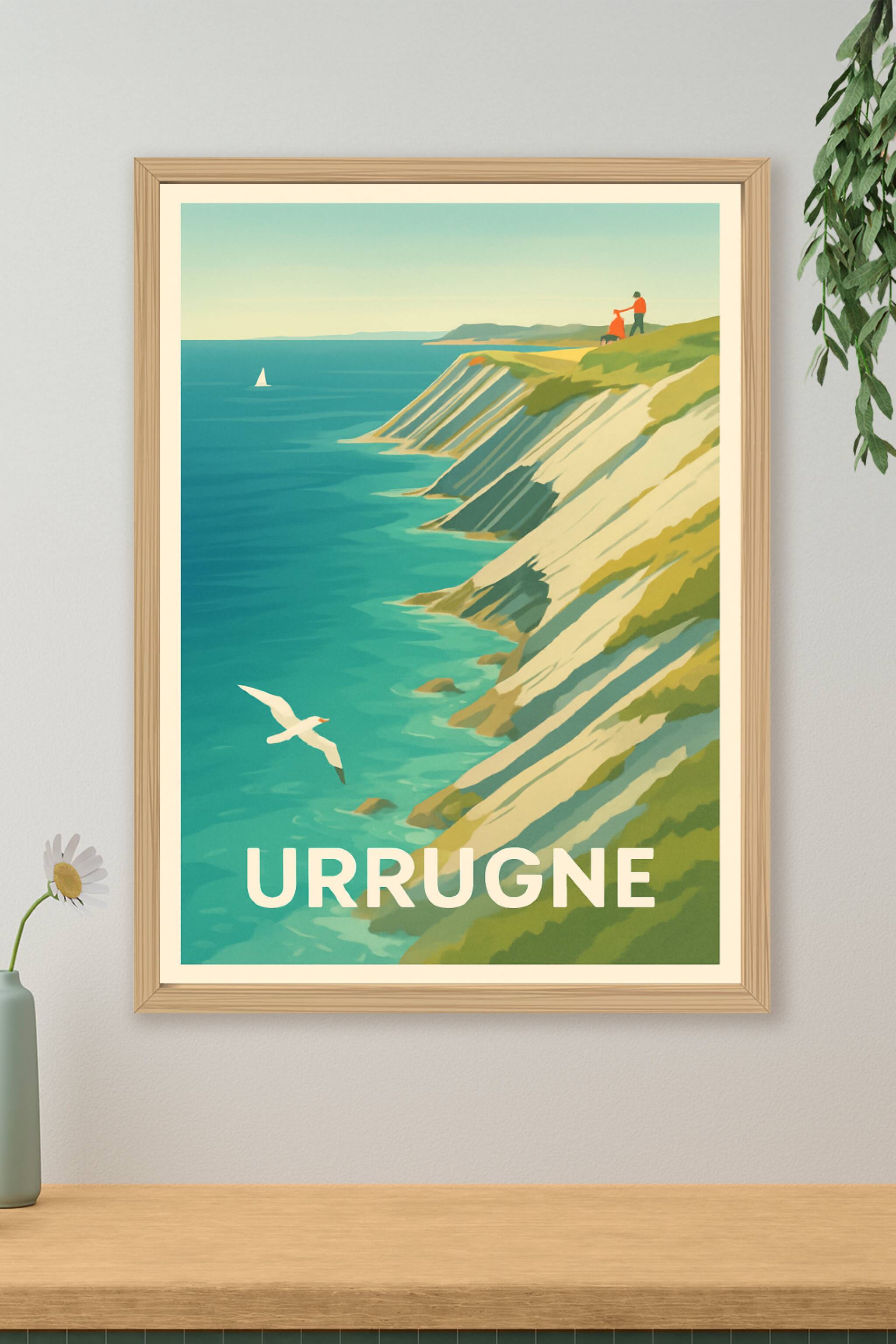 Offrez-vous une bouffée d'air marin avec cette affiche illustrée représentant les majestueuses falaises d'Urrugne, baignées par les eaux turquoise ...