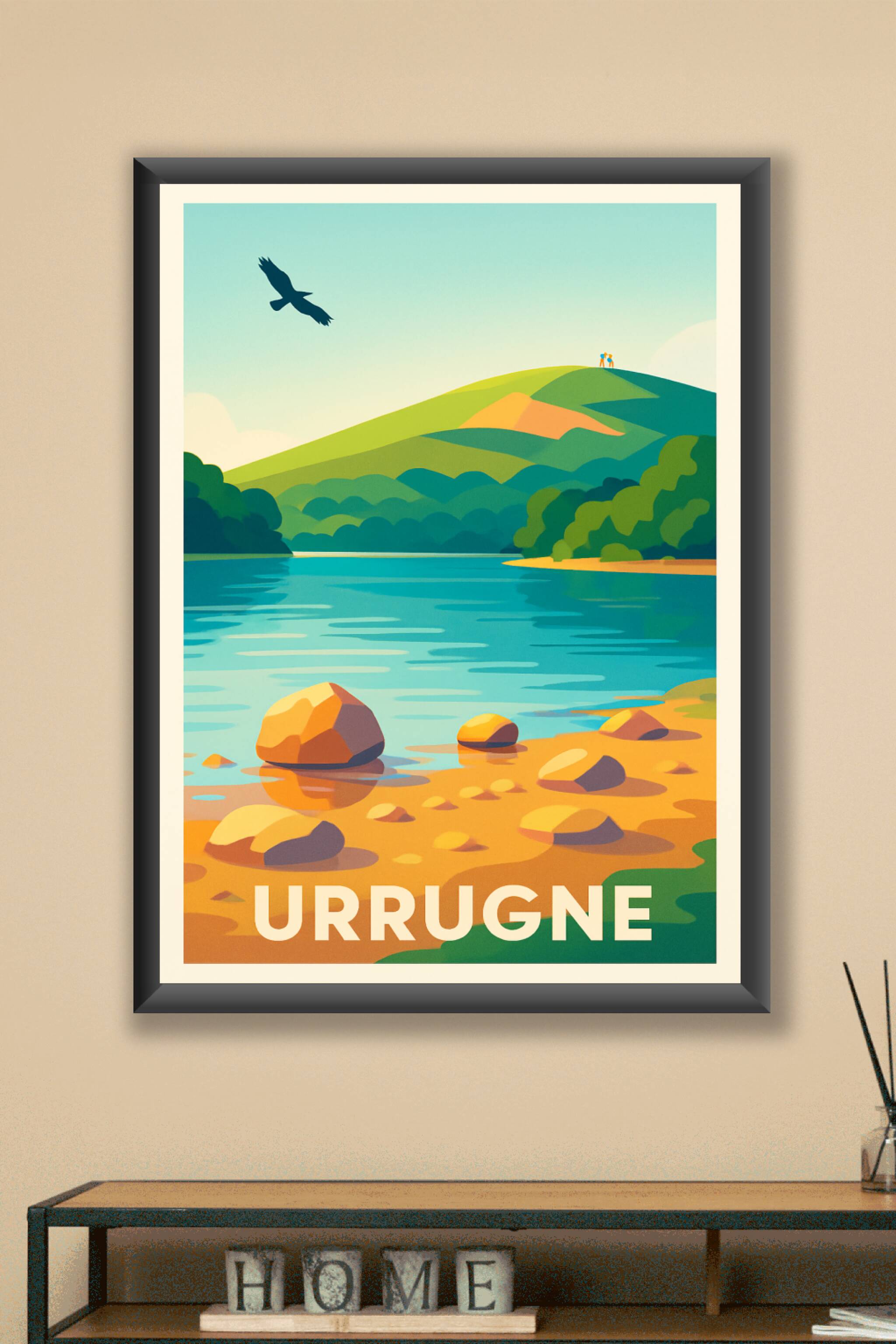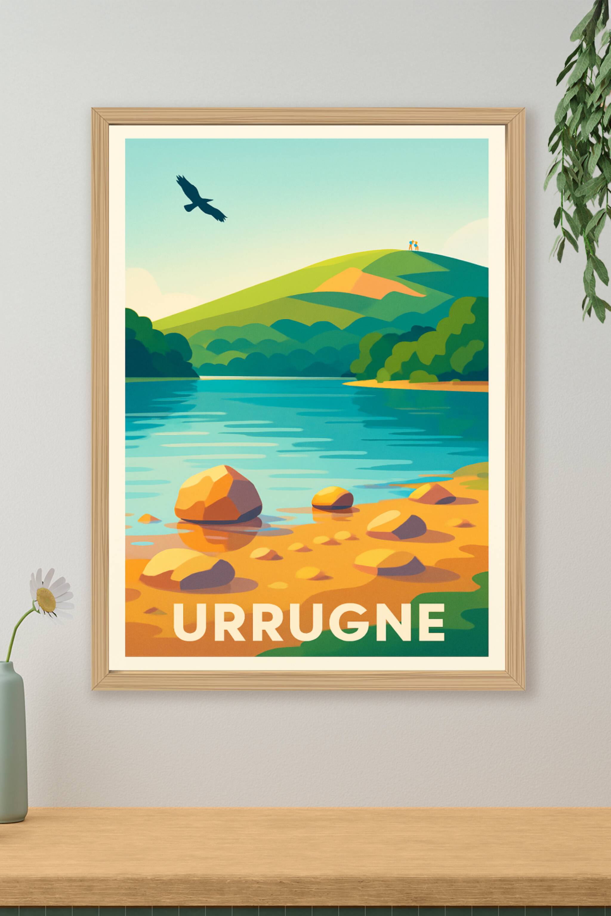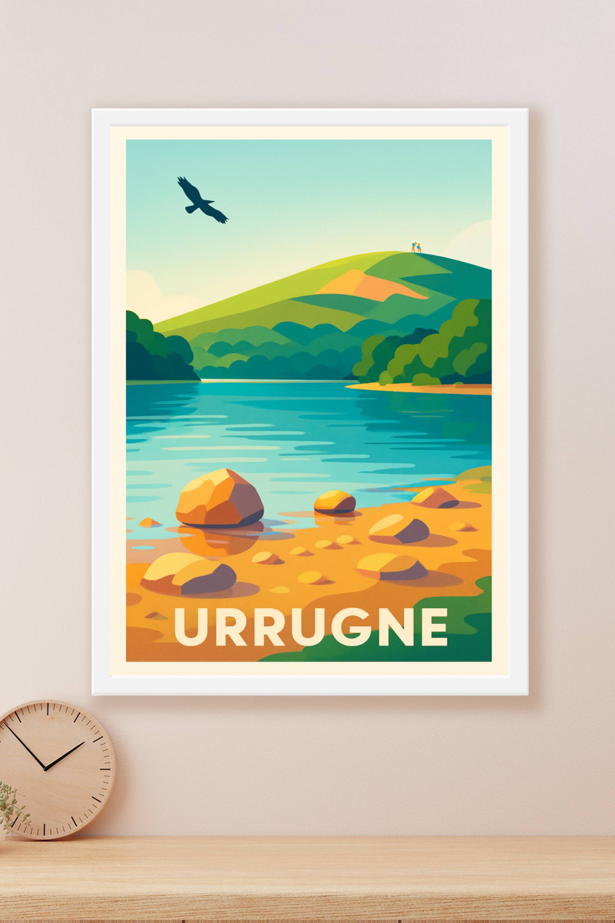 Découvrez la beauté naturelle d'Urrugne à travers cette affiche illustrée mettant en scène un paysage paisible aux couleurs vives et douces. Le poster dévoile une rivière scintillante bordée de rochers et de collines verdoyantes, survolée par un rapace, symbole de liberté et de sérénité. Imprimée en tirage "Fine Art" sur papier coton 305g, cette affiche garantit une qualité d'impression exceptionnelle, avec des couleurs éclatantes et une durabilité optimale. Disponible en formats de A1 à A4, avec ou sans cadre, ce poster est idéal pour apporter une touche de fraîcheur et d'authenticité à votre décoration intérieure. Offrez ou offrez-vous un souvenir élégant et raffiné de cette destination lors de votre prochaine visite à Urrugne.