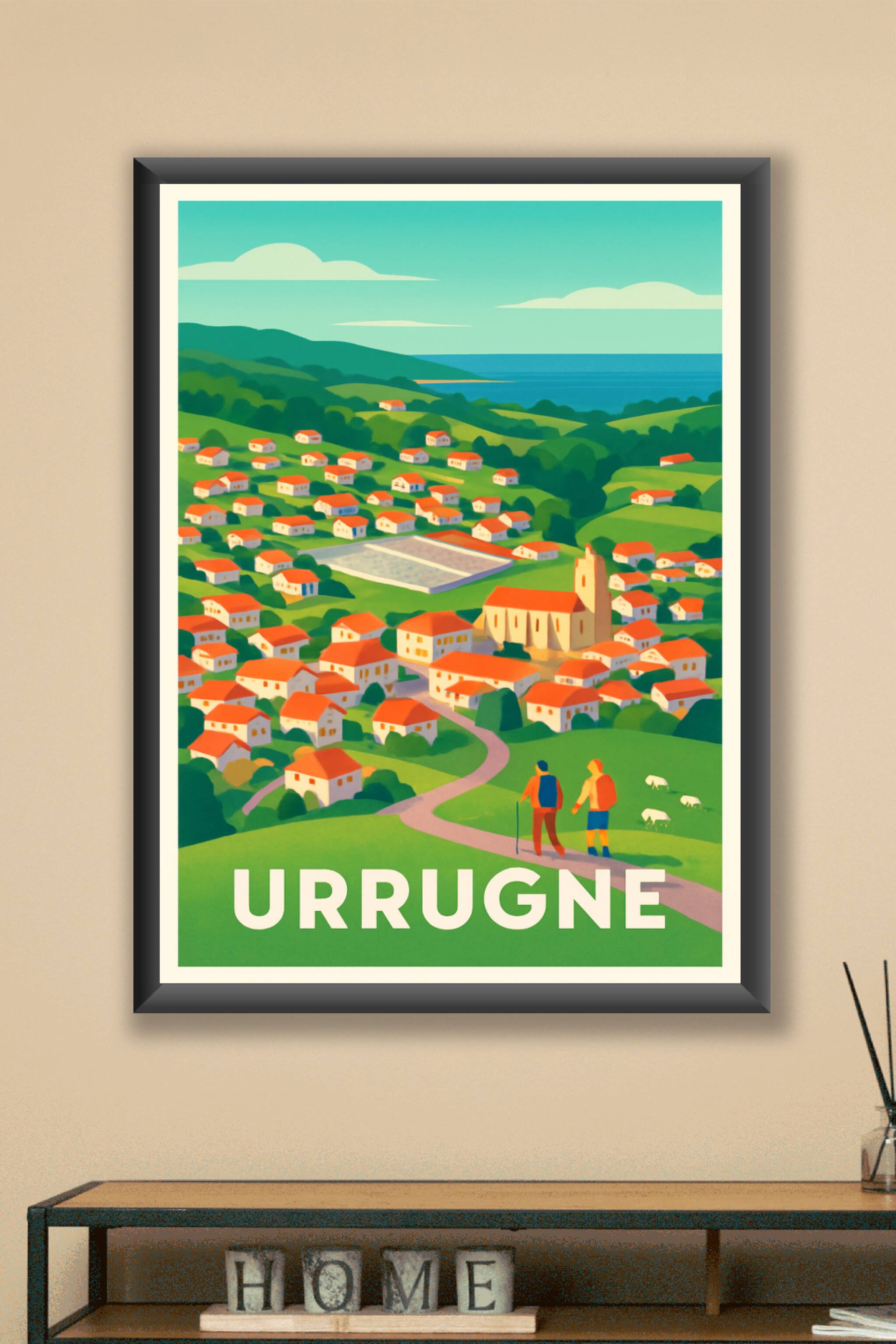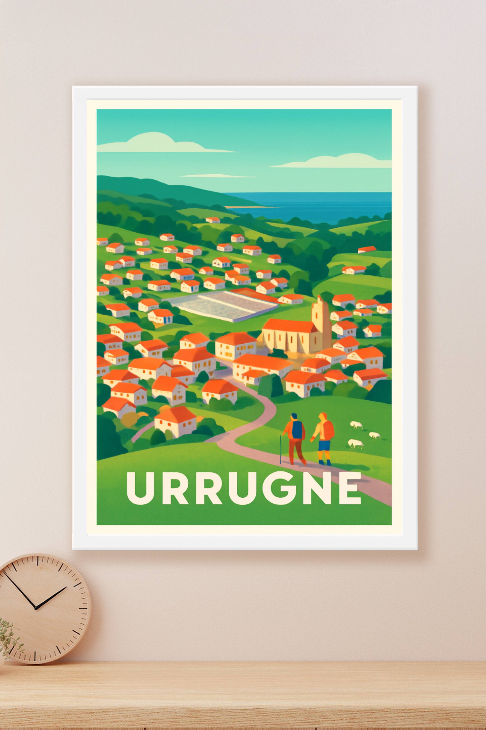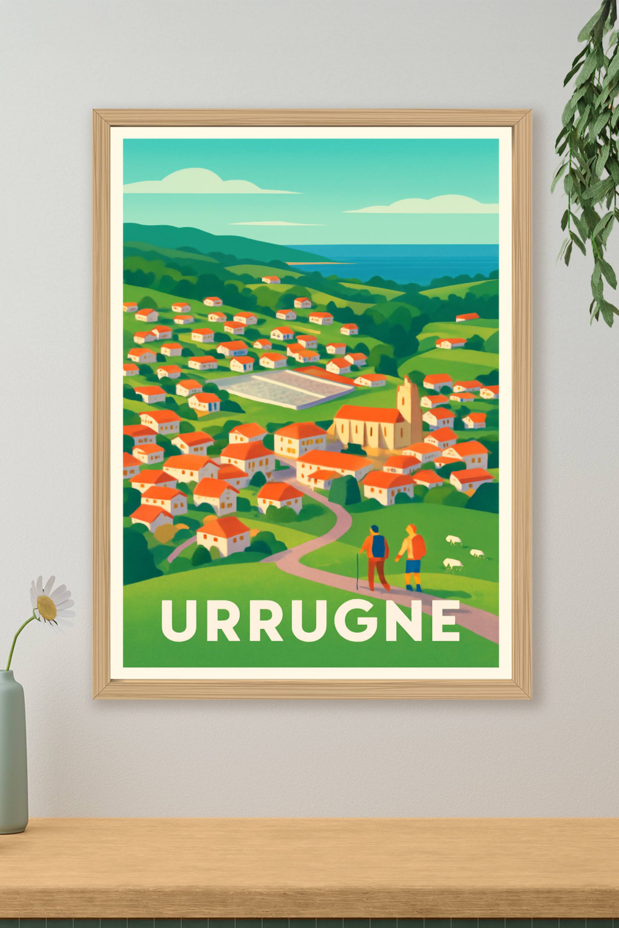 Découvrez la quiétude et la beauté naturelle d'Urrugne illustrées sur cette affiche au style coloré et épuré. Ce poster met en valeur les maisons t...