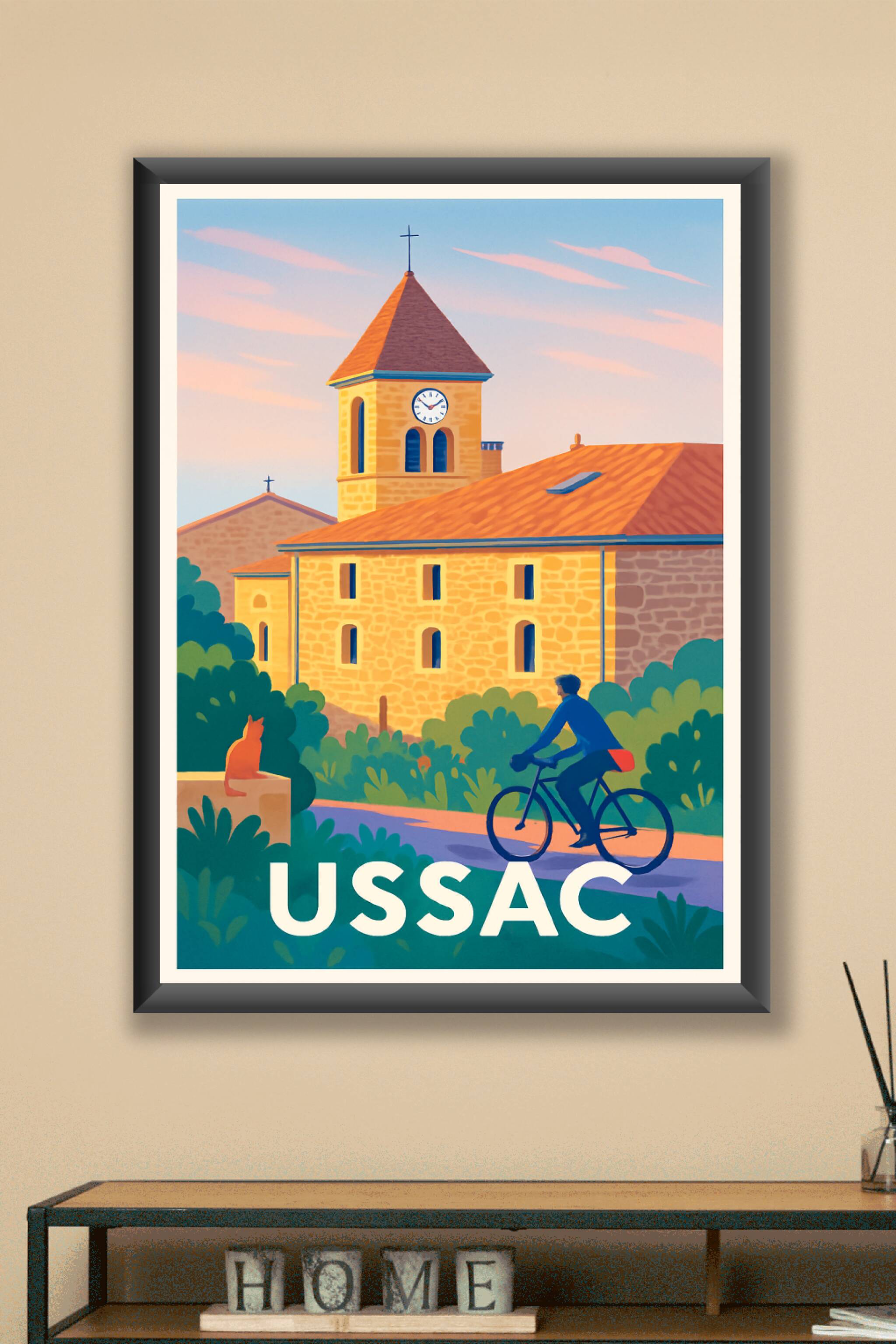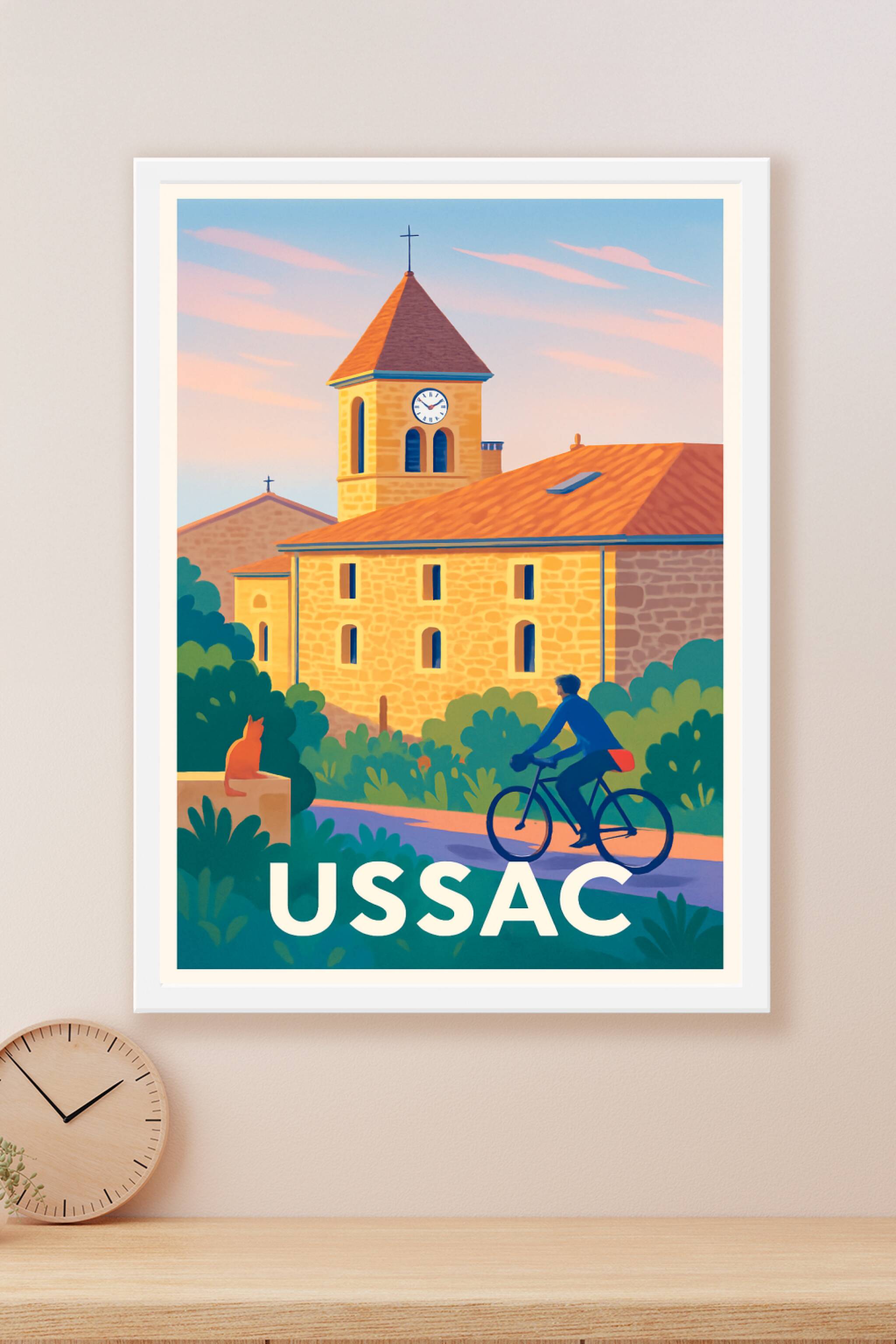 Découvrez l'affiche Ussac, une invitation à la tranquillité de la campagne corrézienne avec ses pierres dorées baignées par une lumière douce. L'illustration met en scène un cycliste paisible et un chat observateur, symboles d'une vie simple et apaisante. Ce poster est imprimé en tirage "Fine Art" sur papier 305g coton pour une qualité d'impression exceptionnelle et une longévité garantie. Disponible en formats A1 à A4, avec ou sans cadre, cette affiche se prête parfaitement à une décoration chaleureuse et raffinée. Apportez une touche authentique à votre intérieur ou offrez un souvenir élégant aux amoureux de la nature et des petits villages français.