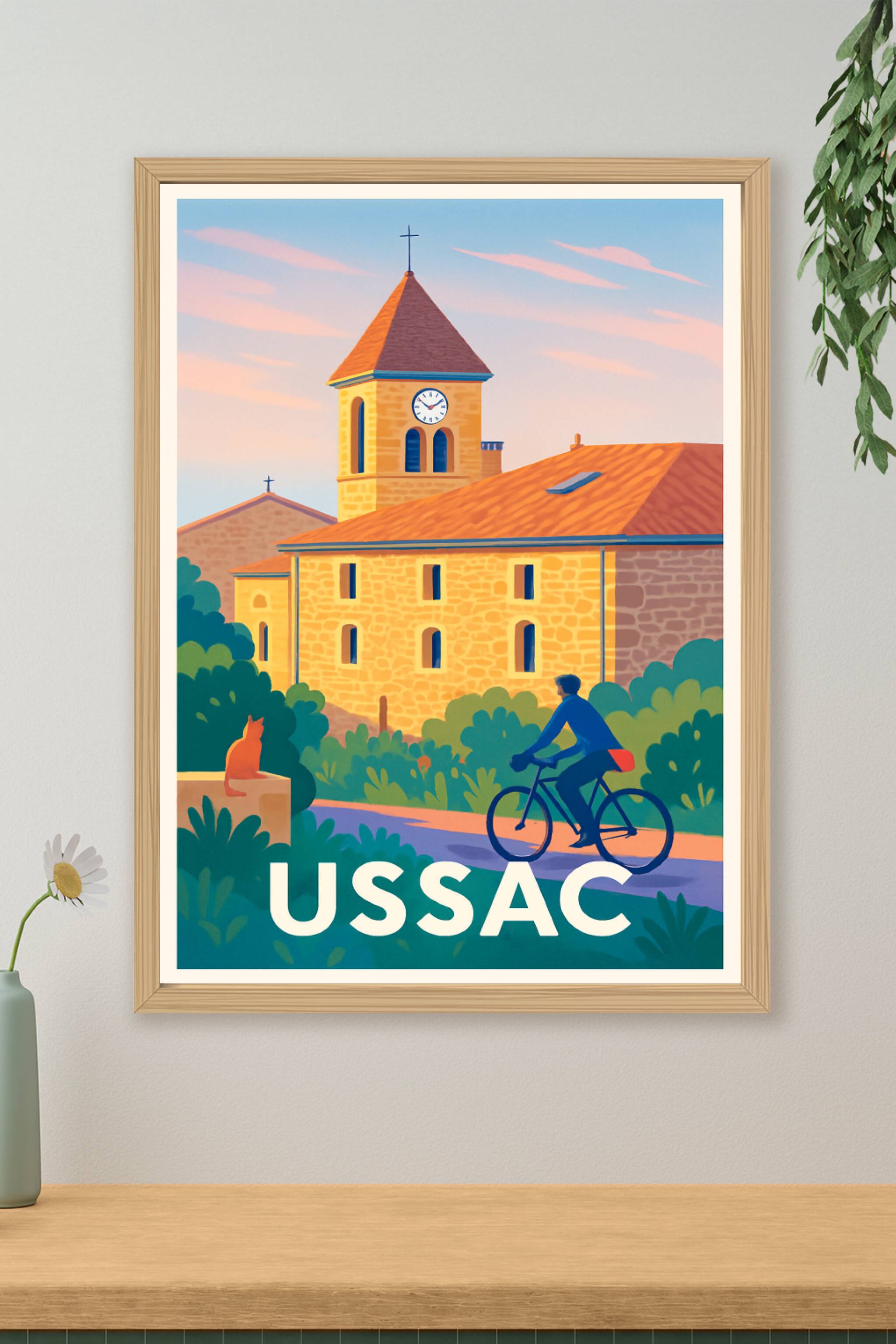 Découvrez l'affiche Ussac, une invitation à la tranquillité de la campagne corrézienne avec ses pierres dorées baignées par une lumière douce. L'il...