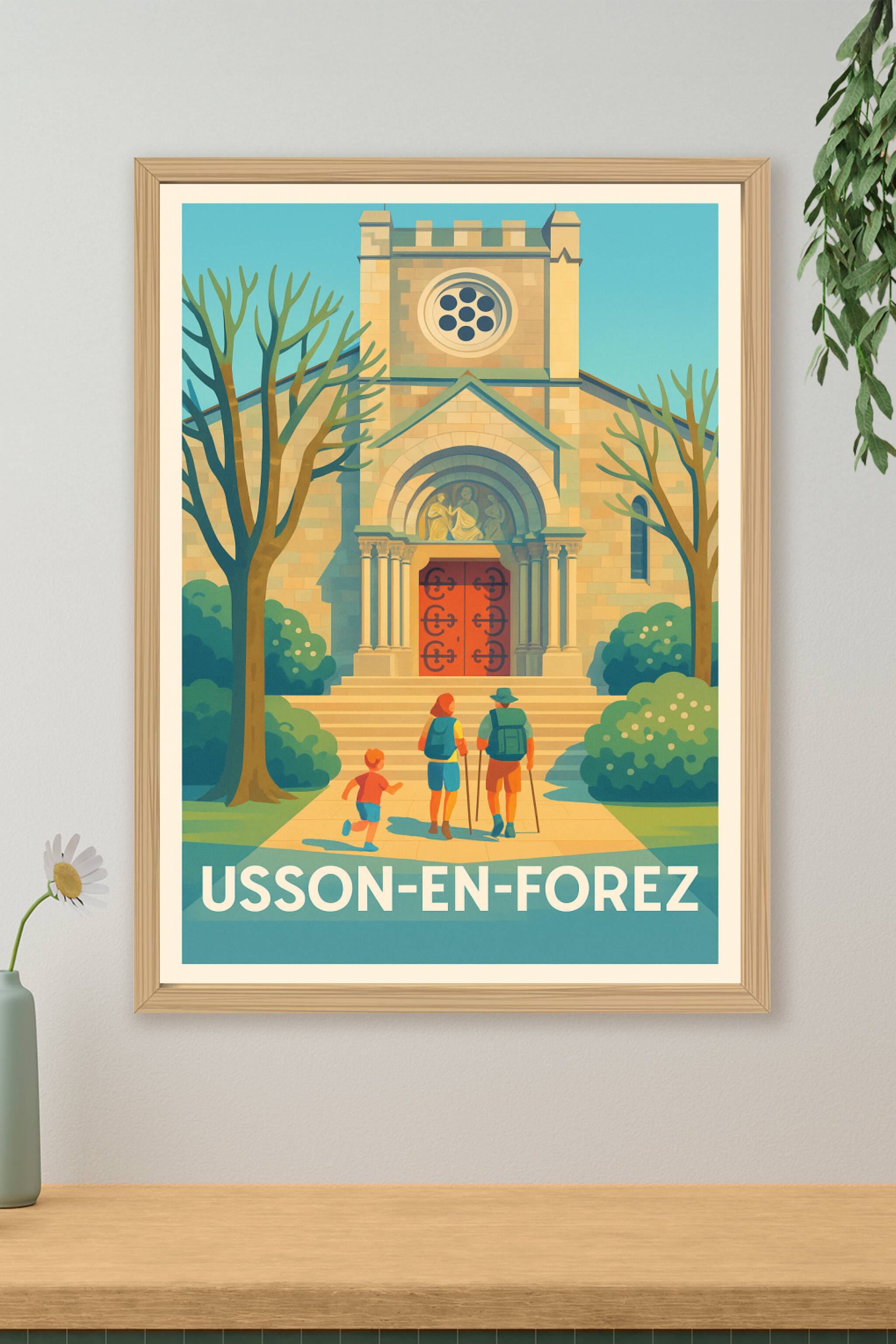 Découvrez l'élégance intemporelle d'Usson-en-Forez avec cette affiche illustrée mettant en scène une scène de randonnée vers un monument majestueux...