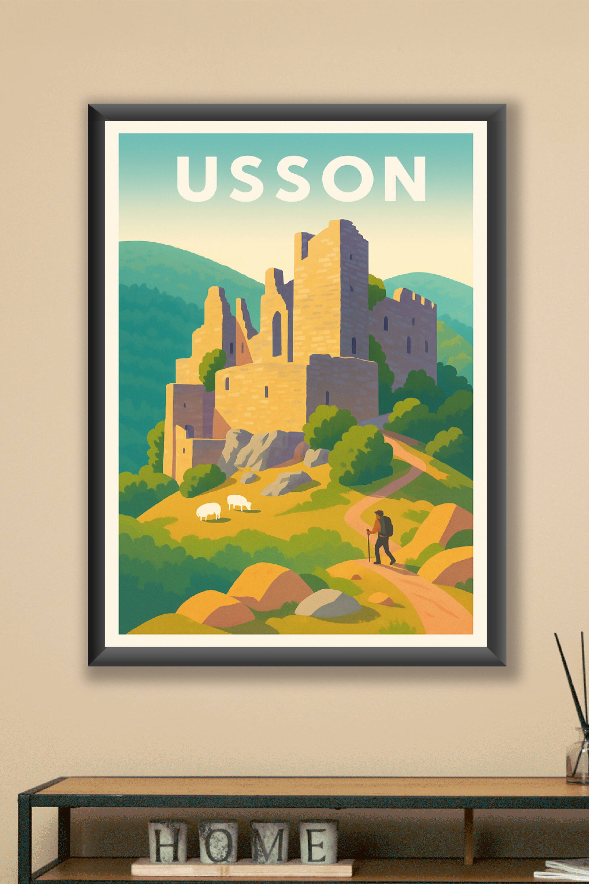 Découvrez le charme authentique d'Usson avec cette superbe affiche illustrée représentant les ruines emblématiques nichées dans un paysage vallonné...