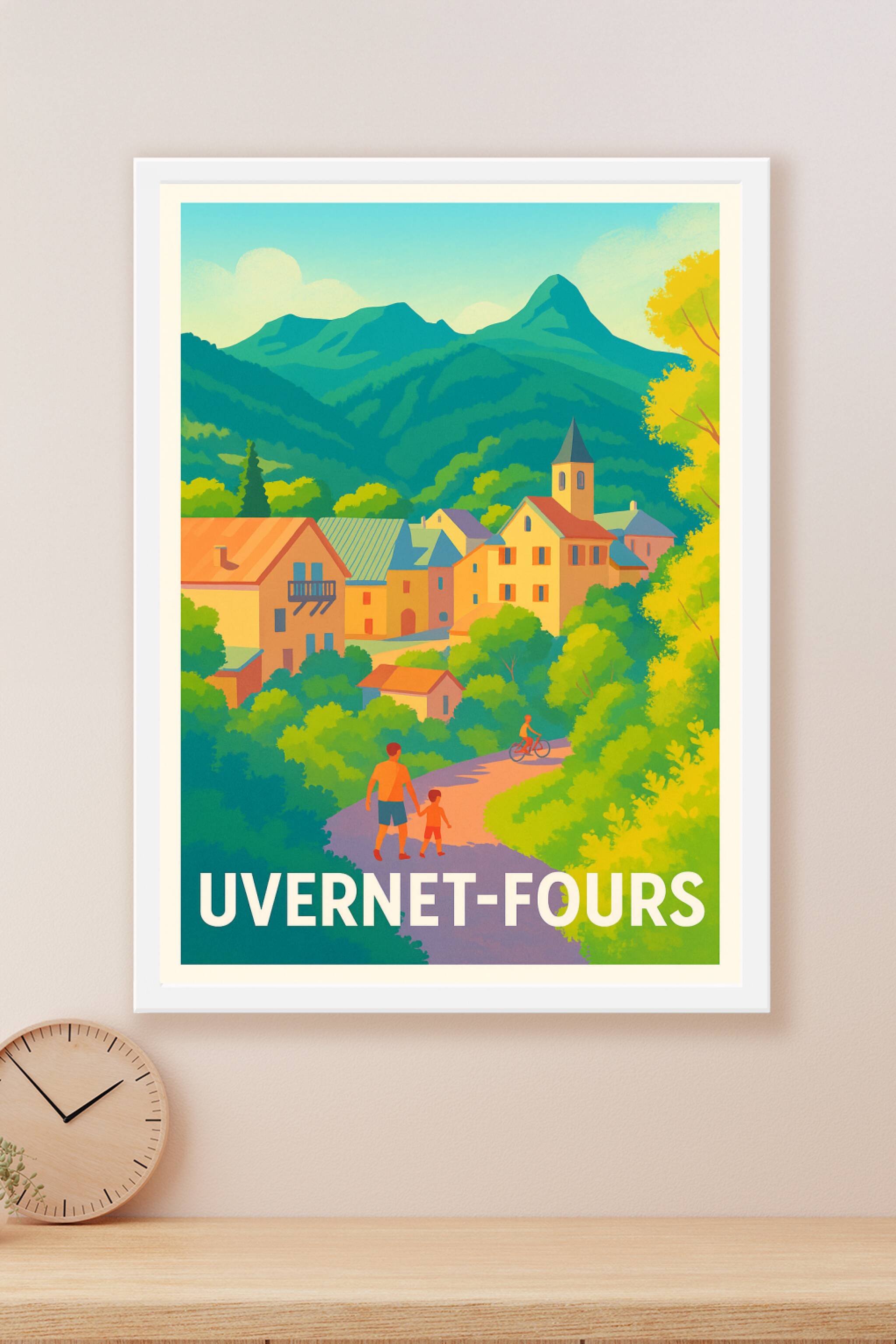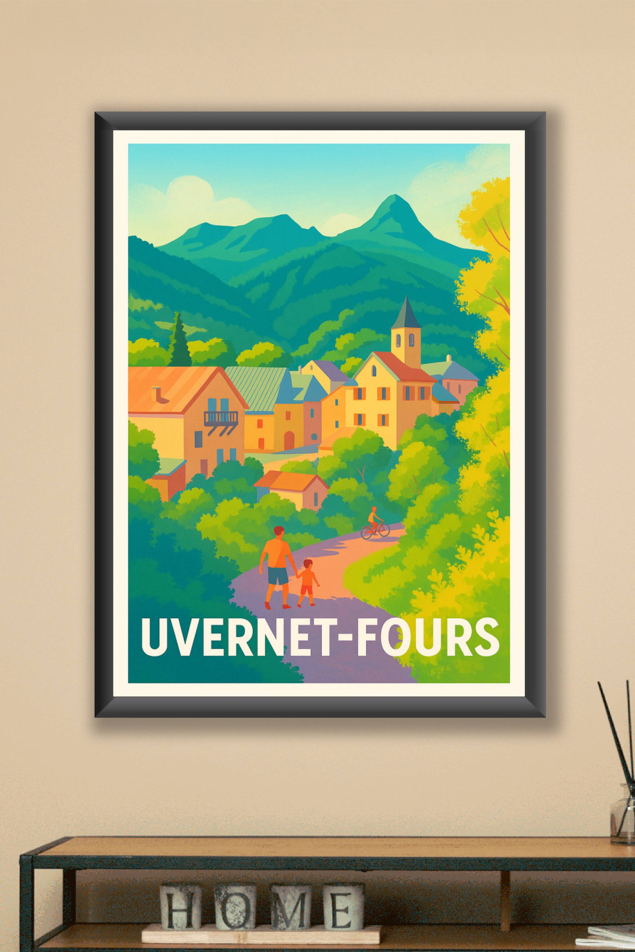 Découvrez la douceur de vivre d'Uvernet-Fours à travers cette affiche illustrée aux couleurs vives et apaisantes, capturant l'essence d'un petit vi...