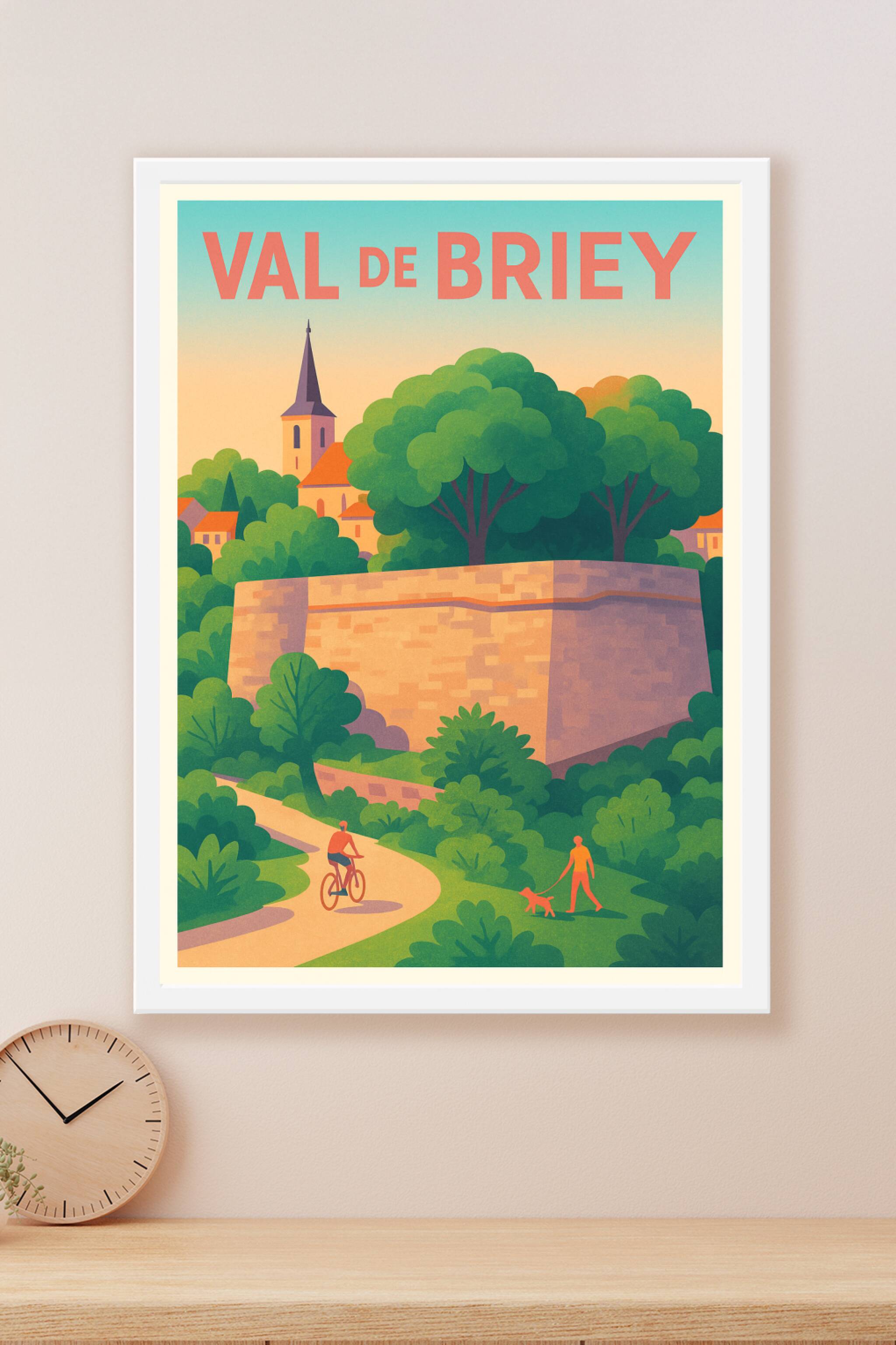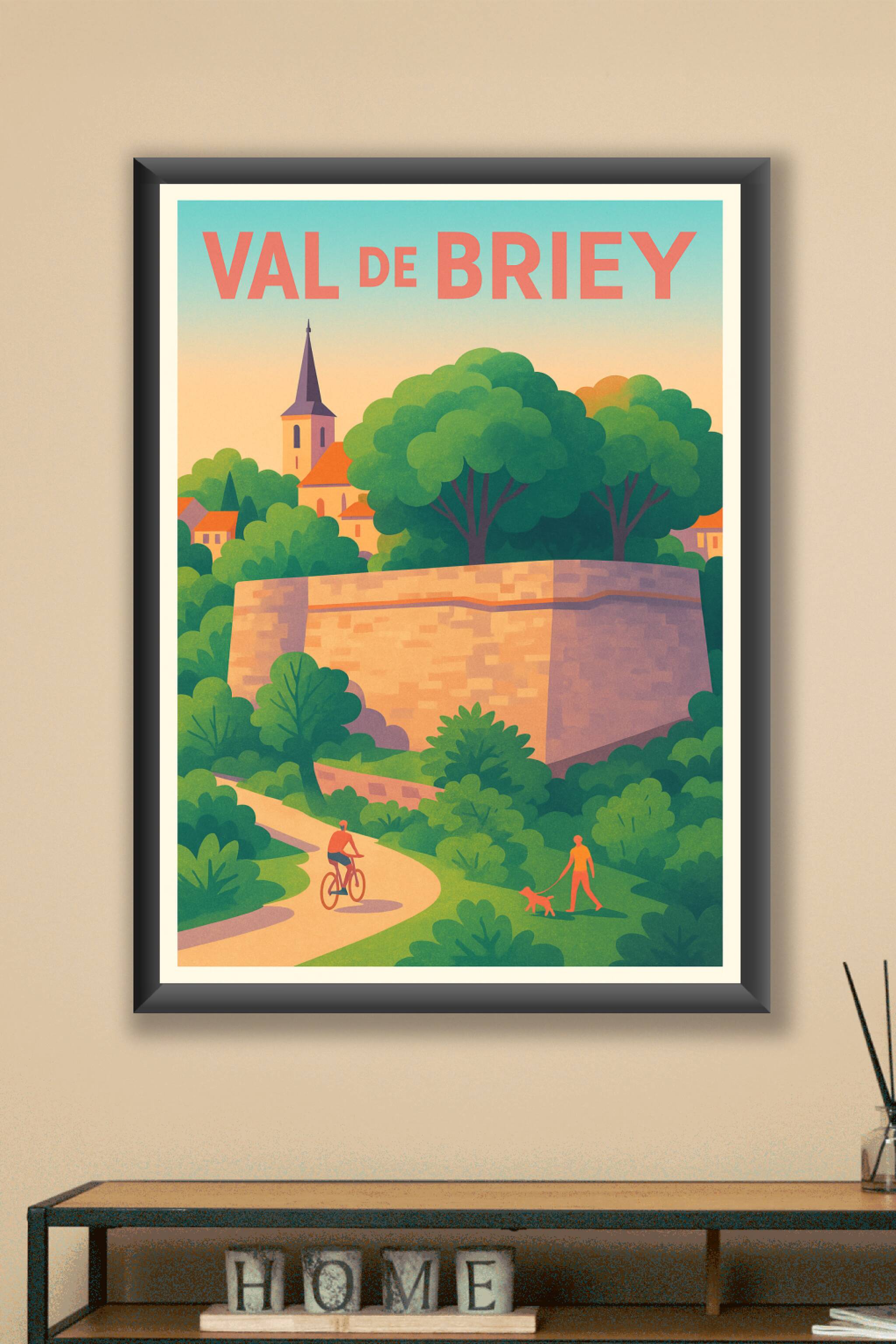Découvrez la sérénité du Val de Briey à travers cette affiche illustrée aux couleurs douces et apaisantes. Le poster met en scène un paysage verdoy...