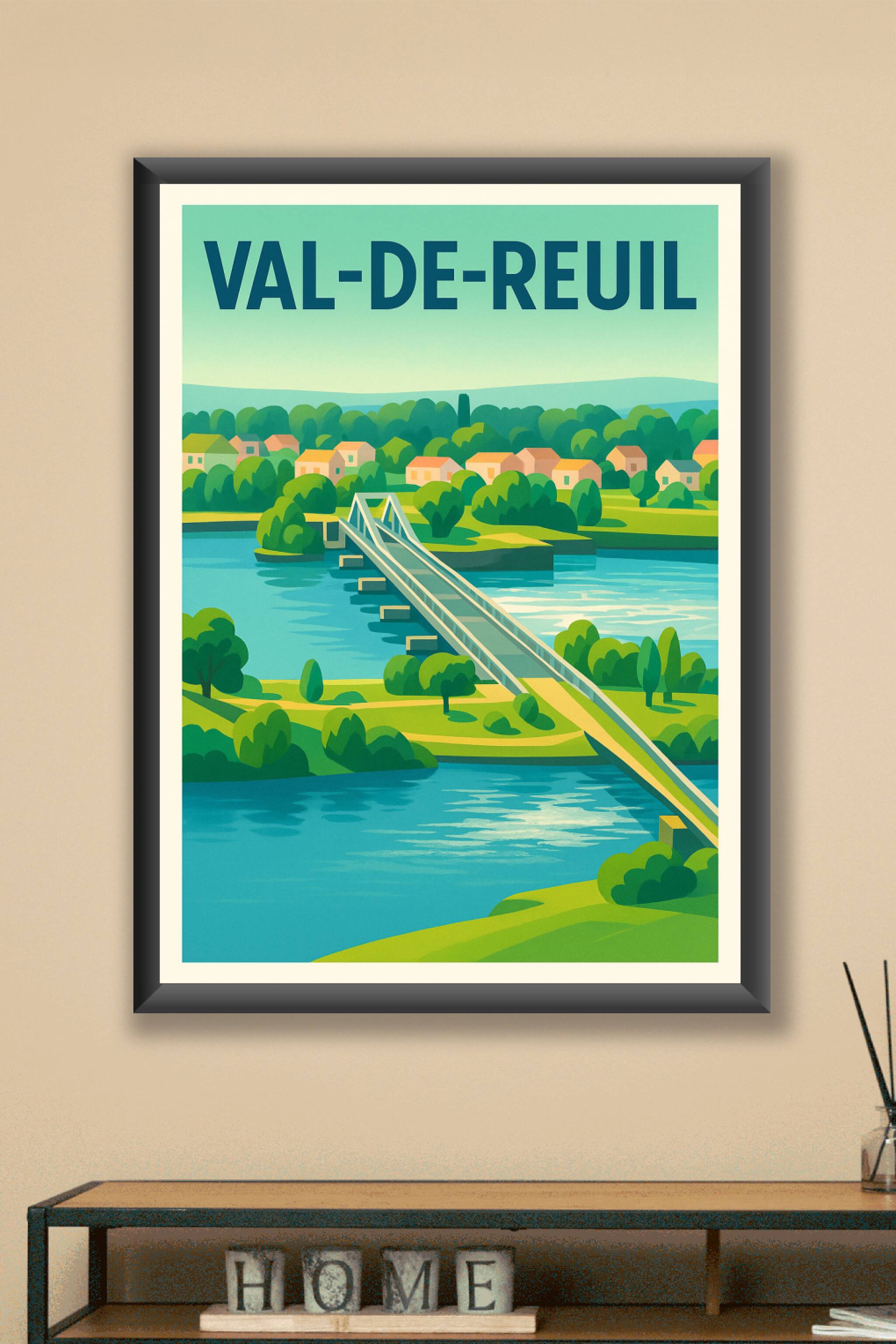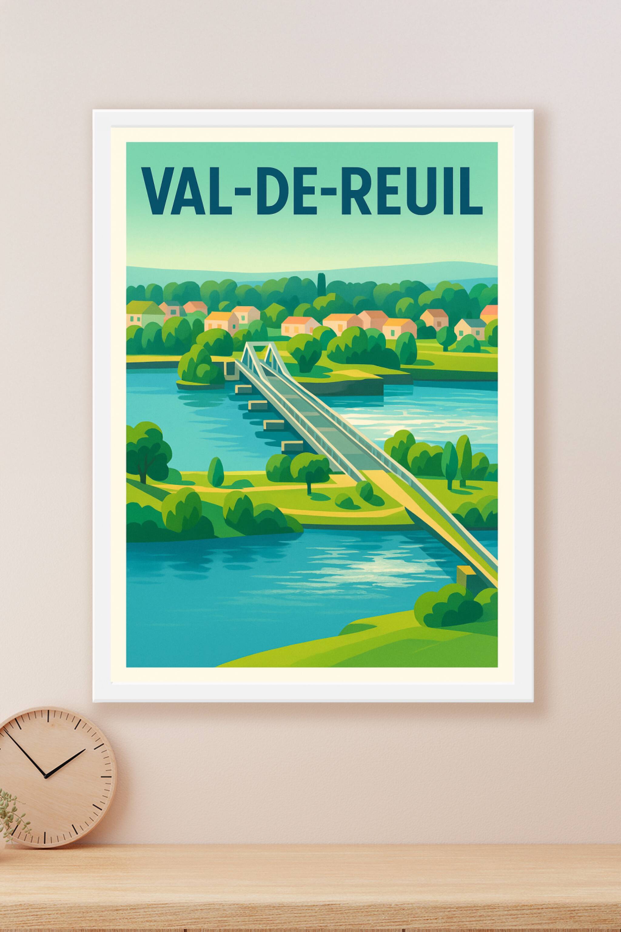 Découvrez la sérénité et la beauté du paysage verdoyant de Val-de-Reuil à travers cette affiche au graphisme épuré et coloré. Le poster met en avan...