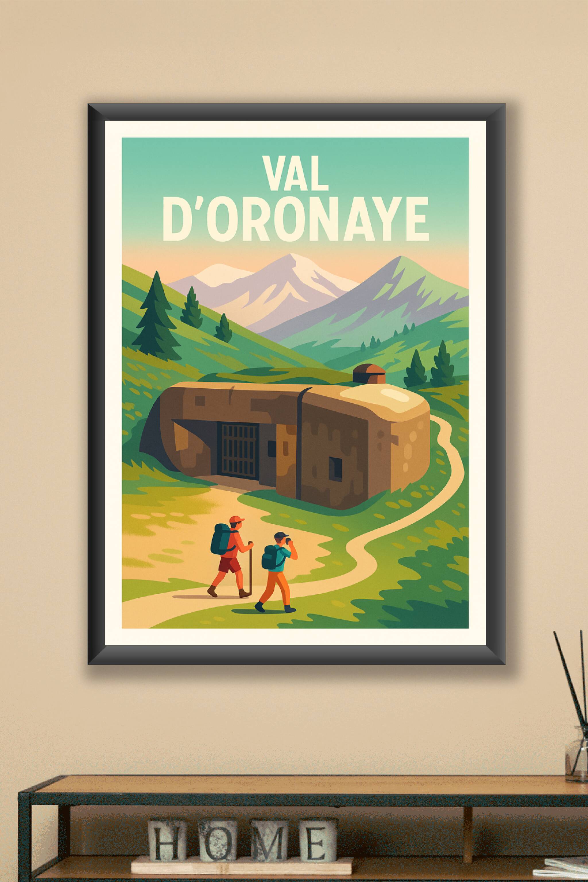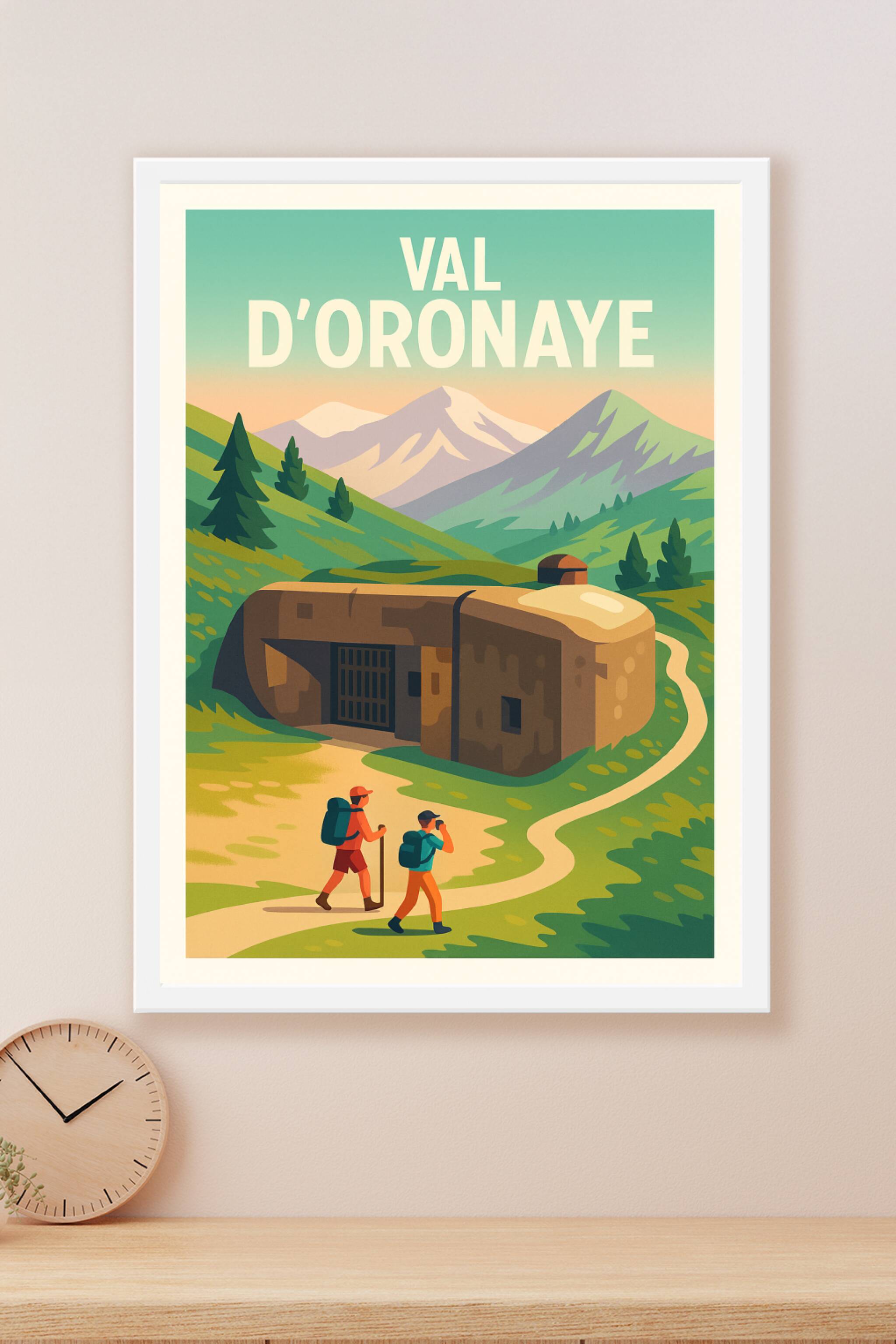 Découvrez la beauté sauvage et le charme historique du Val d'Oronaye avec cette affiche illustrée dans un style vintage moderne. Représentant des r...