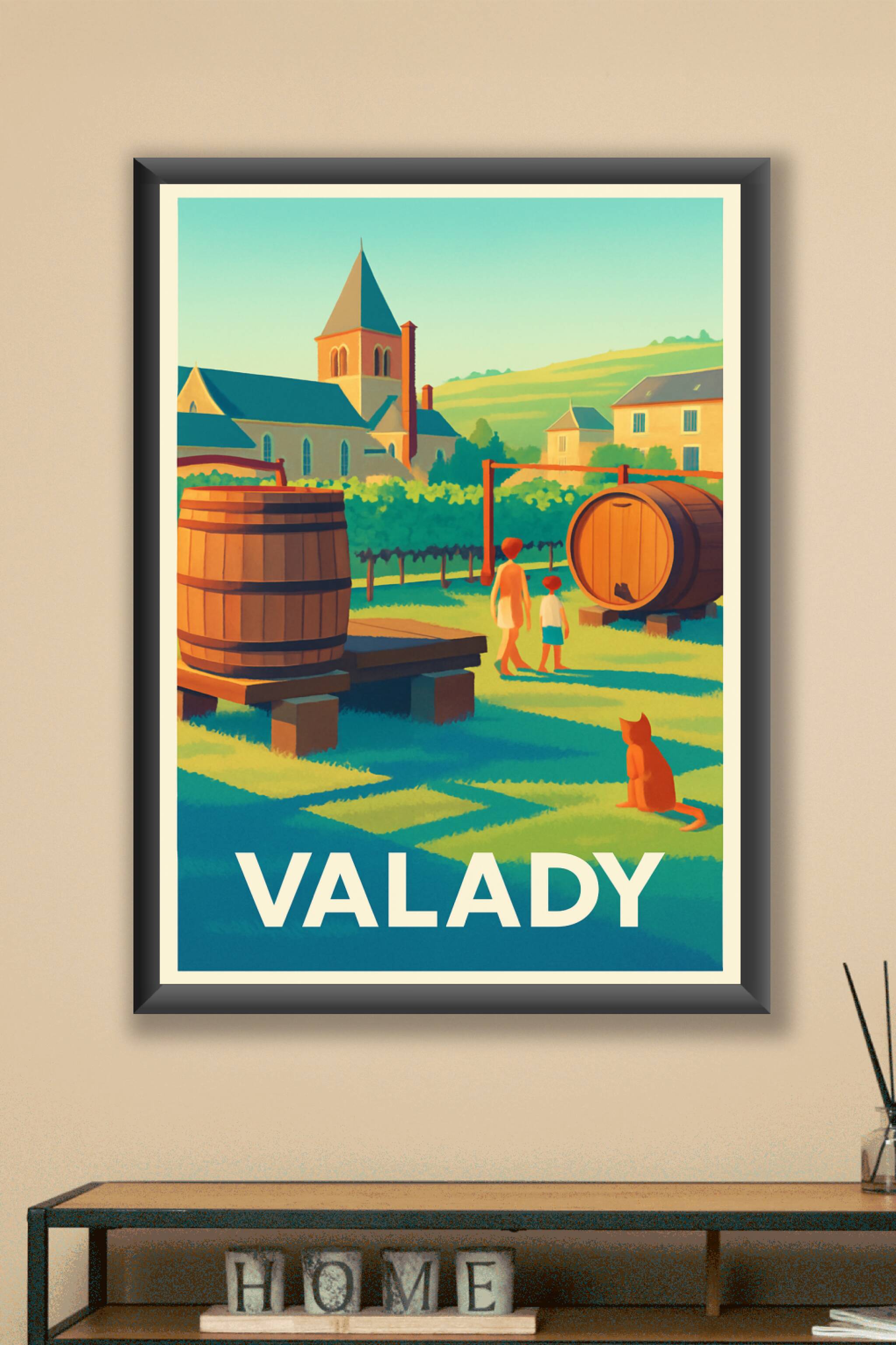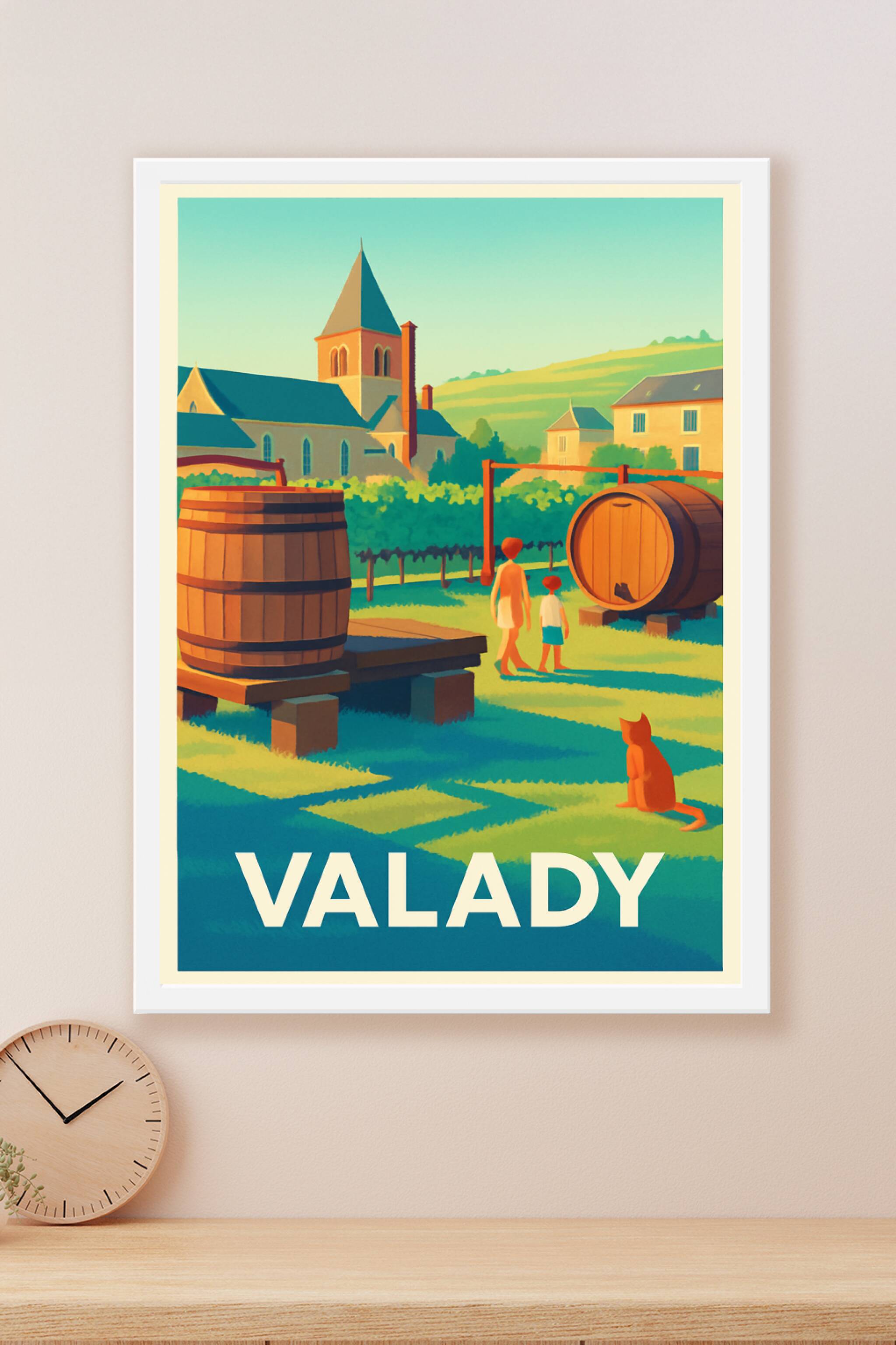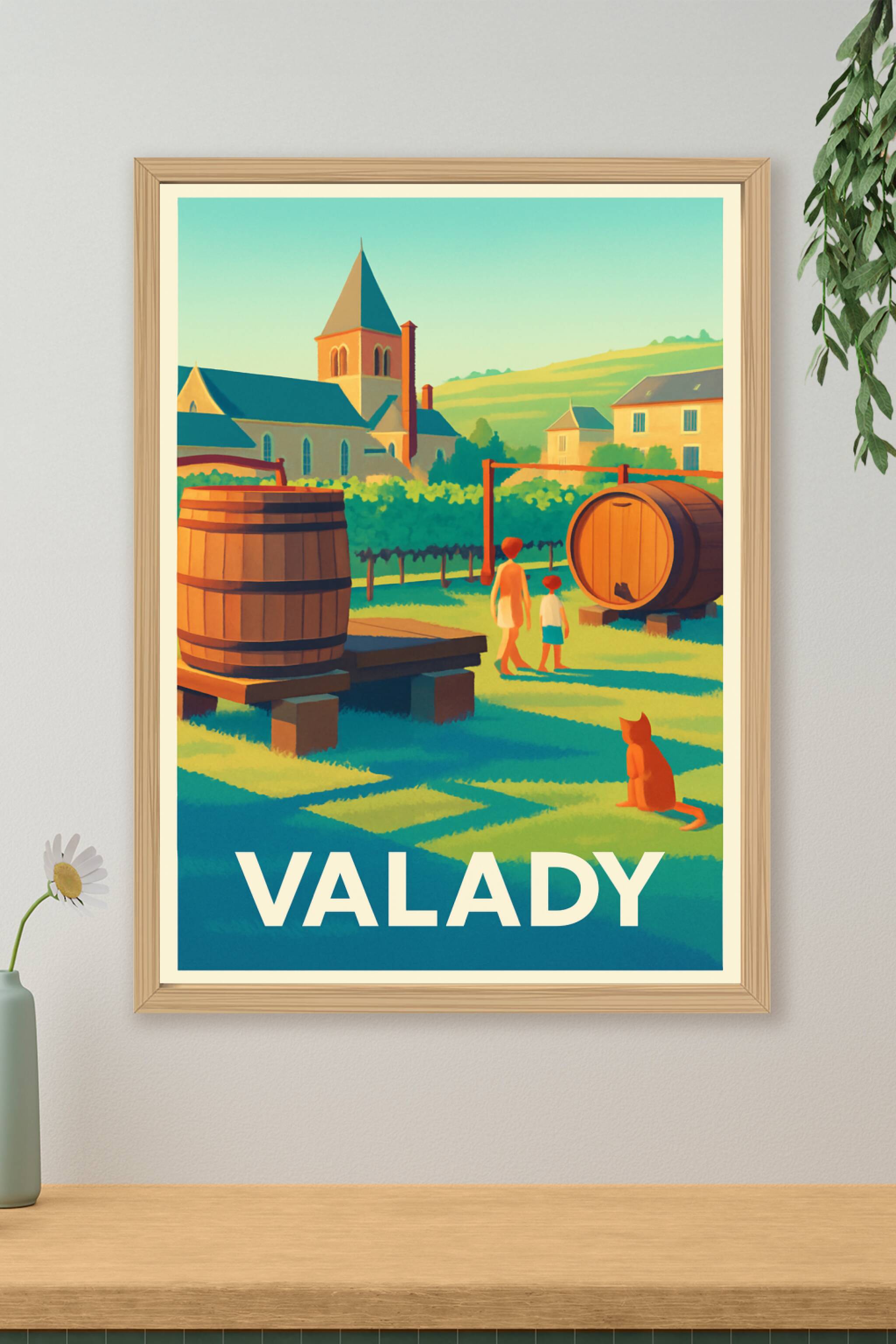 Découvrez l'ambiance paisible et chaleureuse de Valady avec cette affiche illustrée qui met en scène un paysage viticole enchanteur, baigné de lumi...