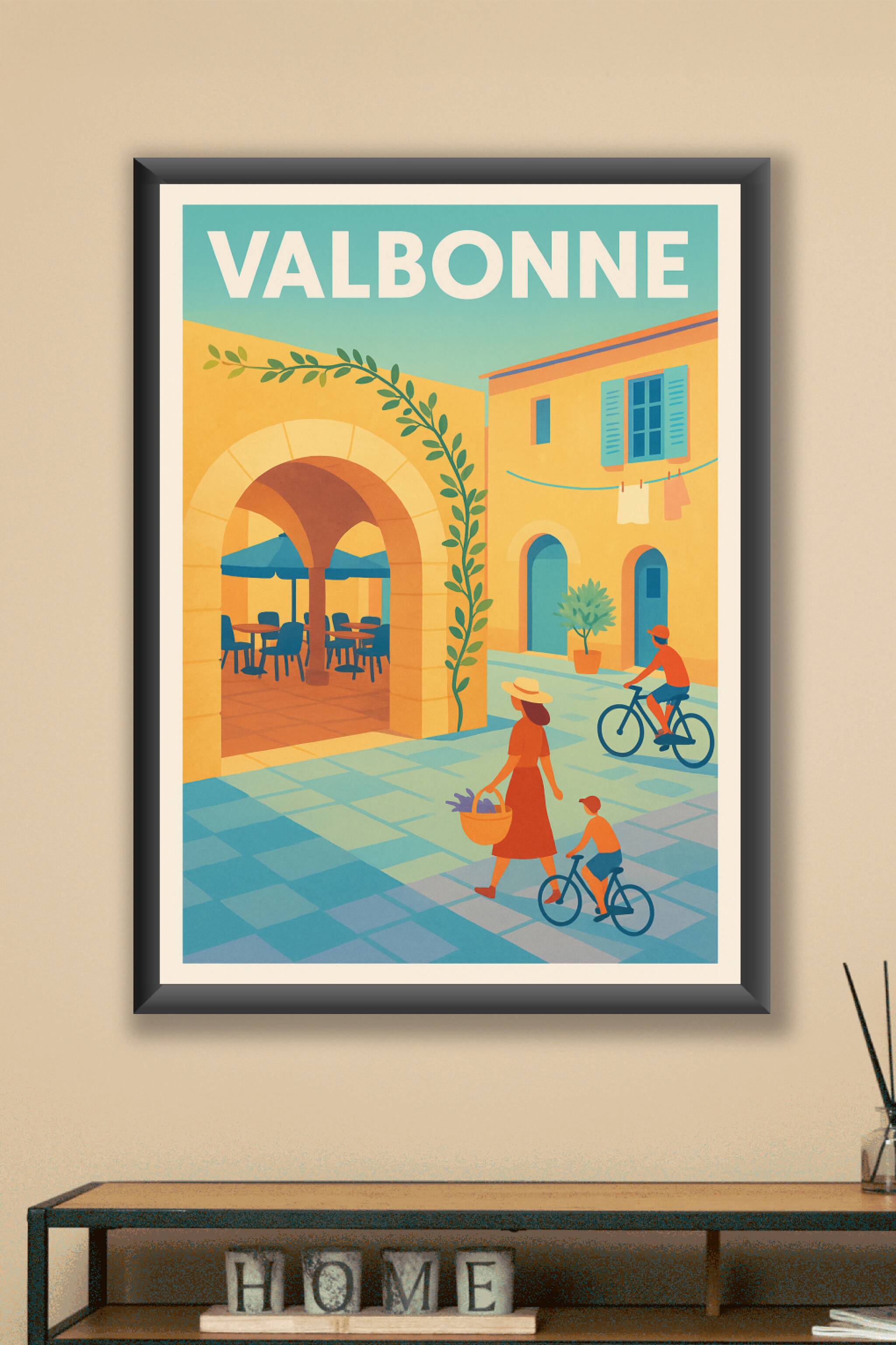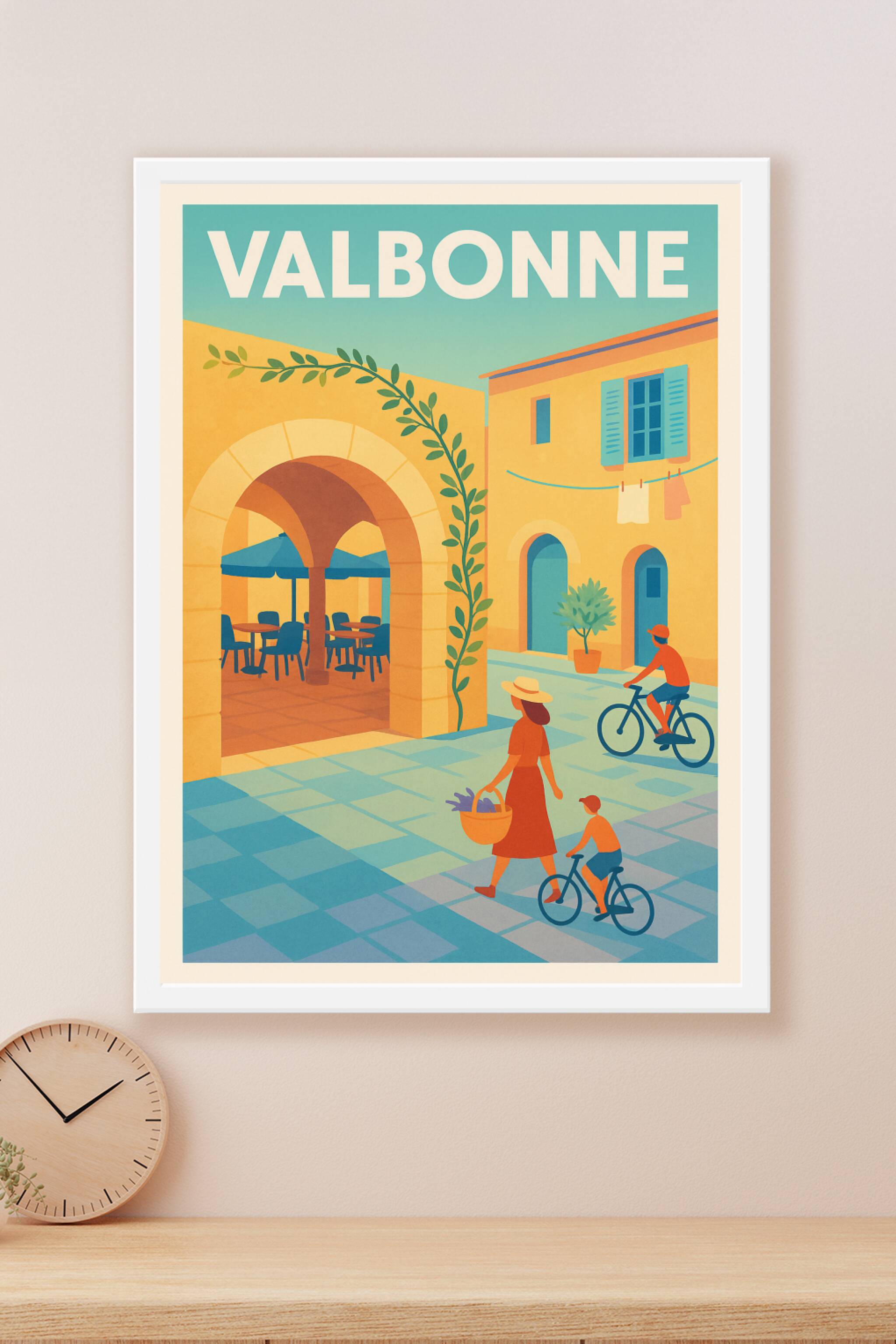 Découvrez l'atmosphère paisible et chaleureuse de Valbonne à travers cette affiche illustrée au style rétro et couleurs douces. Le poster capture l...