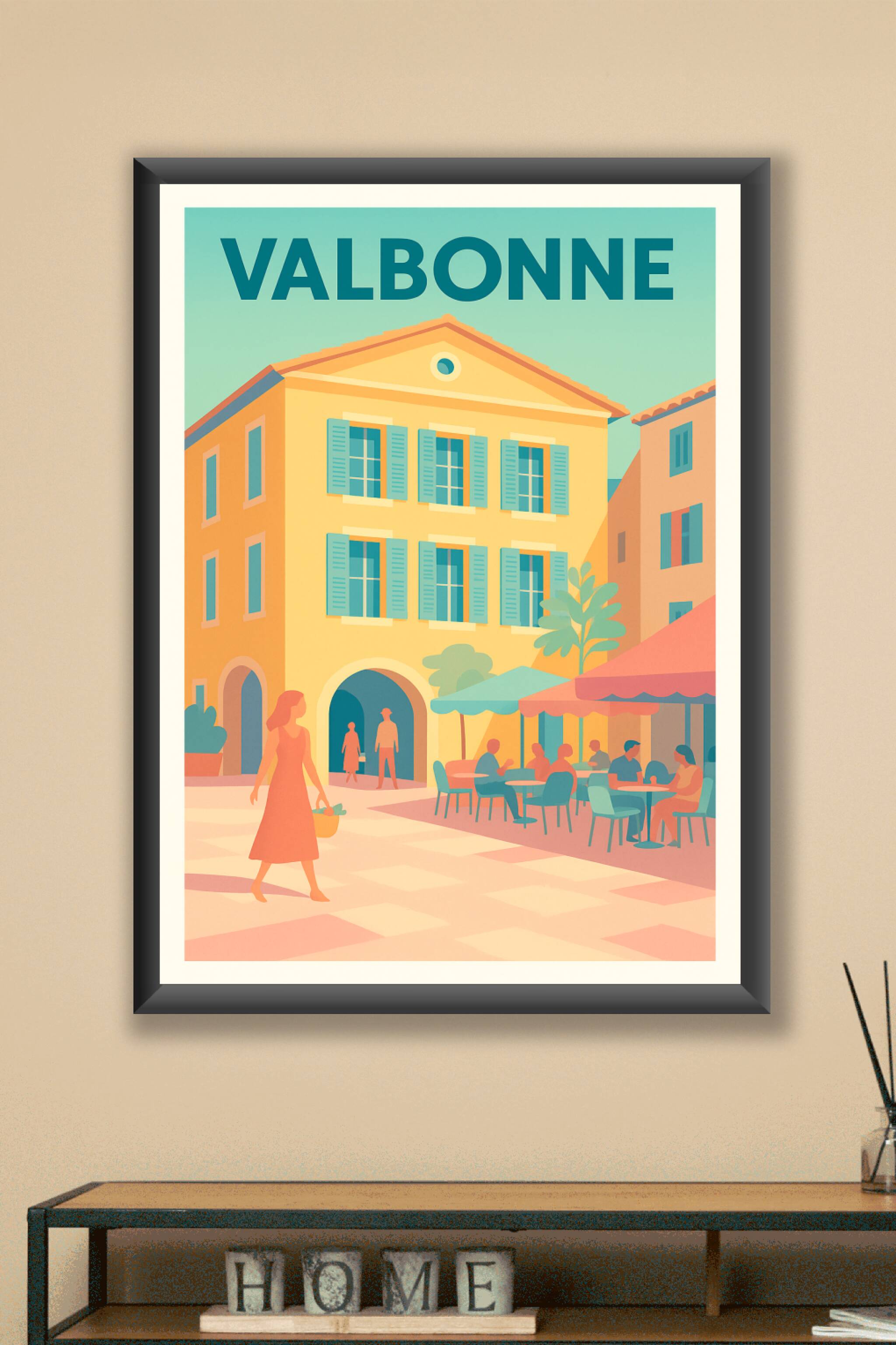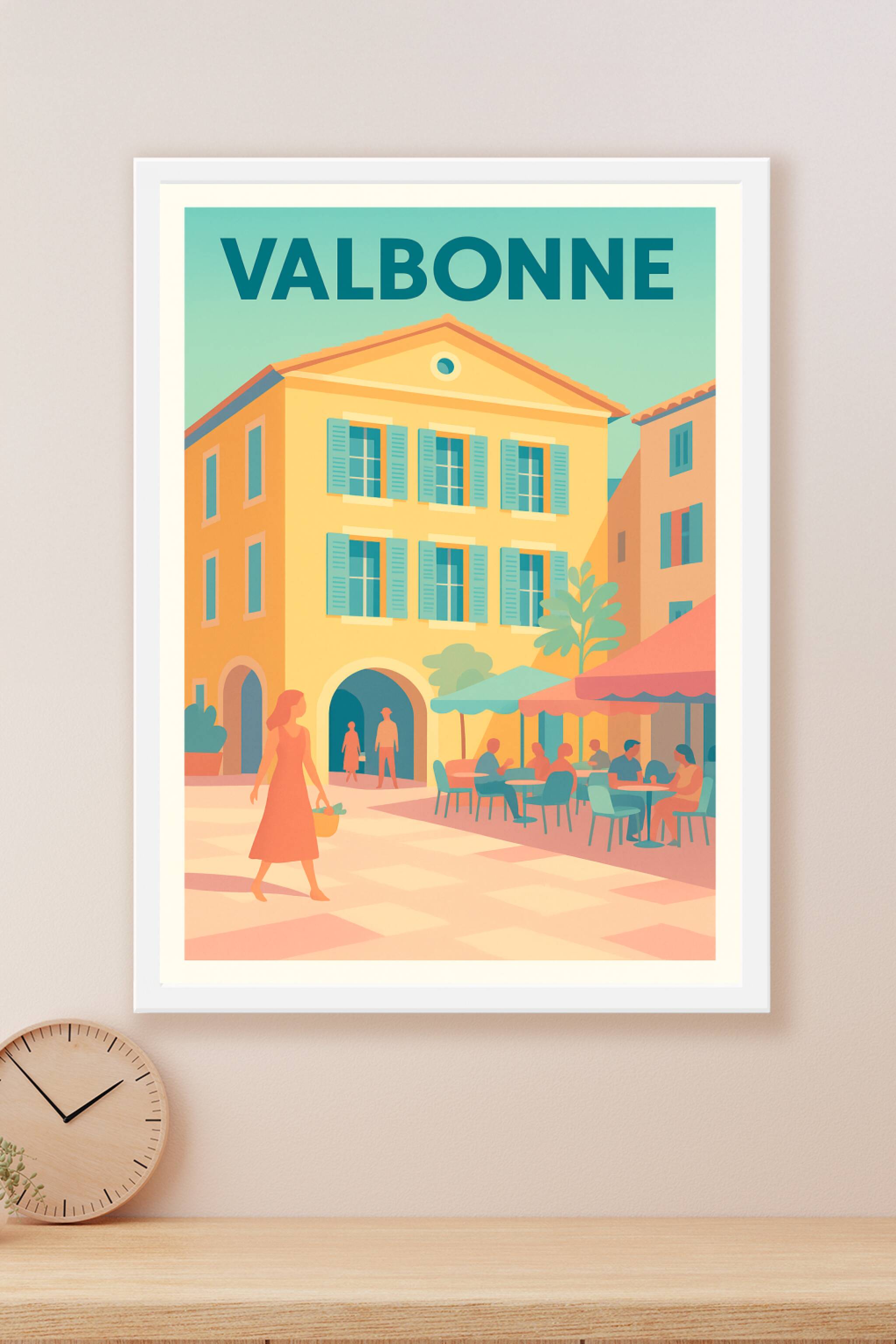 Découvrez le charme chaleureux de Valbonne avec cette affiche illustrée aux couleurs douces et apaisantes, représentant une scène de vie typique su...
