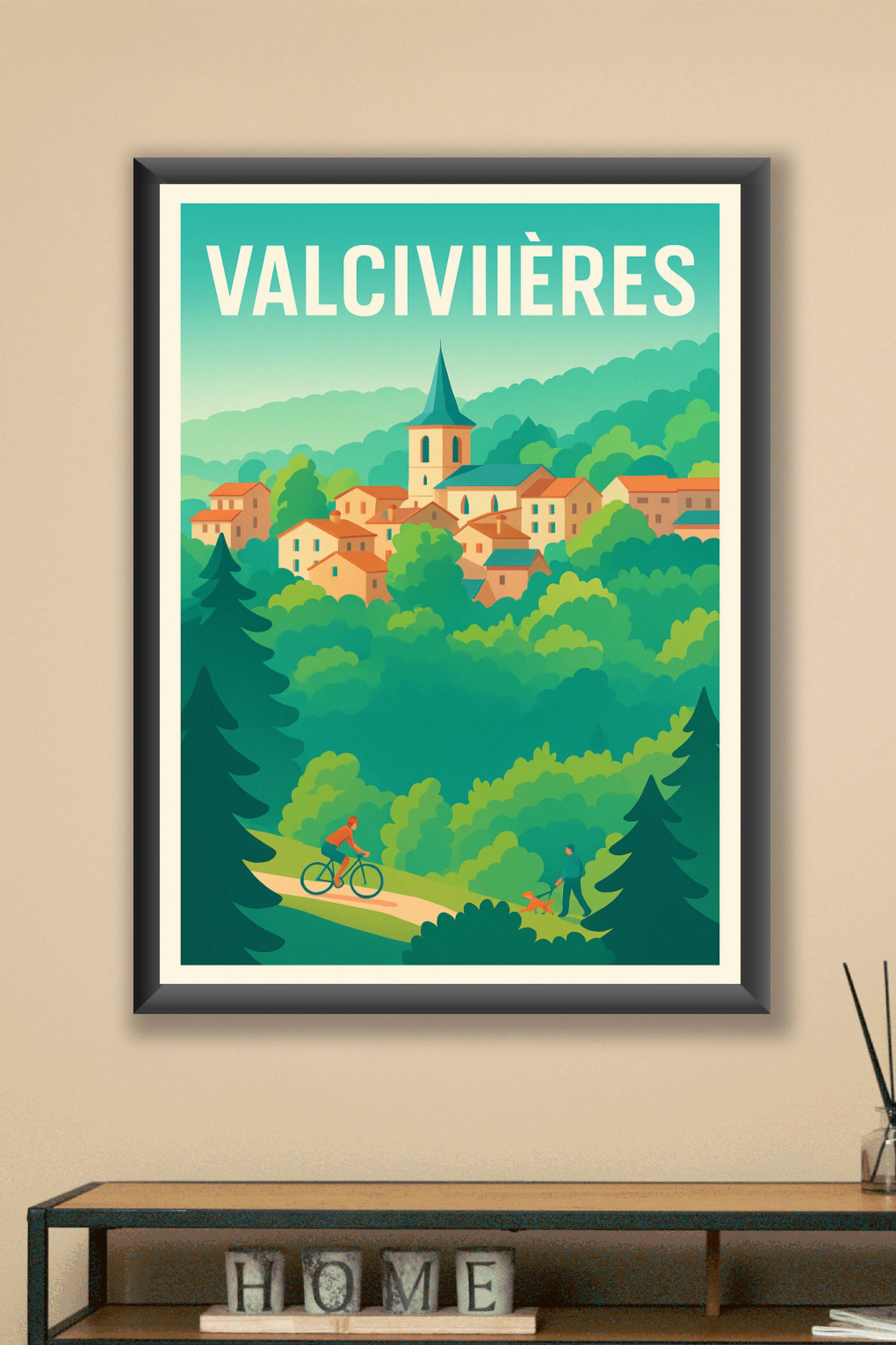 Découvrez la douce harmonie de la campagne auvergnate avec cette affiche illustrée représentant le charmant village de Valcivières, niché au milieu...